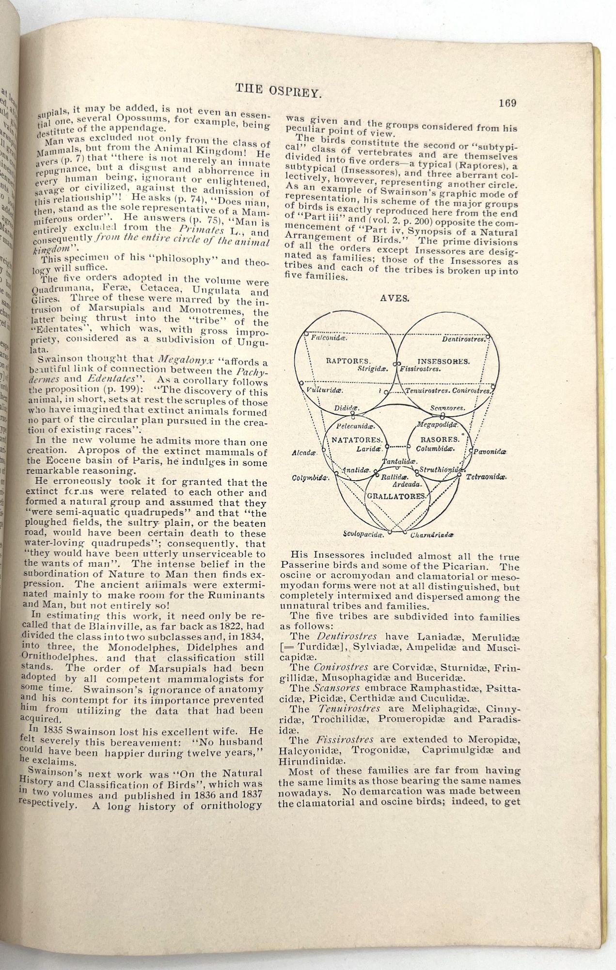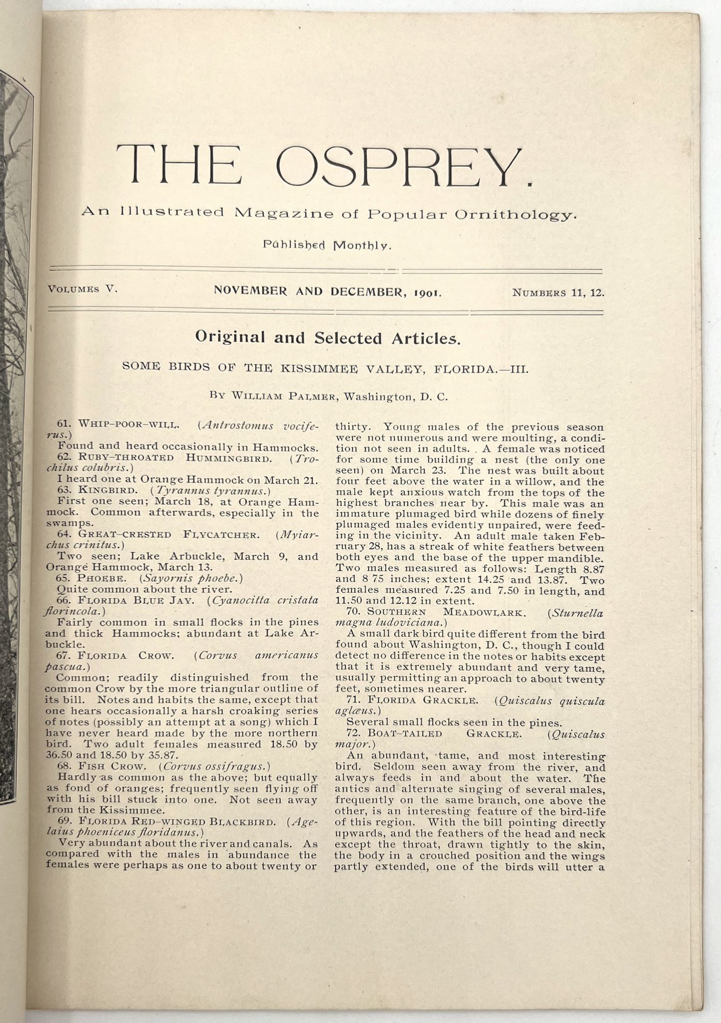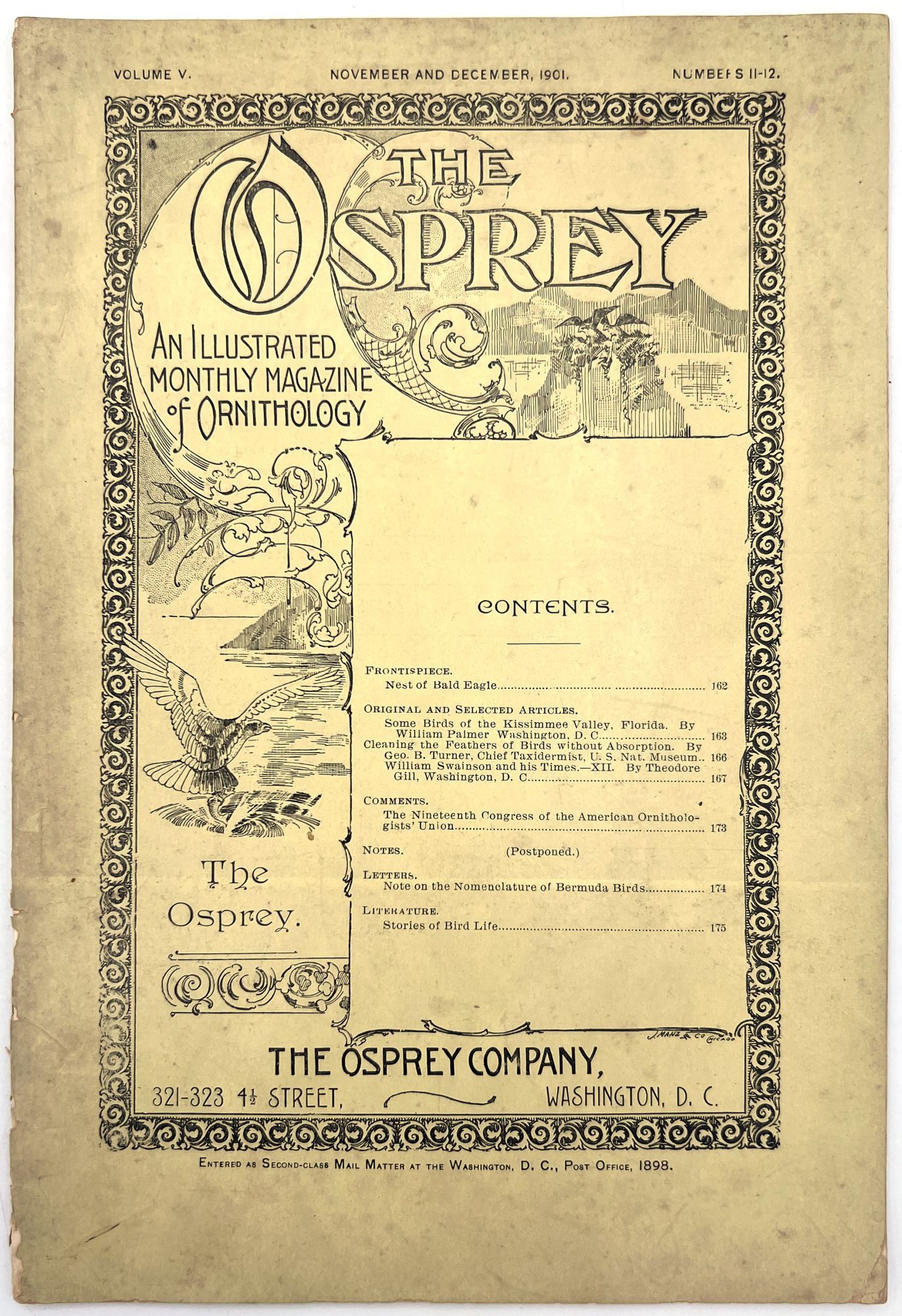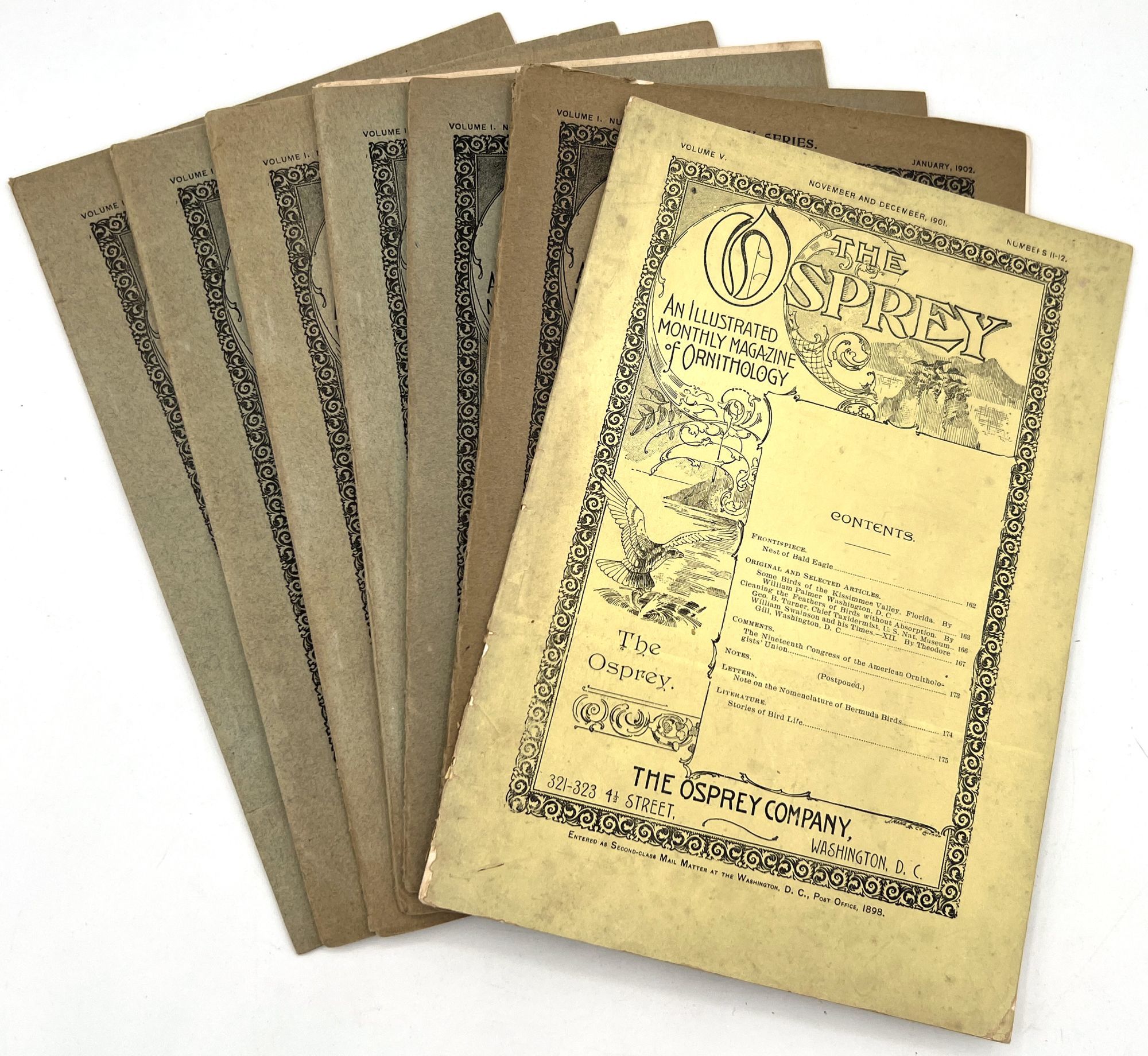 Washington, D.C.: The Osprey Company, 1902. Very good. Toning, dust soiling, a couple short tears or wear to extremities.. A partial run of The Osprey, an "Illustrated Monthly Magazine of Birds & Nature" for ornithologists and nature enthusiasts. This set includes Vol. V, Nos. 11-2 (Nov.-Dec. 1901) of the original series, and Vol. I, Nos. 1-6 (Jan.-Jun 1902) of the "New Series". First issued in 1896. The present seven (7) issues include articles on conservation, taxidermy, and feature articles on ornithologists and bird species ranging from the California Jay to the Northern Parula Warbler. Each issue measures approx. 10.5" by 7", is approx. 20 pp. illus., and is stapled in the original illustrated wrps with image of water fowl and title of the serial in stylized typography.
