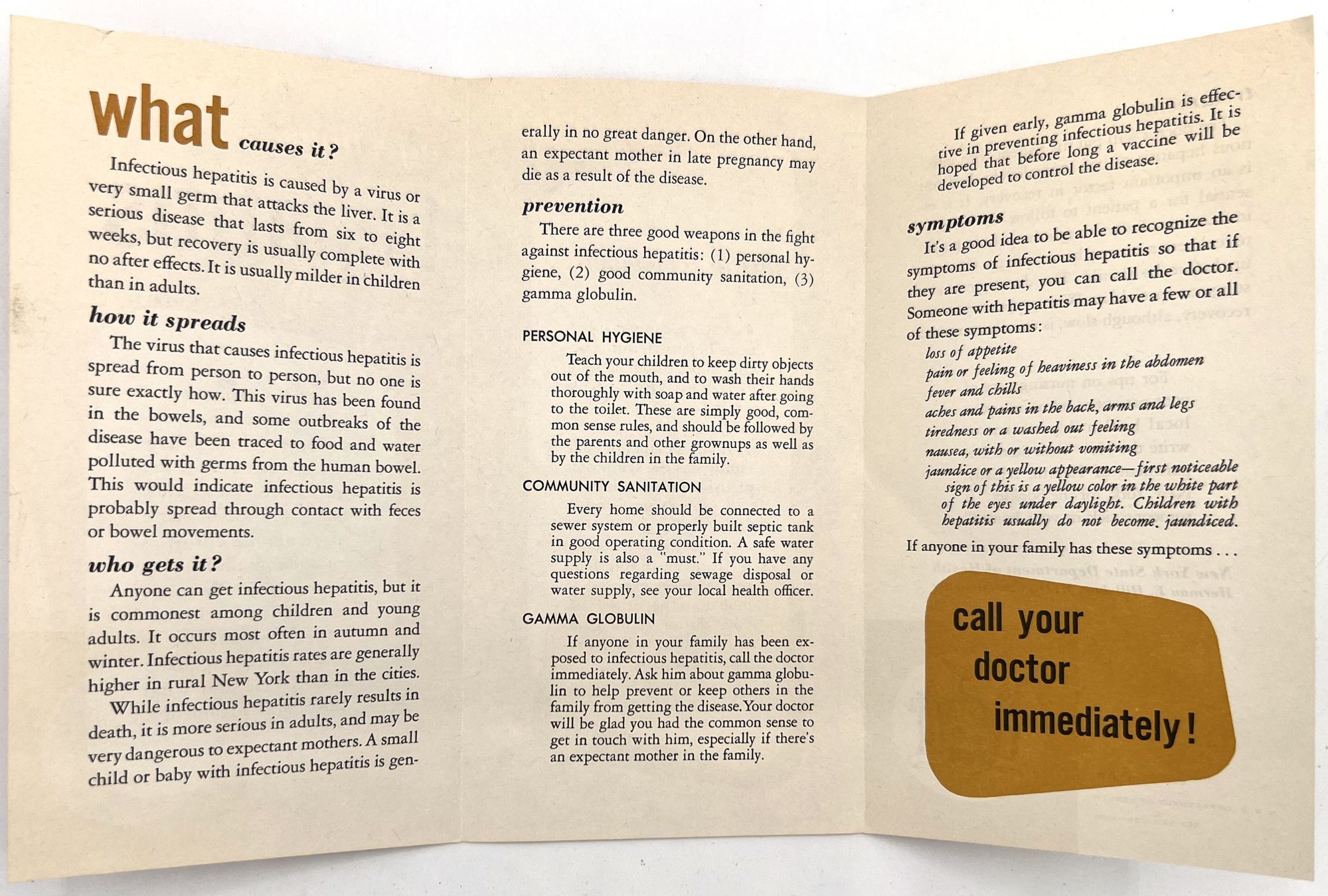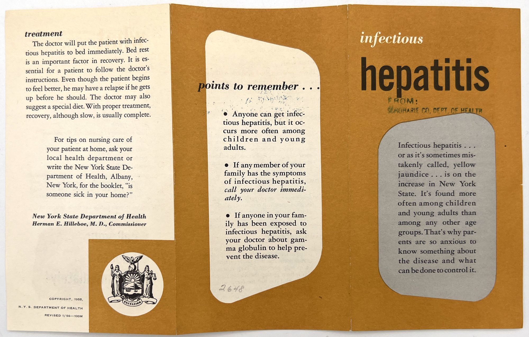 [Albany, New York]: N.Y. State Dept. of Health, 1955. Very good to near-fine.. An informational booklet on hepatitis, issued to families in 1955 by the N.Y. State Dept. of Health. Includes information on what the virus is, how it spreads, who is vulnerable to it, prevention, symptoms and treatment. Emphasizes the importance of early medical intervention. Includes three main takeaway points on the back (anyone can get infected, call your doctor immediately, and ask your doctor about prevention). Measures approx. 6.5" by 3.5" folded, ink stamp of distributing body to front (Schoharie County Health Dept.).