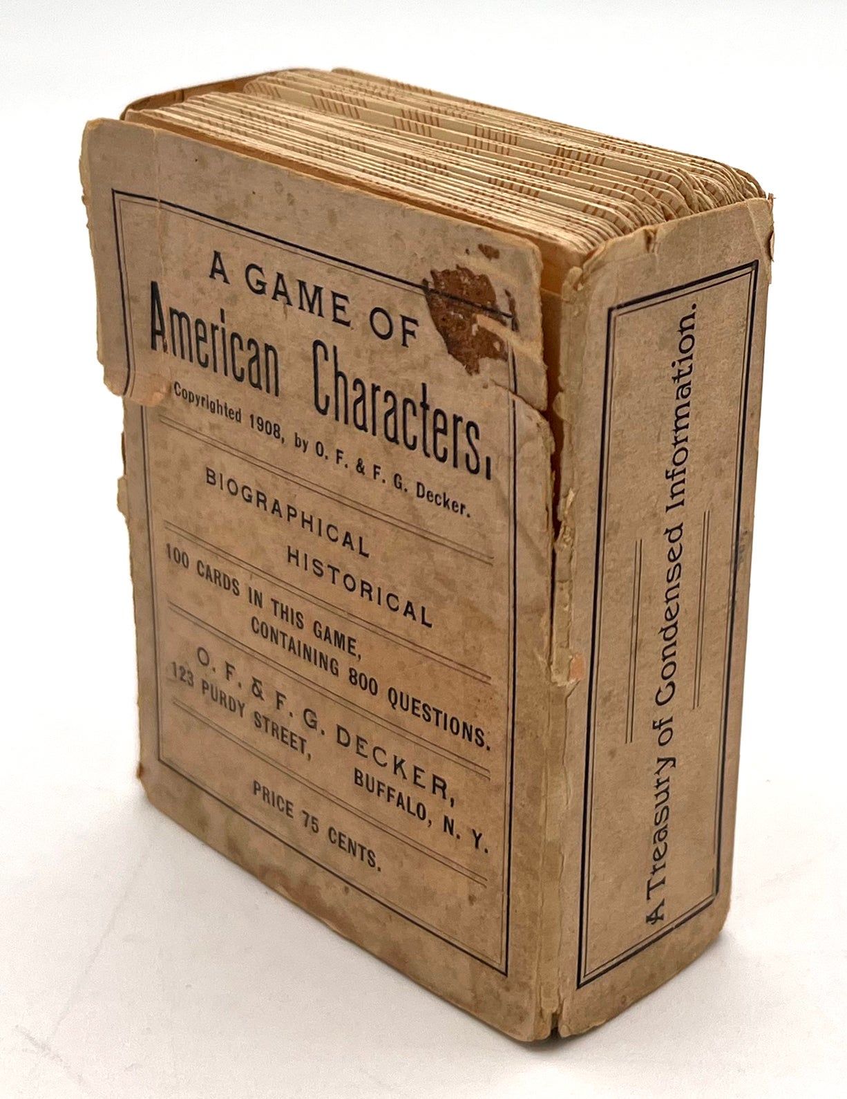 Buffalo, New York: O.F. & F.G. Decker, 1908. Fair. Dust soiling, spotting, box defective and worn, including two loose flaps and one missing. Cards toned but in nice condition.. A fascinating look into historiography and how famous figures in American history were viewed c.1908, via a trivia card game. To play, one person asks a question off a random card; the answer is the name at the top of the card. Complete (all 100 cards present) and in the original box with instructions sheet. This game serves as an interesting example of how patriotism and nationalism is taught through play and learning. The information card on top of the deck reads: "This game consists of one hundred cards each containing a brief biography of some conspicuous personage in American history or literature. Presidents, statesmen, soldiers, inventors, writers and benefactors are here given a place. Women are recognized who are known as leaders in science or art, in the White House, as nurse on the battle field, or doing pioneer work for the betterment of the race. The chief events in the life and achievements of each character are called out by terse and pointed questions". The card goes on to highlight the game's use in the classroom, as well as the home: "Patriotism demands that every American should become familiar with the names of those who have made our nation and civilization what they are". The usual suspects are present (e.g. George Washington, William T. Sherman, Ralph Waldo Emerson), but there are some unexpected inclusions such as Simon Bolivar, Dom Pedro II, Antonio López de Santa Anna (presumably "America" in this game extends to Mexico and South America as well). As might be expected for a game made at this time, people of color and women are far outnumbered. Funnily, the last 6 cards are all women after a run of almost exclusively men, as if the game manufacturer thought to themselves, "I better add some gals before we finish the set!" Each card measures approx. 3.5" by 2.75", and the box measures approx. 3.5" by 3" by 1.25". AGPI lists one version, from 1890 (AGPI # · G-9259).