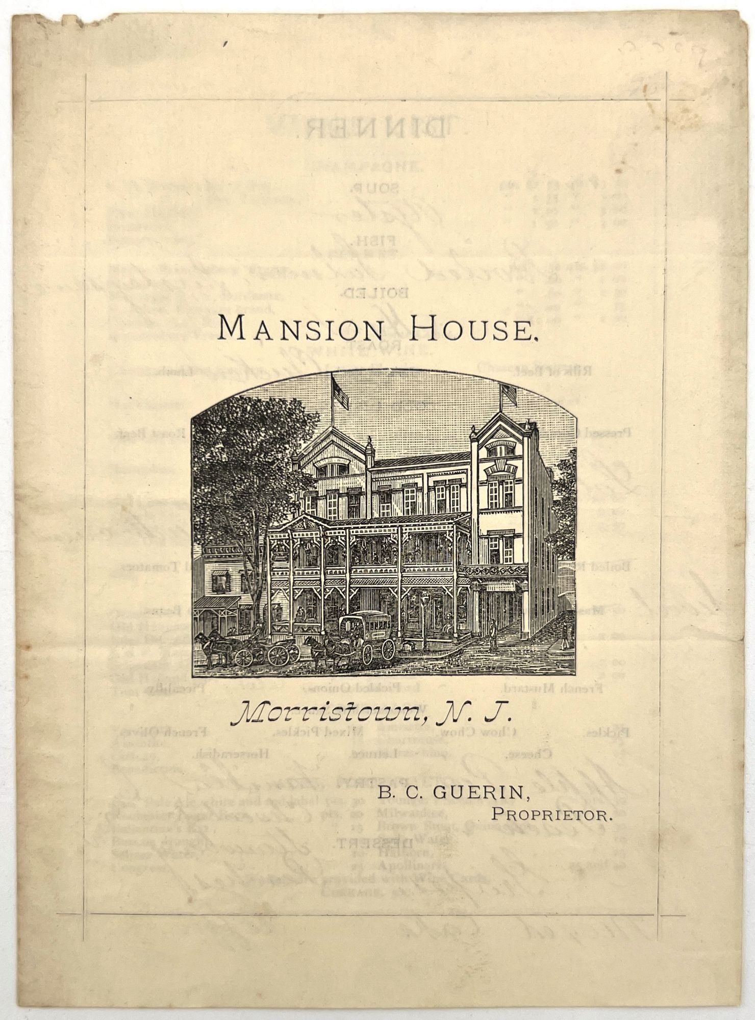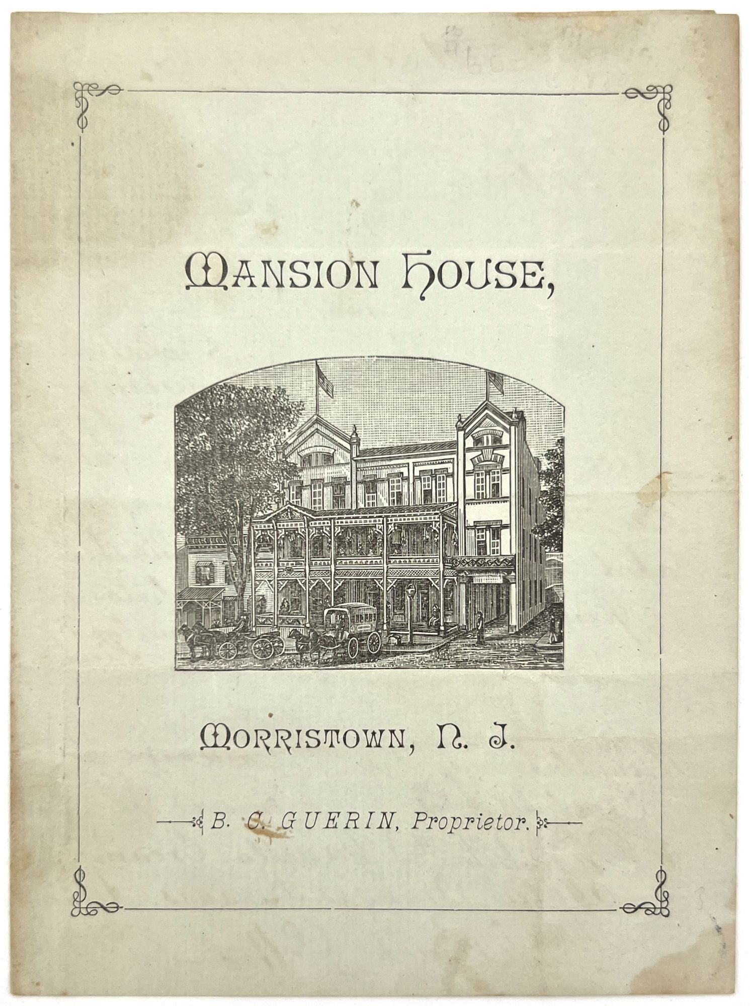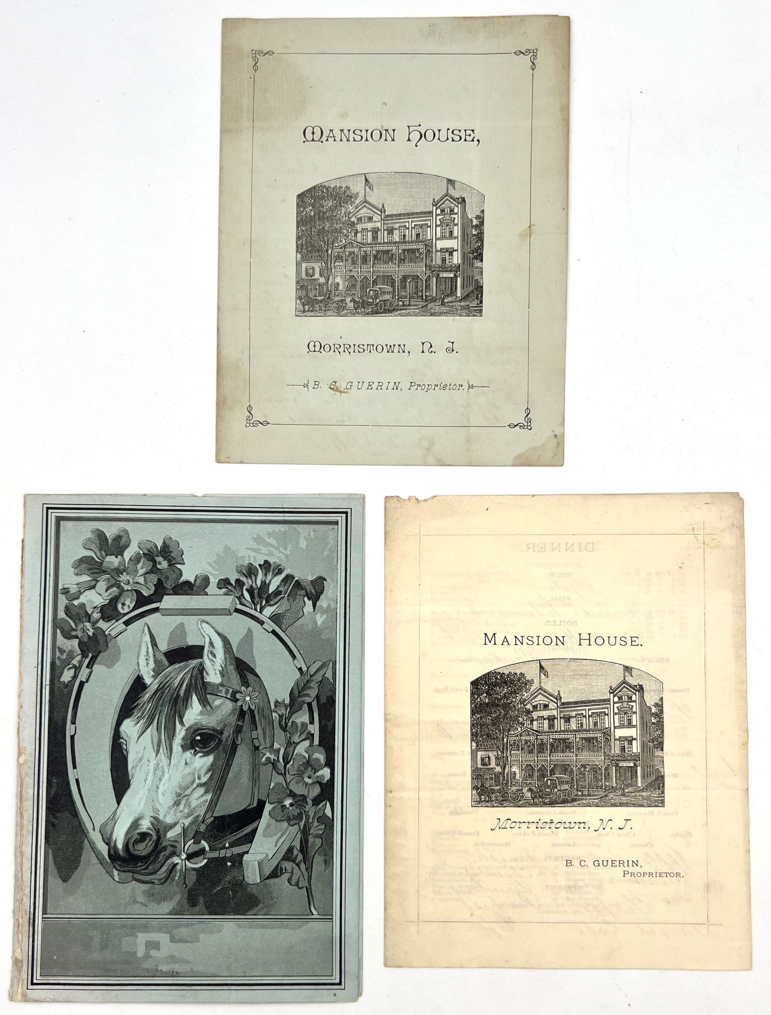 Morristown, New Jersey: Mansion House, 1880. Very good. Dust soiling, creasing.. A set of three (3) printed menus with extensive handwritten additions and corrections for the hotel Mansion House of Morristown, New Jersey, dating from the 1880s. Located on the bustling Washington Street, is served as both a luxury hotel for well-to-do tourists and a stylish meeting place for locals. Luxuries offered to those staying at the hotel included "hardwood floors, steam heat, gas-powered lighting and electrical bells, which were supplemented by multiple dining rooms, common areas and a two-story piazza" (morriscountyhistory.org). The present menus serve as the perfect emblem of such luxury: each features an extensive wine list and fine dishes ranging from mock turtle soup to lobster salad, spring lamb with mint sauce, and rice croquettes. Each is printed on colored paper; two have images of the hotel on the front, and the final features a stylized illustration of a horse and horseshoe. A guest has commented in black ink on one of the menus ("Splendid dinner"). Each is a printed bifolium measuring approx. 6.25" by 4.5