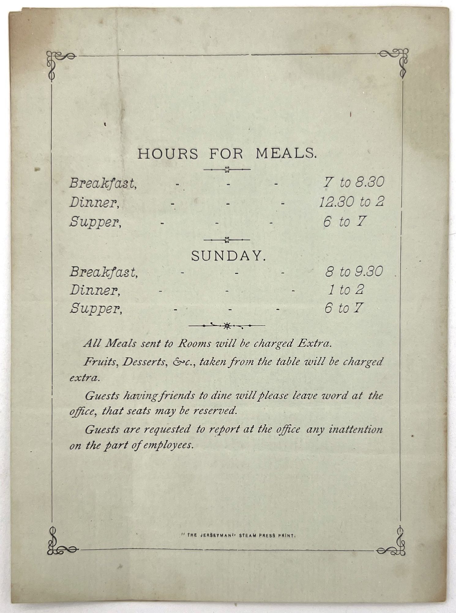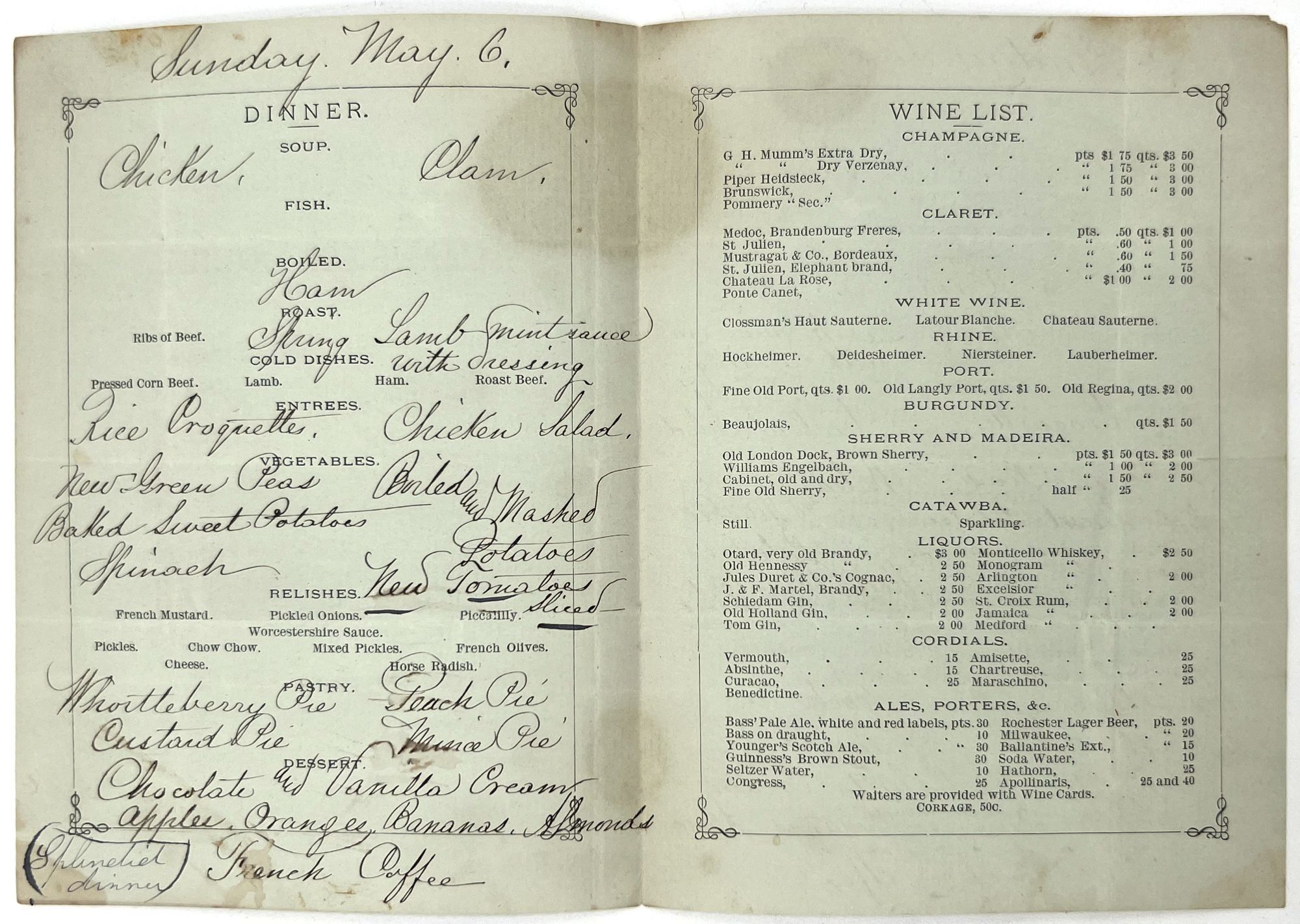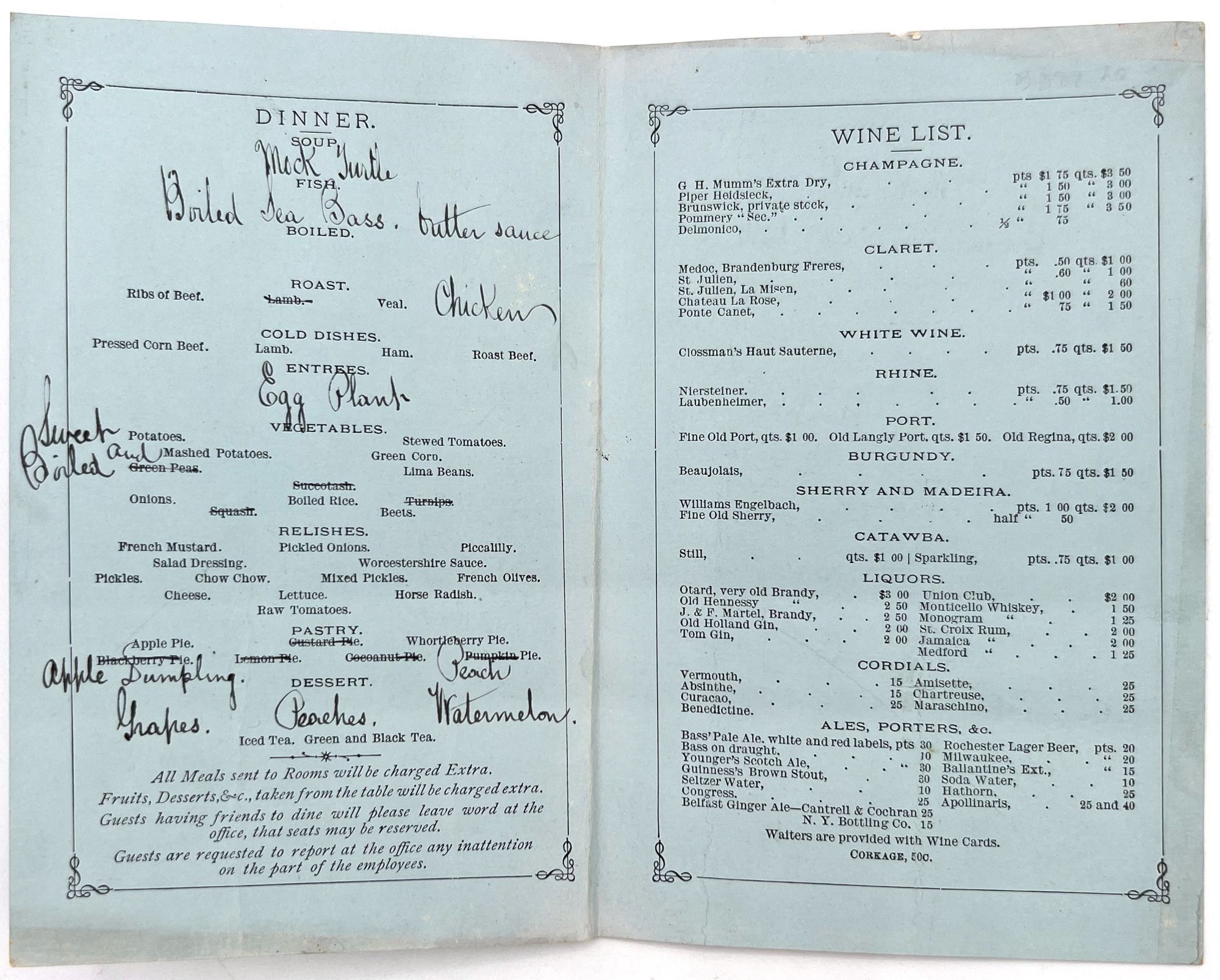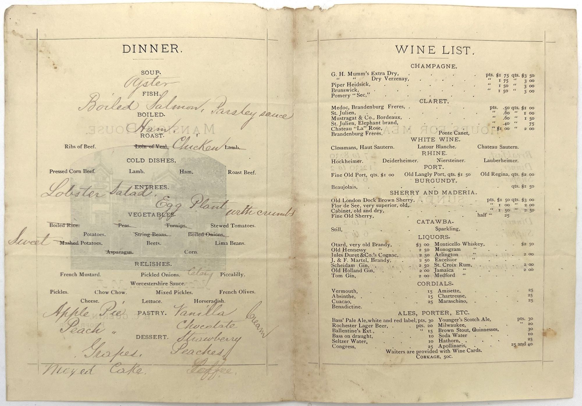 Morristown, New Jersey: Mansion House, 1880. Very good. Dust soiling, creasing.. A set of three (3) printed menus with extensive handwritten additions and corrections for the hotel Mansion House of Morristown, New Jersey, dating from the 1880s. Located on the bustling Washington Street, is served as both a luxury hotel for well-to-do tourists and a stylish meeting place for locals. Luxuries offered to those staying at the hotel included "hardwood floors, steam heat, gas-powered lighting and electrical bells, which were supplemented by multiple dining rooms, common areas and a two-story piazza" (morriscountyhistory.org). The present menus serve as the perfect emblem of such luxury: each features an extensive wine list and fine dishes ranging from mock turtle soup to lobster salad, spring lamb with mint sauce, and rice croquettes. Each is printed on colored paper; two have images of the hotel on the front, and the final features a stylized illustration of a horse and horseshoe. A guest has commented in black ink on one of the menus ("Splendid dinner"). Each is a printed bifolium measuring approx. 6.25" by 4.5