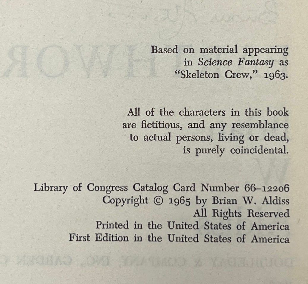 Garden City: Doubleday & Company, Inc, 1966. First Edition. Hardcover. Near Fine/Near Fine. Inscribed by Aldiss on the title page. Near Fine in a Near Fine jacket, unclipped ($3.50), lighlty toned, soiled at the back panel. Grey cloth with black ink lettering on the spine. Firmly bound with a forward lean, bookplate on the front endpaper, clean otherwise. Aldiss's science fiction novel about an overpopulated and starving world on the brink of global war.