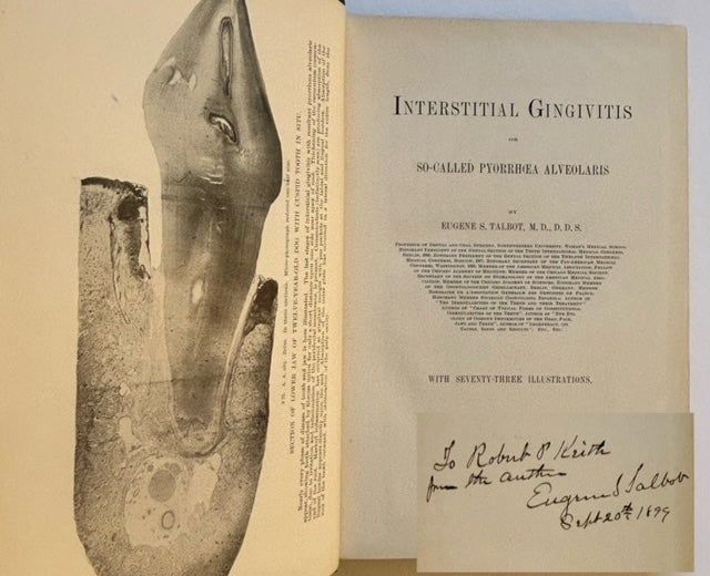 Philadelphia: The S.S. White Dental Manufacturing Co, 1899. Cloth. Very Good. INSCRIBED BY THE AUTHOR EUGENE TALBOT on the front free endpaper. A solid copy to boot of the 1899 1st edition. Tight and VG in its dark-green cloth, with 2 small punctures at the foot of the spine. Quarto, 73 black-and-white illustrations complementing Dr. Talbot's text.