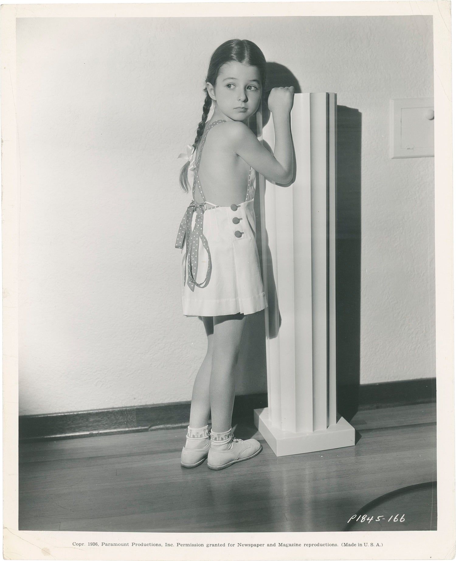 Los Angeles: Paramount Pictures, 1936. Vintage publicity photograph of child actress Virginia Weidler in a polka-dot-lined sundress, circa 1936. Mimeo snipe on the verso promoting Weidler's appearance in the 1936 film "Girl of the Ozarks."