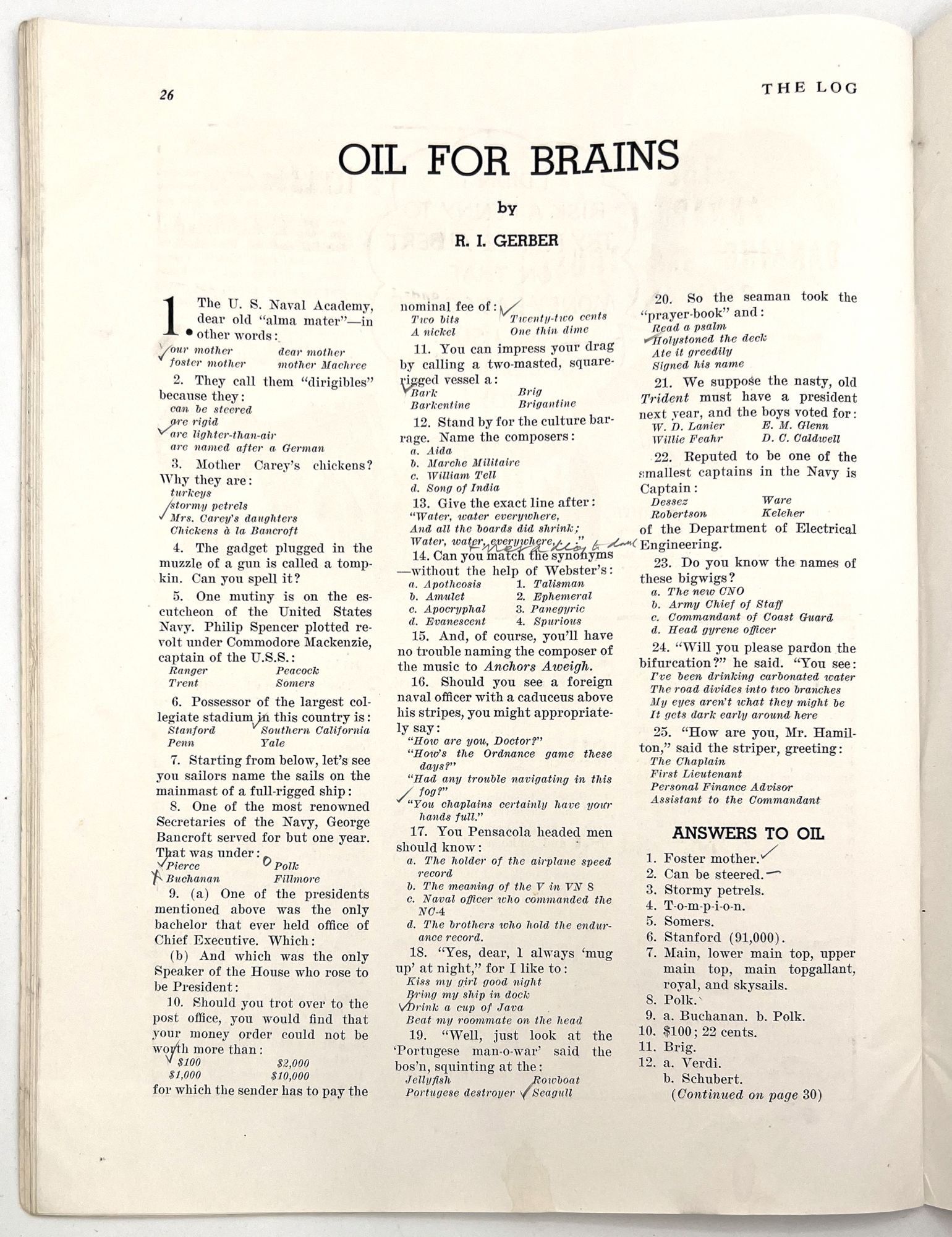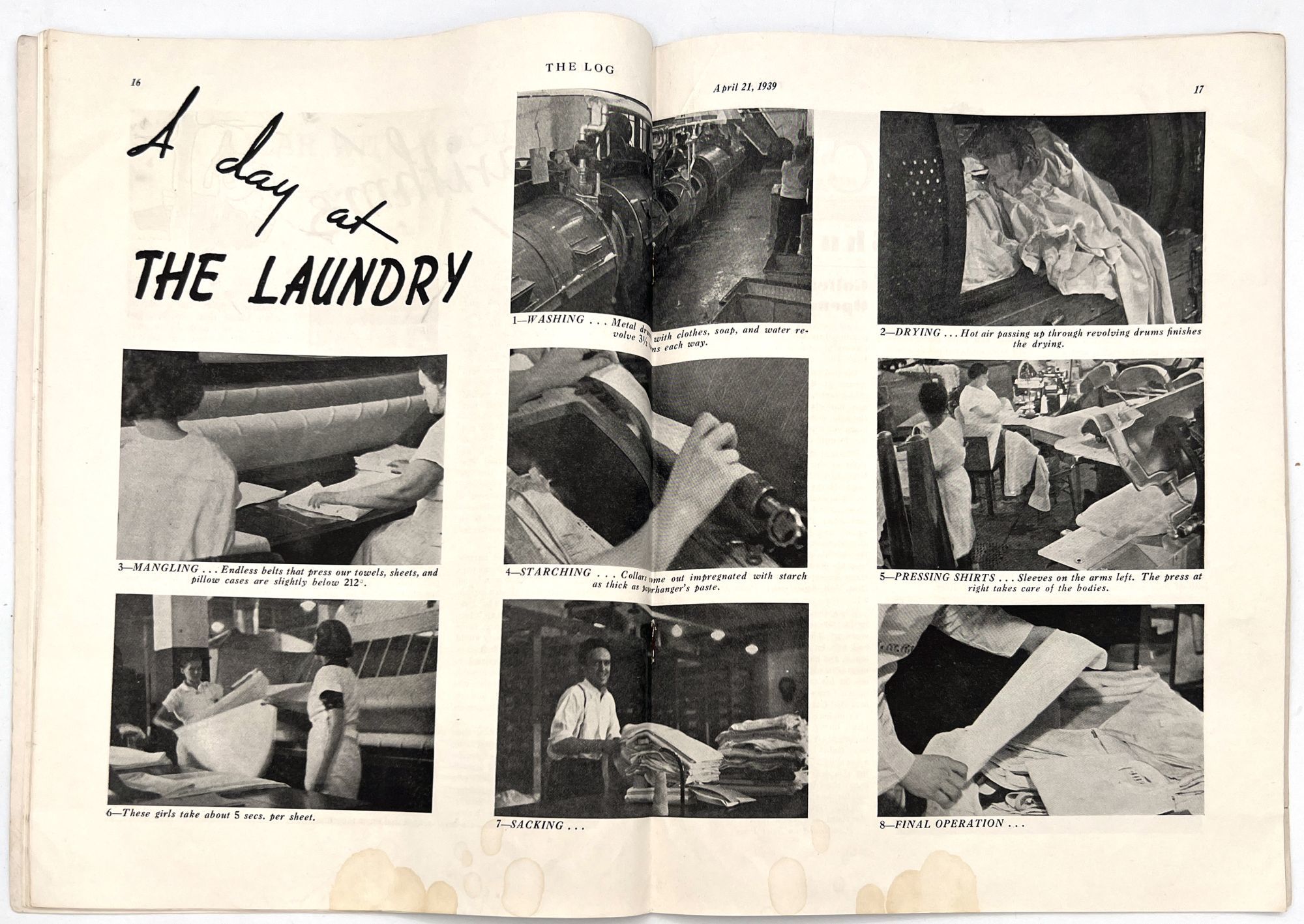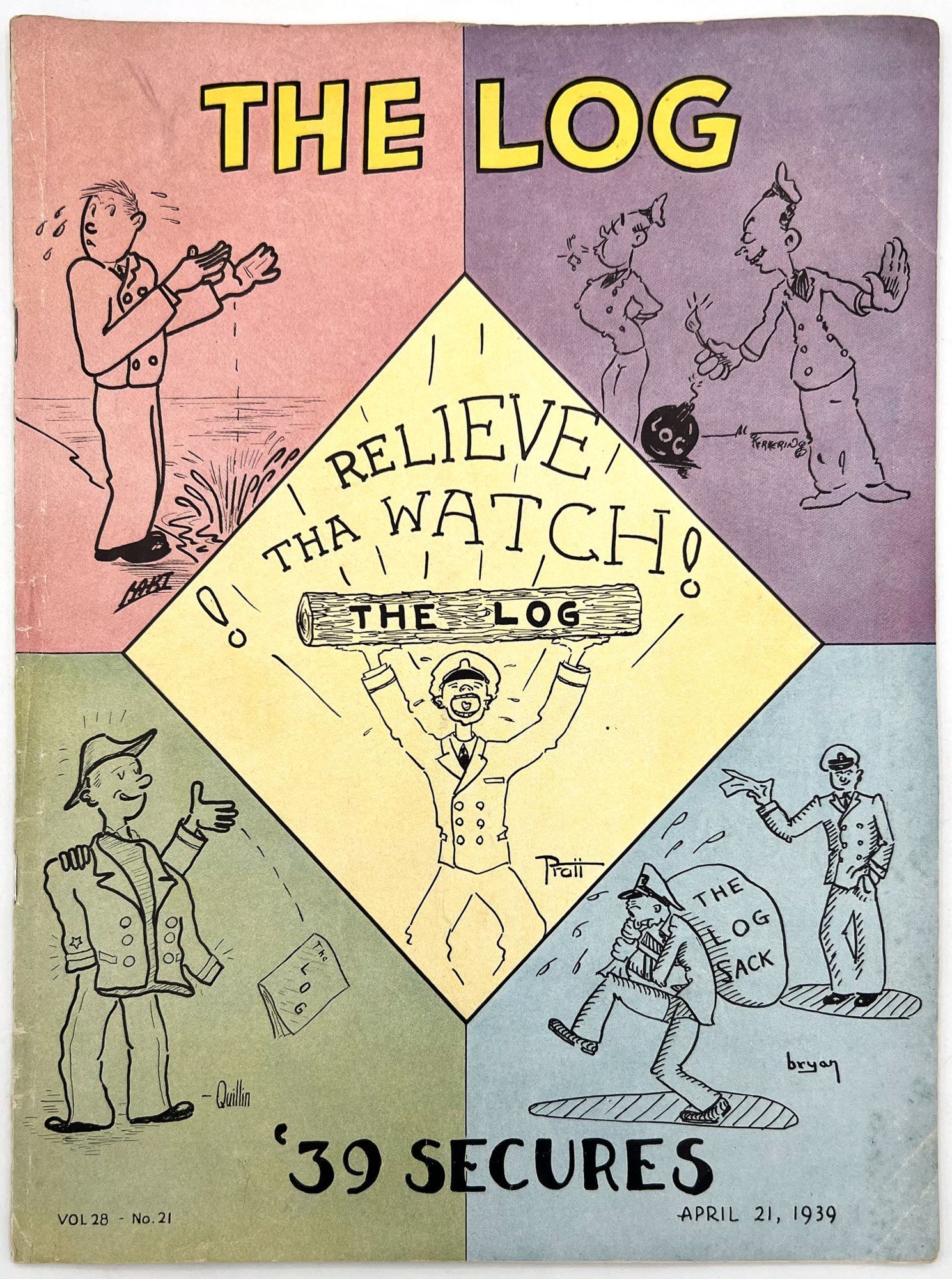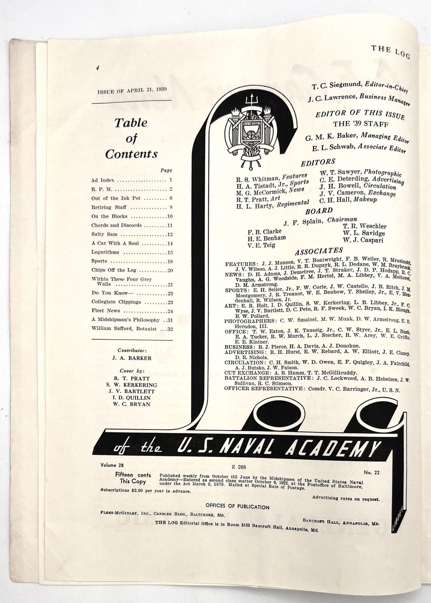 Annapolis, Maryland: U.S. Naval Academy, 1939. Good. Some staining including water staining, toning, dust soiling, creasing, with some minor closed short tears.. Vol. 28, No. 21 of "The Log", a serial published by the U.S. Naval Academy. Rife with humor and camaraderie, this issue features cartoons, silly stories, campus news, and fun facts for the young men to enjoy. Also included in this issue is a two-page spread featuring photos of the massive laundry operation at the Academy ("A Day at the Laundry"), athletic and extracurricular news (the gents put on a production of "The Mikado"), and a multiple choice trivia quiz ("Oil for Brains"). This copy has some minor annotations in pencil. Folio (12" by 9.25"), pp. 32 with in-text illustrations, stapled in original illustrated wrappers.