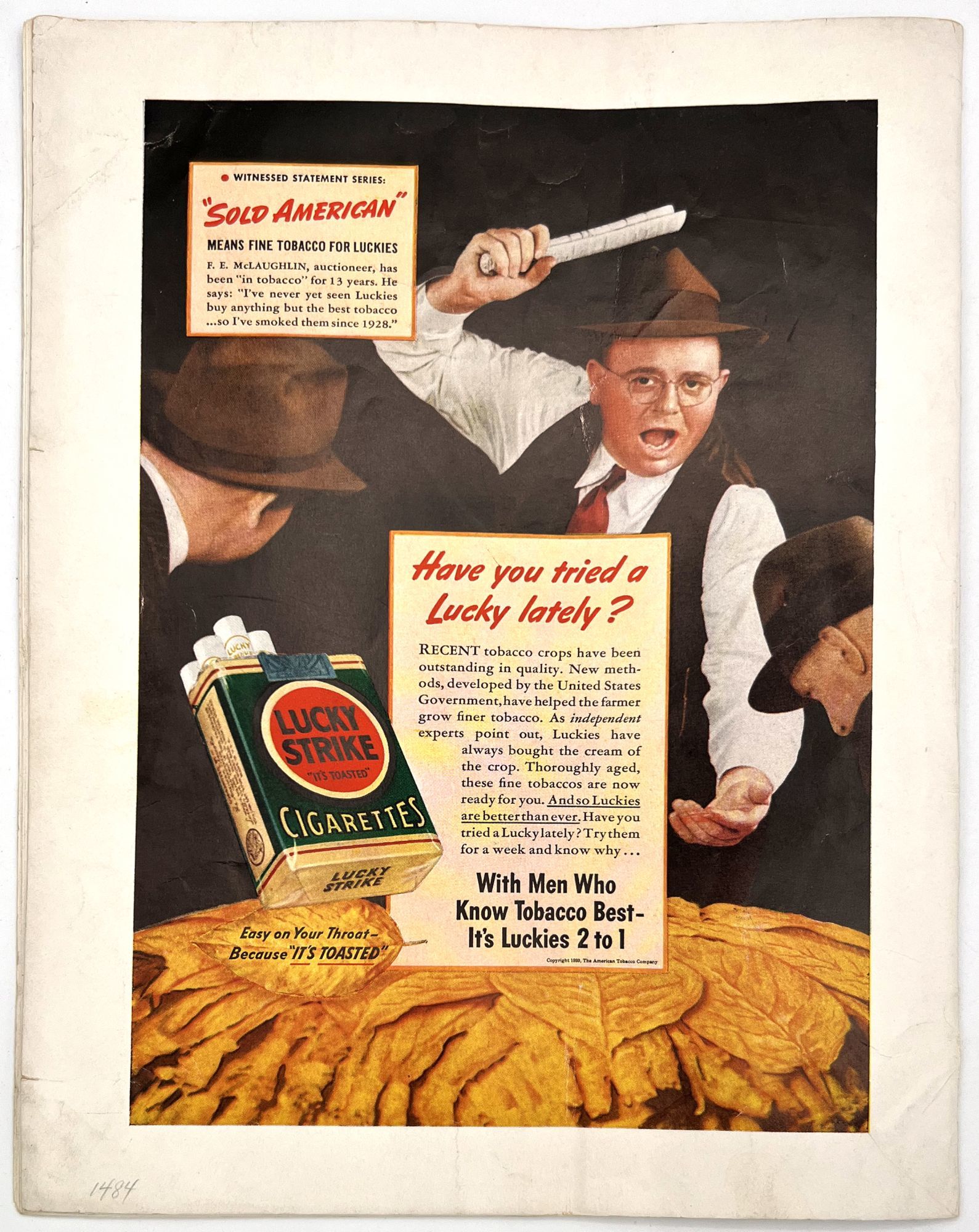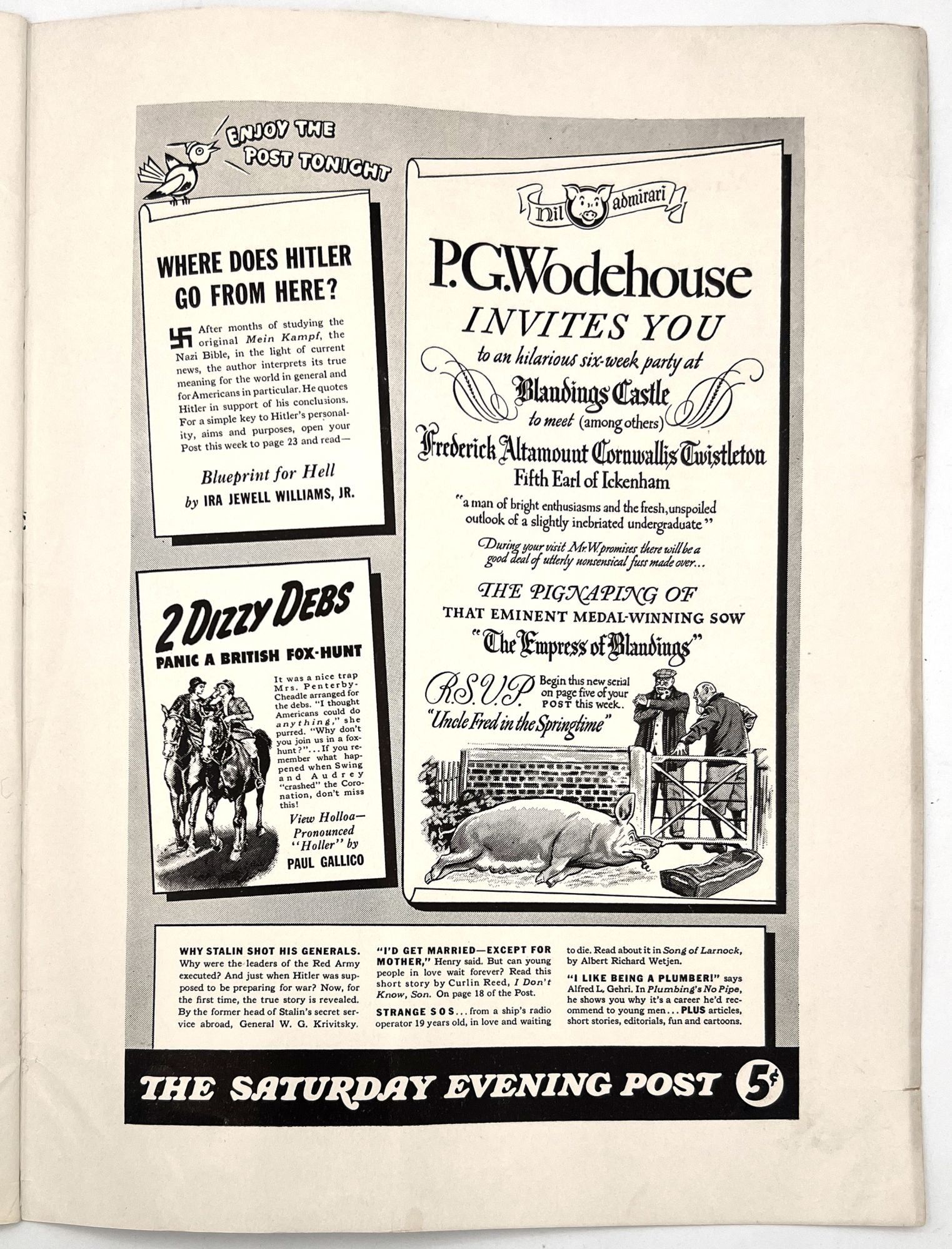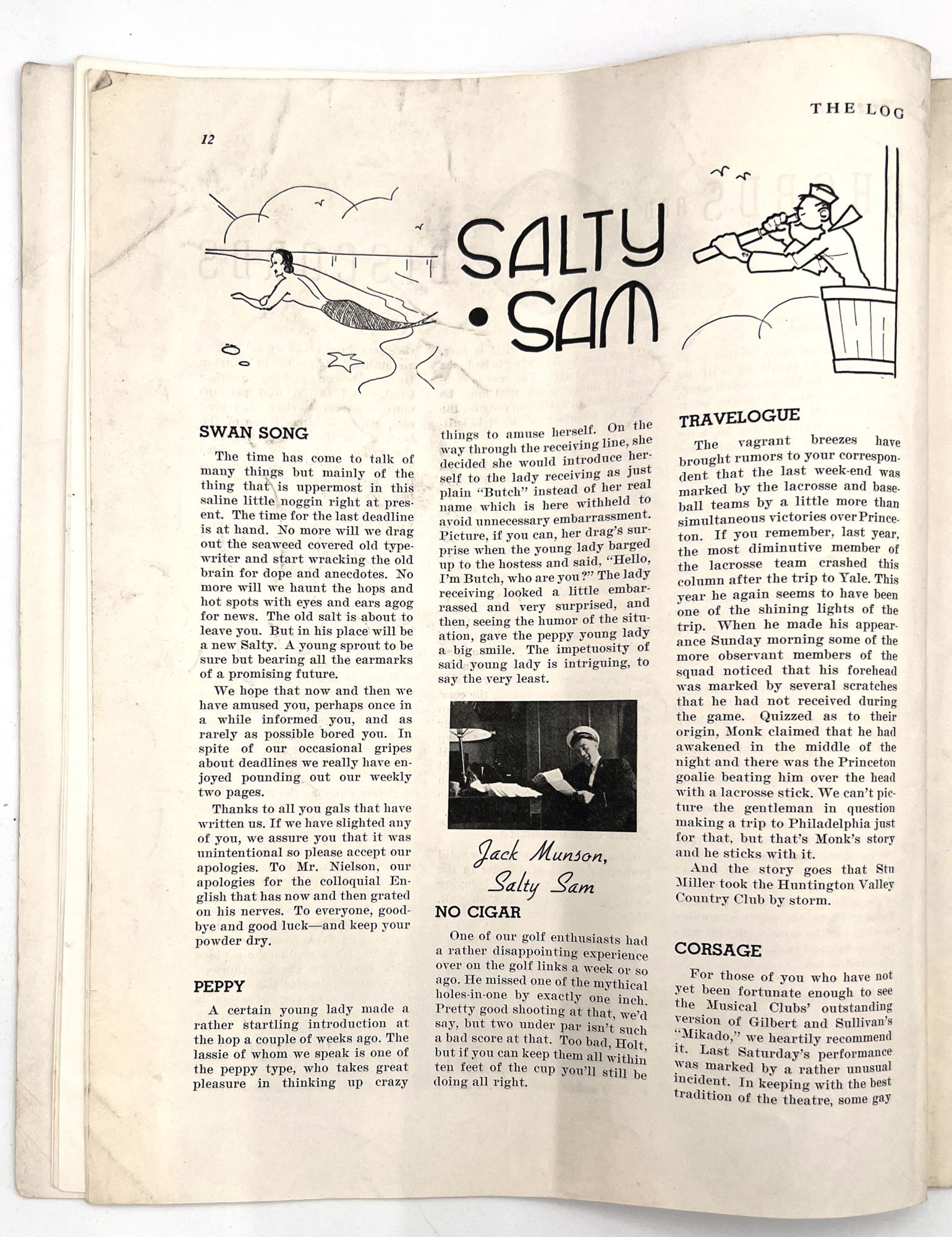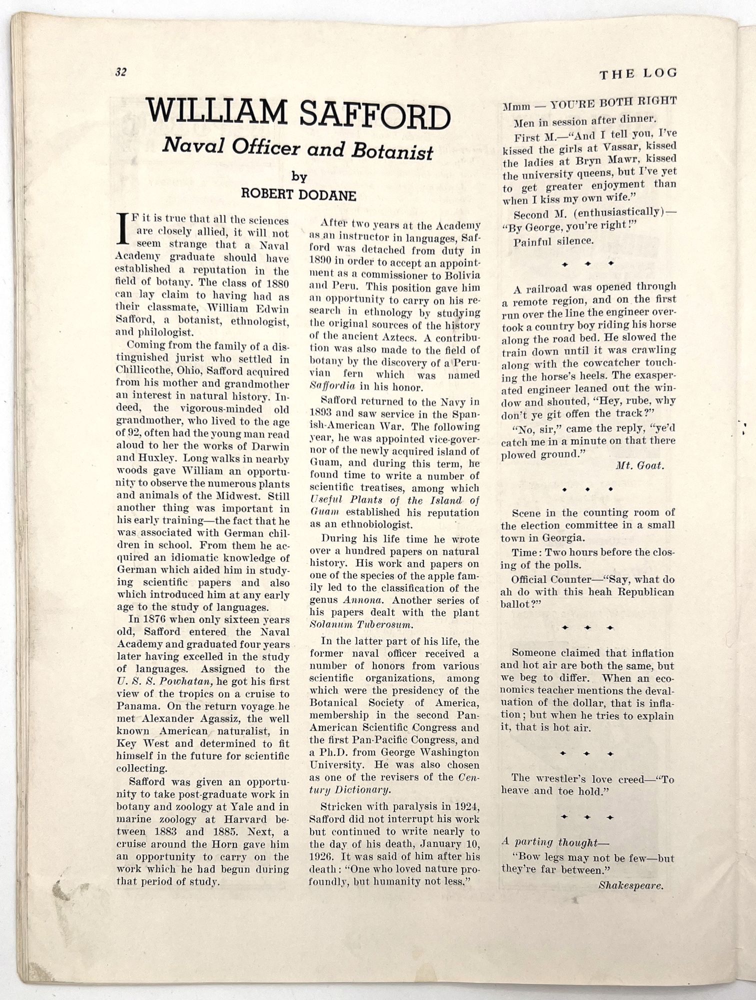 Annapolis, Maryland: U.S. Naval Academy, 1939. Good. Some staining including water staining, toning, dust soiling, creasing, with some minor closed short tears.. Vol. 28, No. 21 of "The Log", a serial published by the U.S. Naval Academy. Rife with humor and camaraderie, this issue features cartoons, silly stories, campus news, and fun facts for the young men to enjoy. Also included in this issue is a two-page spread featuring photos of the massive laundry operation at the Academy ("A Day at the Laundry"), athletic and extracurricular news (the gents put on a production of "The Mikado"), and a multiple choice trivia quiz ("Oil for Brains"). This copy has some minor annotations in pencil. Folio (12" by 9.25"), pp. 32 with in-text illustrations, stapled in original illustrated wrappers.