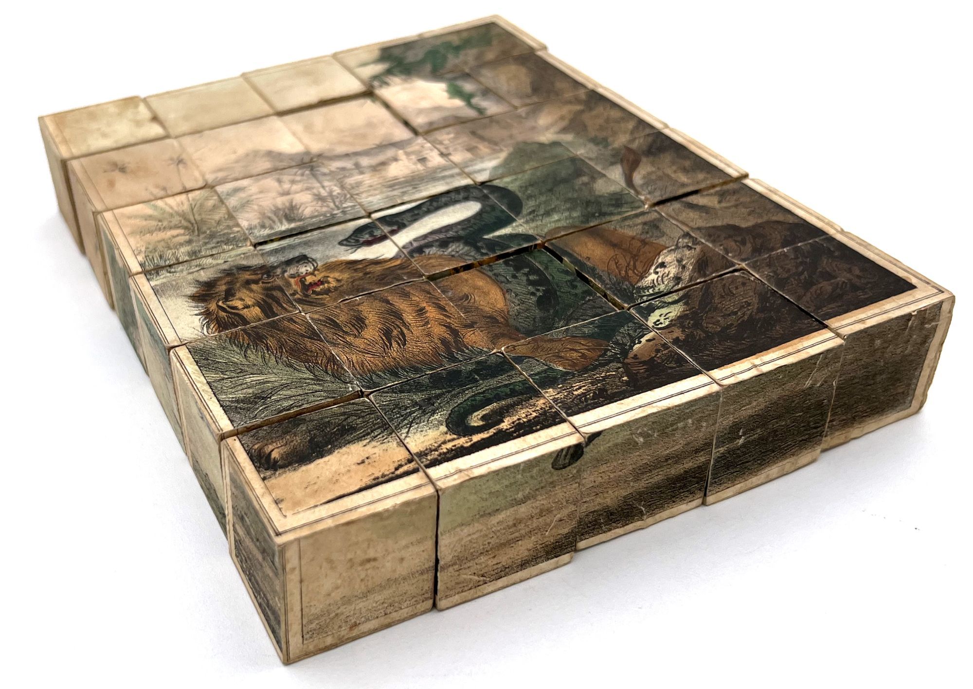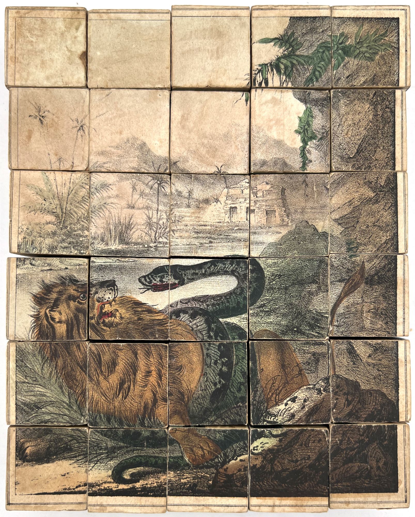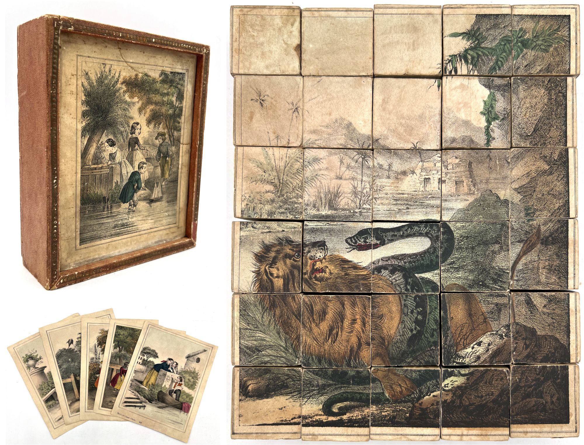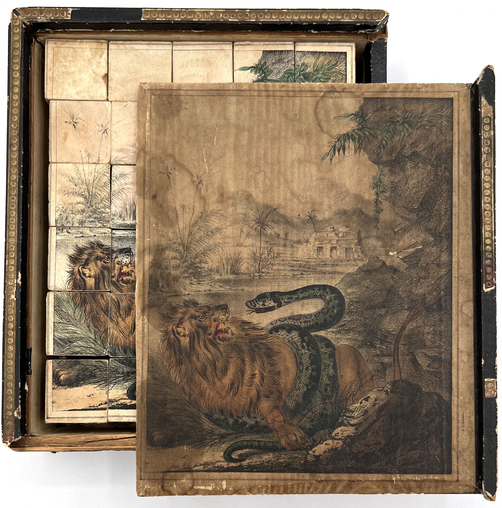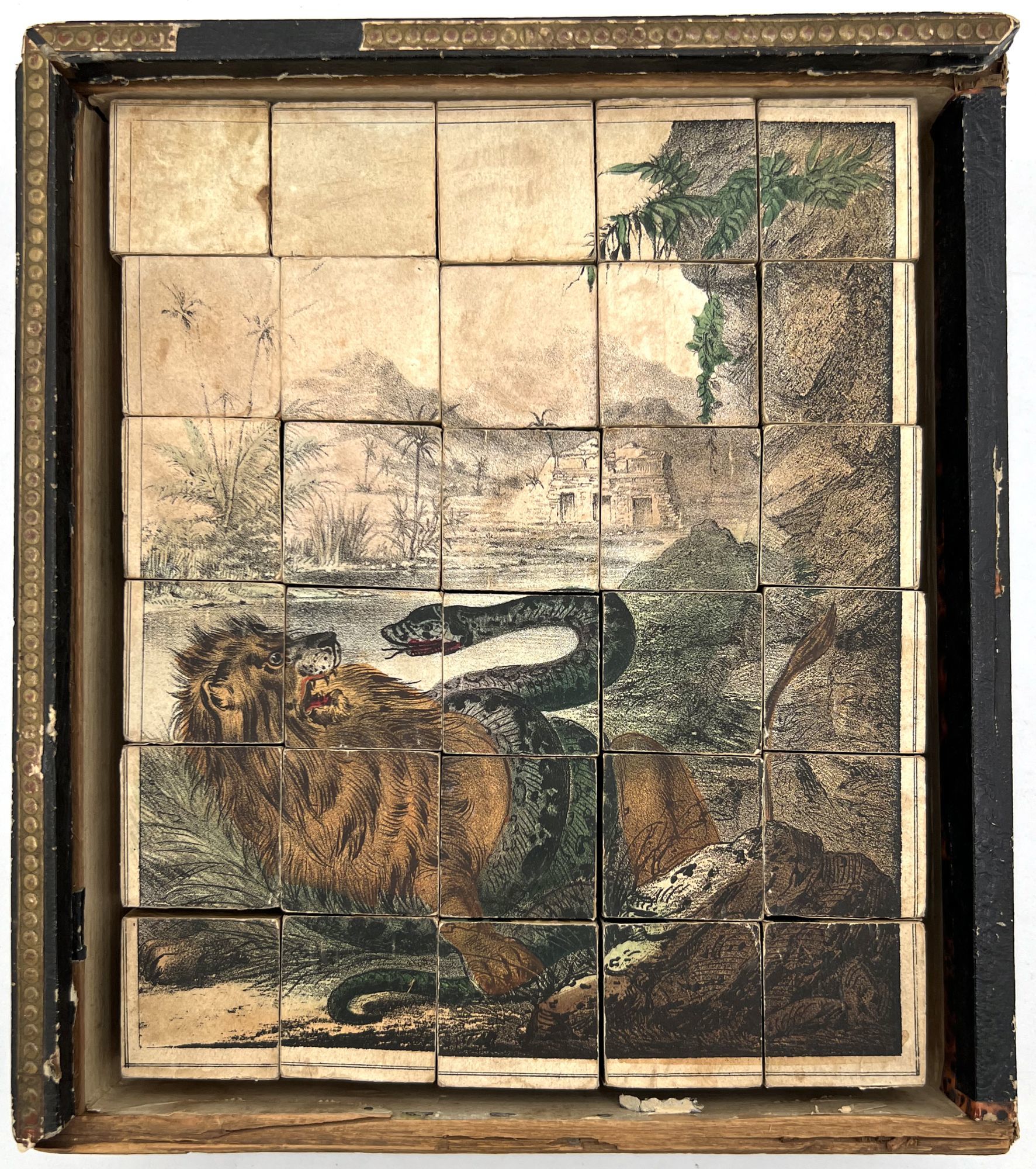 France: N.p., 1850. Fair. Box damaged with one apron partially lacking. Dust soiling with toning, water stains.. A handsome early Victorian block puzzle, depicting six (6) different dramatic adventure scenes for young children to marvel at. This example is complete with all thirty (30) blocks, the original box with sliding lid, and six (6) prints depicting each of the finished puzzles (the final print is pasted to the top of the box lid). The scenes include: a great snake battling a lion in an exotic landscape; Napoleon III on his war horse; wild horses and swans against a tropical landscape with ruins; a meeting of two exoticized nomadic tribes; and two pastoral scenes depicting cattle and a shepherd against mountainous landscapes. Only one has been signed ("G Roux del"). A former owner has cut the letter "E" out of the decorated paper on the side and bottom of the box, perhaps in an attempt to prevent siblings from pilfering the puzzle. Each print measures approx. 7.5" by 6.25" and is a hand-colored lithograph. Each block measures approx. 1" by 1" by 1", and assemble to make a completed puzzle measuring approx. 7.5" by 6" by 1". All are house din the original box covered in decorated paper with sliding lid measuring approx. 8.25" by 7.25" by 1.5