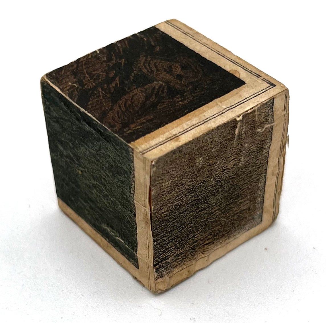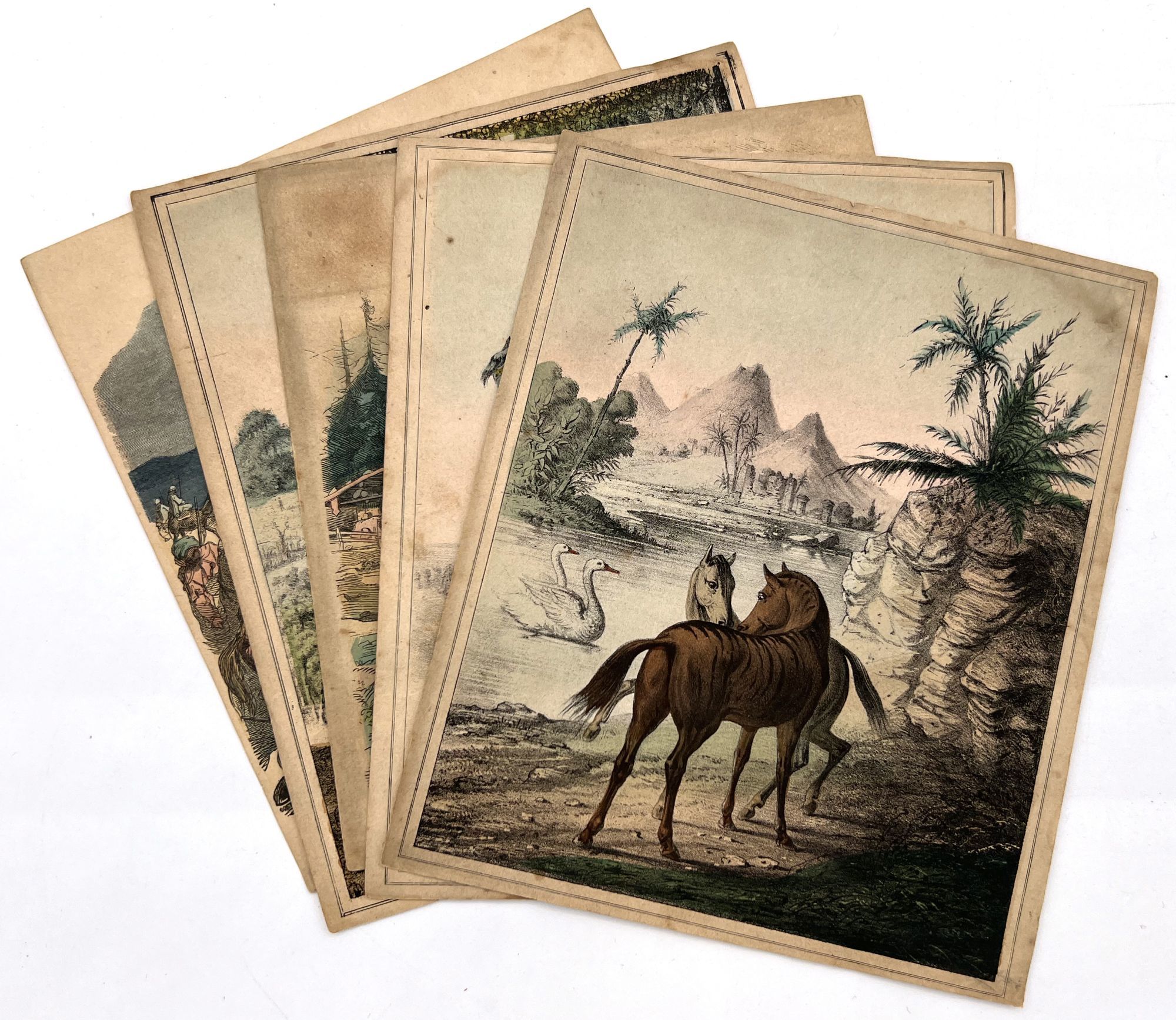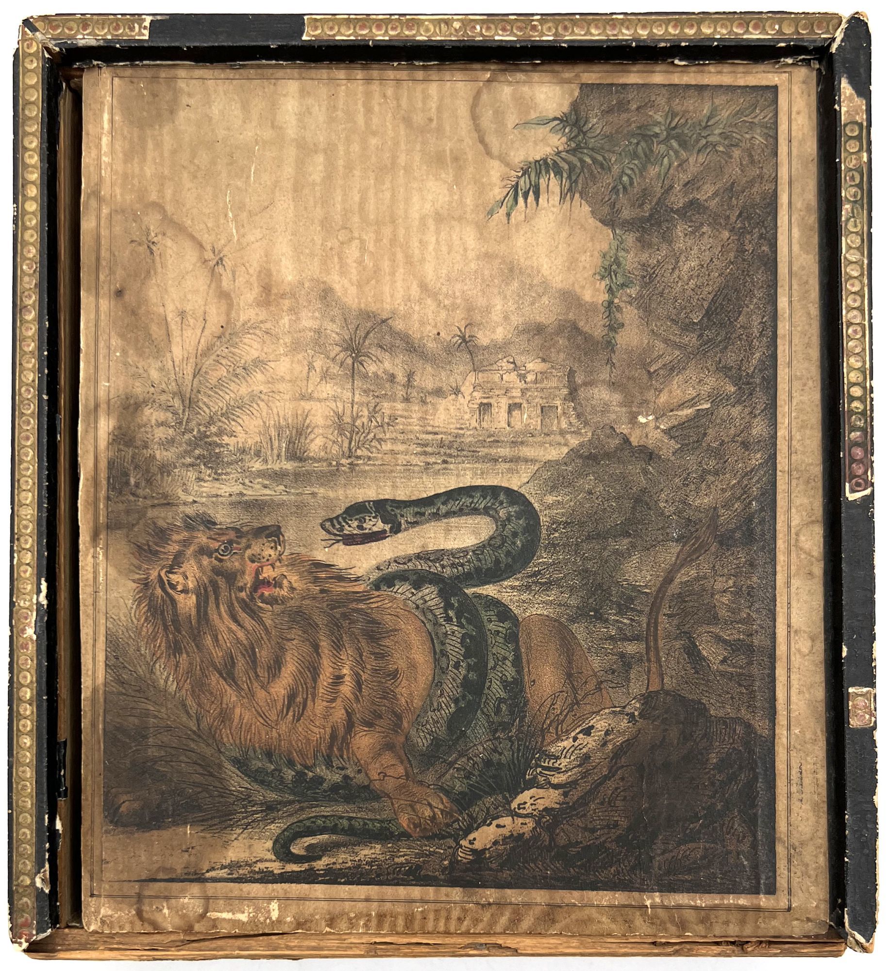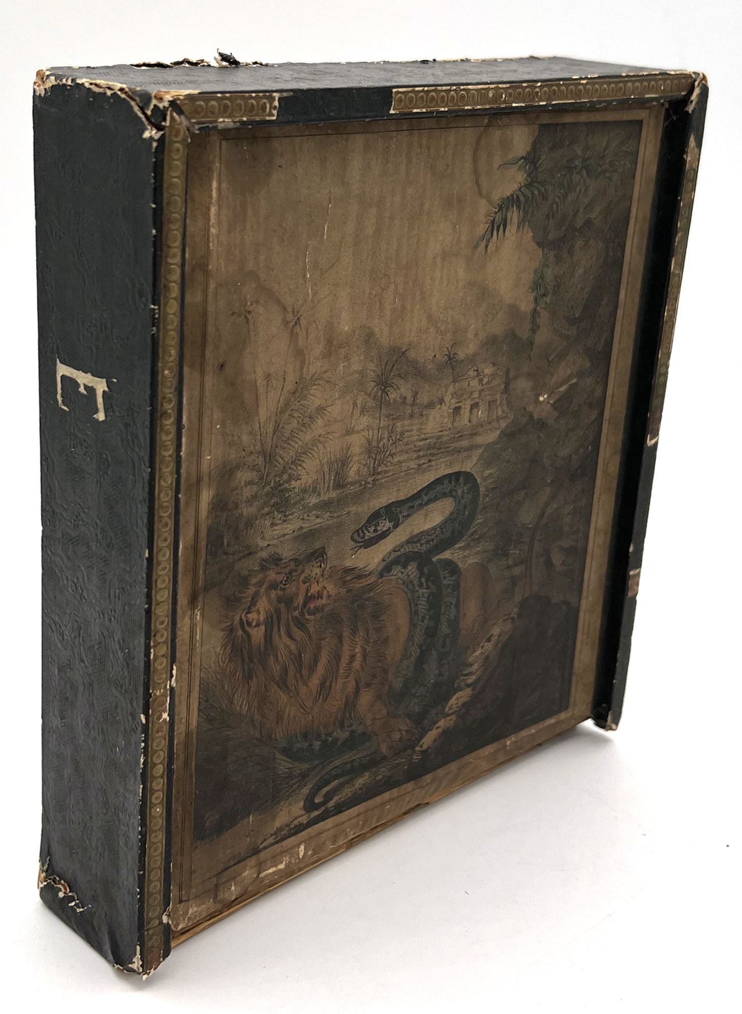 France: N.p., 1850. Fair. Box damaged with one apron partially lacking. Dust soiling with toning, water stains.. A handsome early Victorian block puzzle, depicting six (6) different dramatic adventure scenes for young children to marvel at. This example is complete with all thirty (30) blocks, the original box with sliding lid, and six (6) prints depicting each of the finished puzzles (the final print is pasted to the top of the box lid). The scenes include: a great snake battling a lion in an exotic landscape; Napoleon III on his war horse; wild horses and swans against a tropical landscape with ruins; a meeting of two exoticized nomadic tribes; and two pastoral scenes depicting cattle and a shepherd against mountainous landscapes. Only one has been signed ("G Roux del"). A former owner has cut the letter "E" out of the decorated paper on the side and bottom of the box, perhaps in an attempt to prevent siblings from pilfering the puzzle. Each print measures approx. 7.5" by 6.25" and is a hand-colored lithograph. Each block measures approx. 1" by 1" by 1", and assemble to make a completed puzzle measuring approx. 7.5" by 6" by 1". All are house din the original box covered in decorated paper with sliding lid measuring approx. 8.25" by 7.25" by 1.5