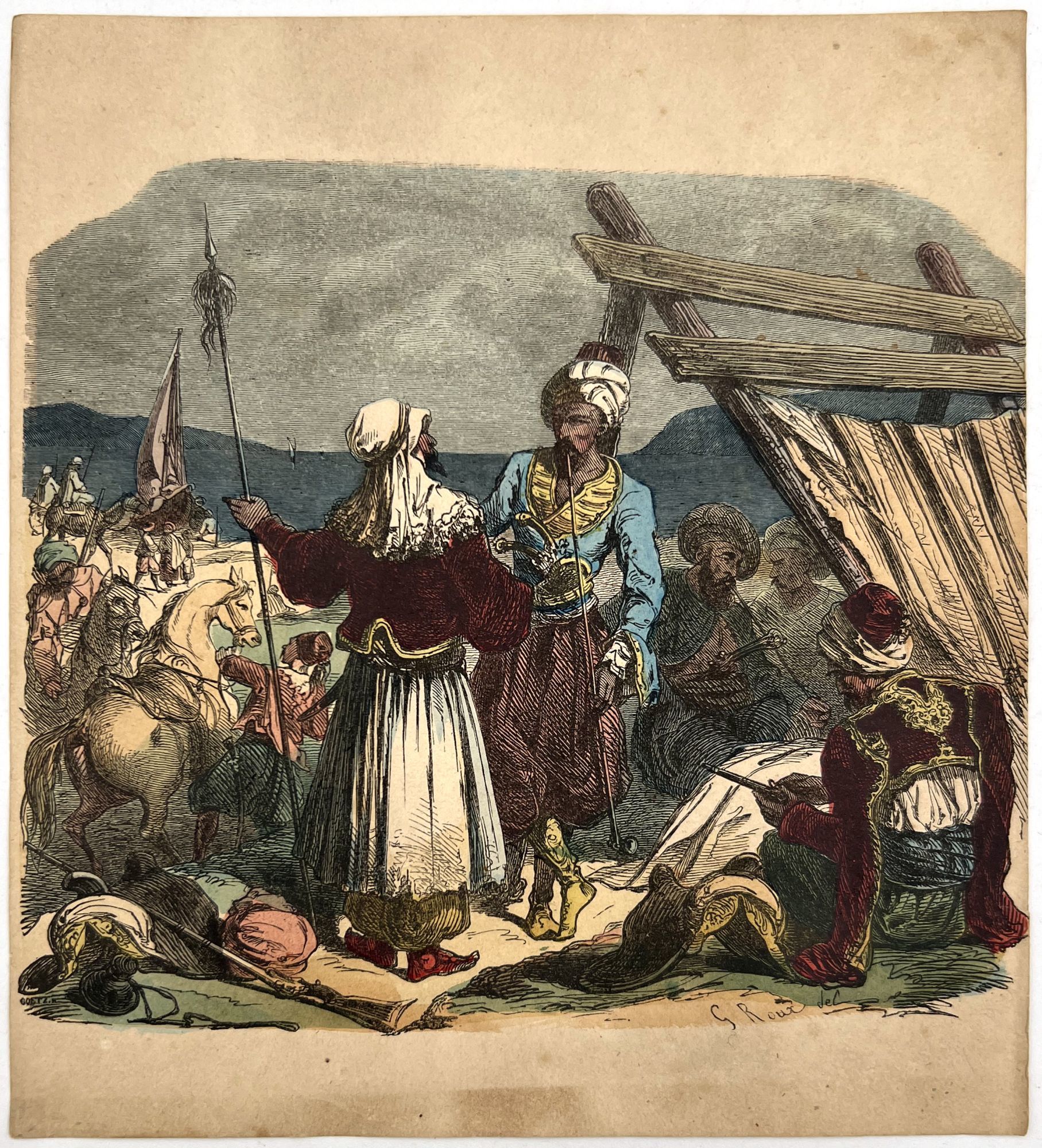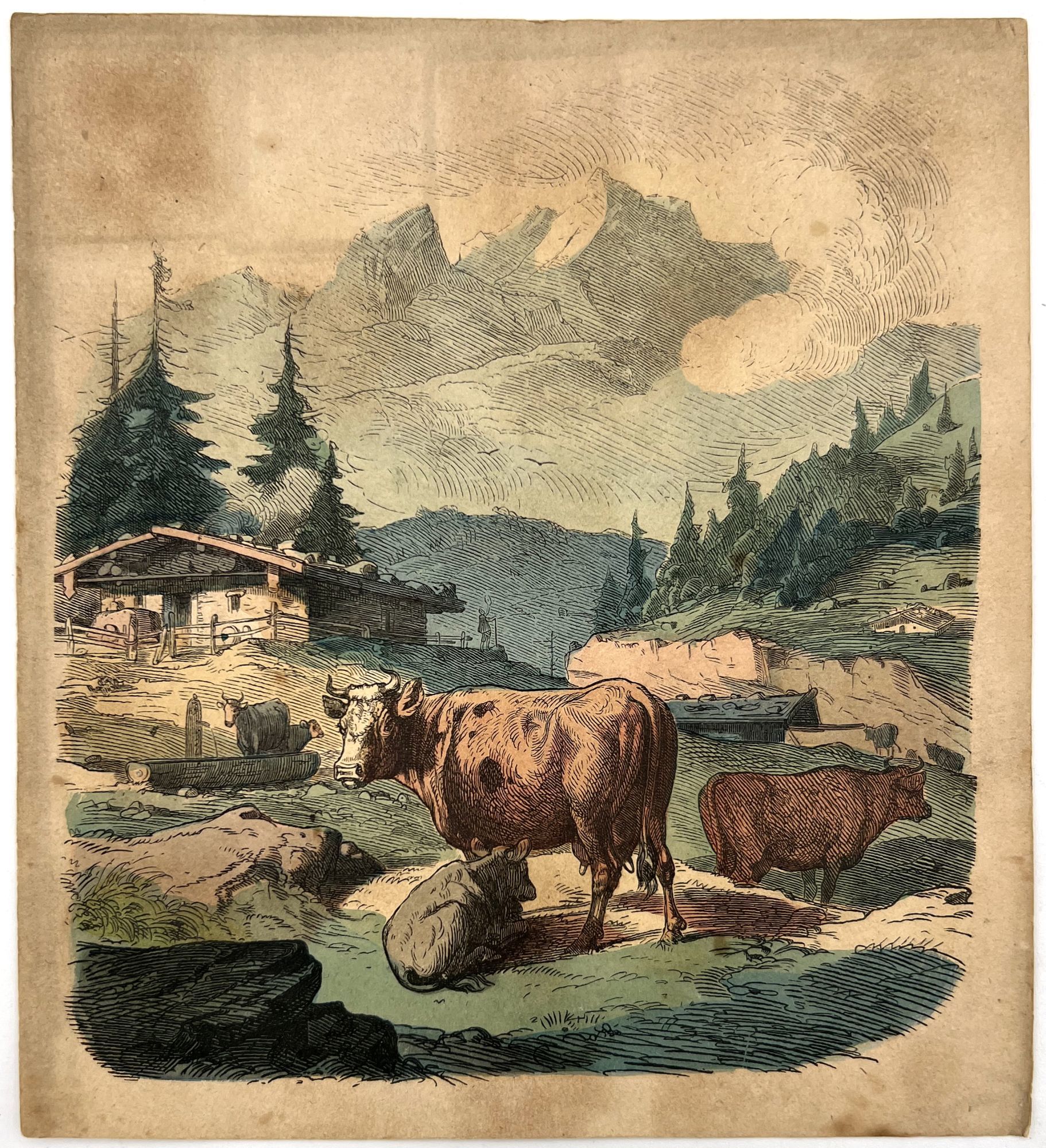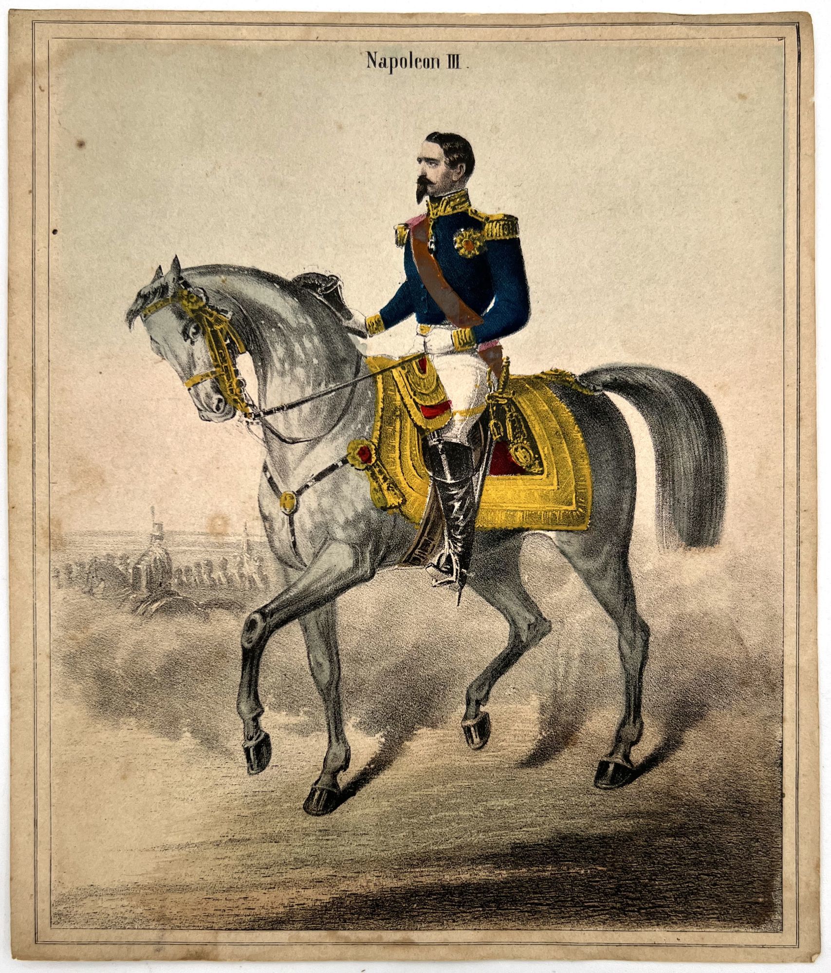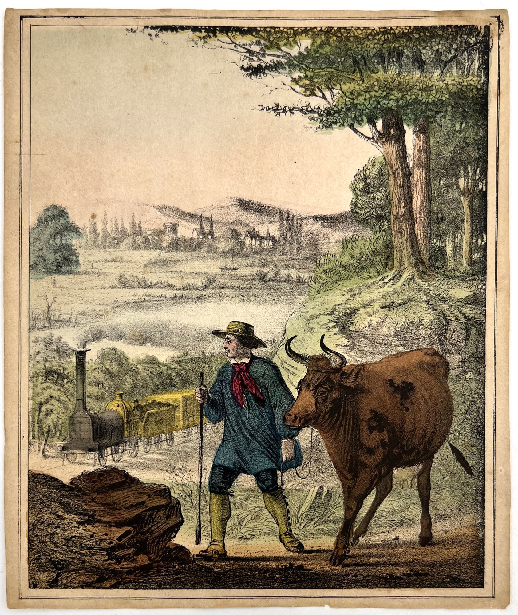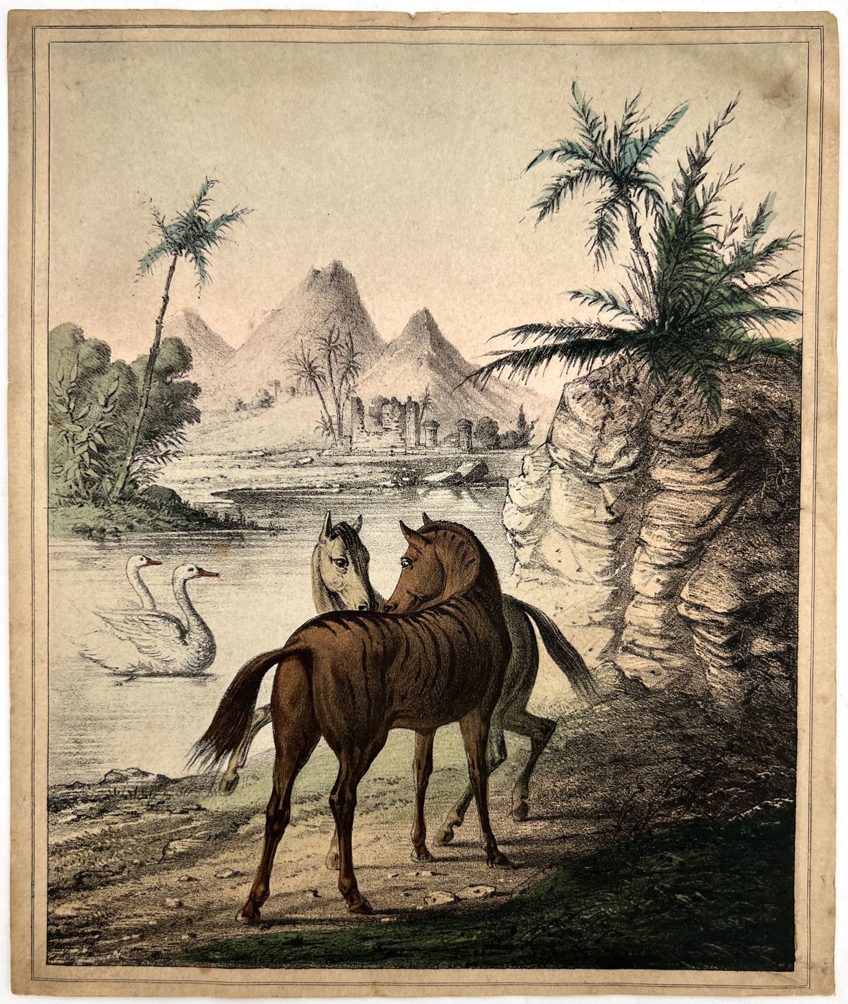 France: N.p., 1850. Fair. Box damaged with one apron partially lacking. Dust soiling with toning, water stains.. A handsome early Victorian block puzzle, depicting six (6) different dramatic adventure scenes for young children to marvel at. This example is complete with all thirty (30) blocks, the original box with sliding lid, and six (6) prints depicting each of the finished puzzles (the final print is pasted to the top of the box lid). The scenes include: a great snake battling a lion in an exotic landscape; Napoleon III on his war horse; wild horses and swans against a tropical landscape with ruins; a meeting of two exoticized nomadic tribes; and two pastoral scenes depicting cattle and a shepherd against mountainous landscapes. Only one has been signed ("G Roux del"). A former owner has cut the letter "E" out of the decorated paper on the side and bottom of the box, perhaps in an attempt to prevent siblings from pilfering the puzzle. Each print measures approx. 7.5" by 6.25" and is a hand-colored lithograph. Each block measures approx. 1" by 1" by 1", and assemble to make a completed puzzle measuring approx. 7.5" by 6" by 1". All are house din the original box covered in decorated paper with sliding lid measuring approx. 8.25" by 7.25" by 1.5