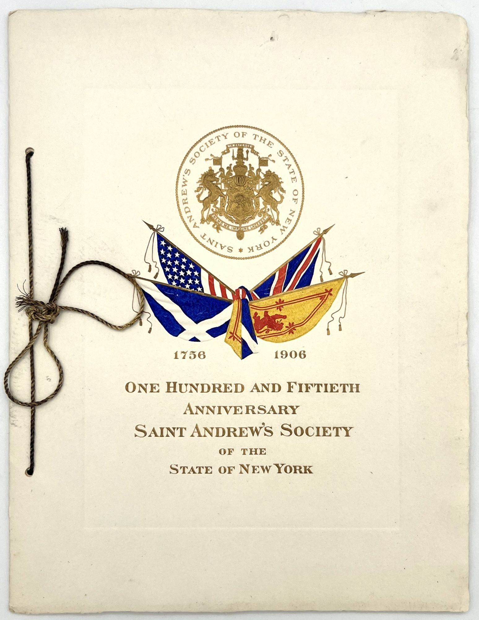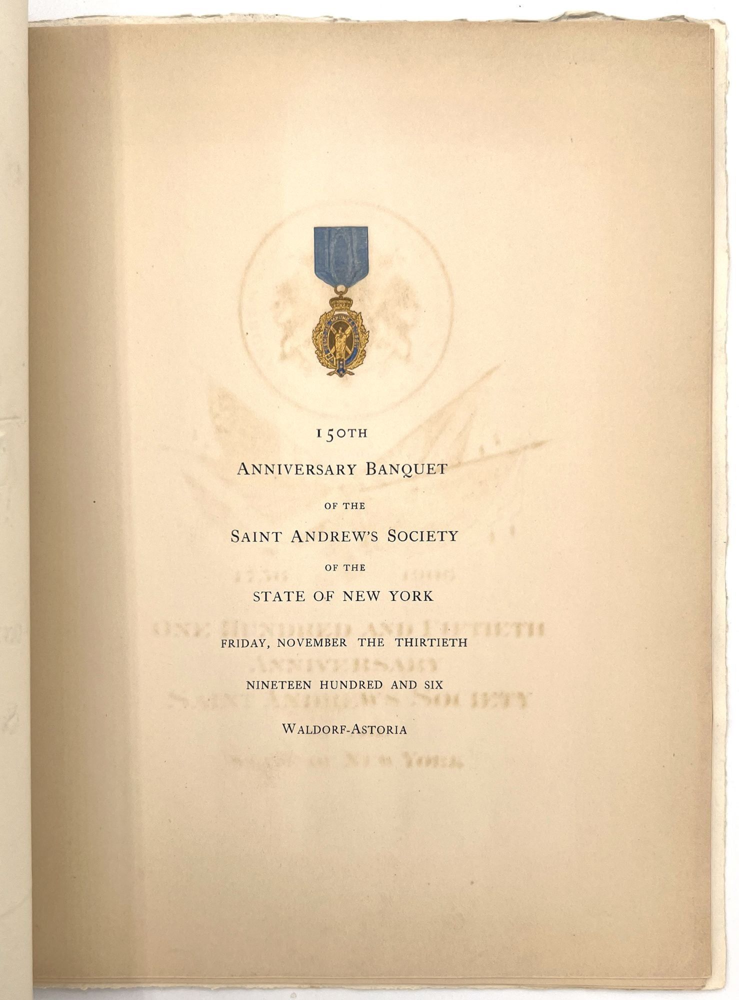 Menu and Program for One Hundred and Fiftieth Anniversary Saint Andrew’s Society of State of New York, Waldorf Astoria, Friday, November 30, 1906