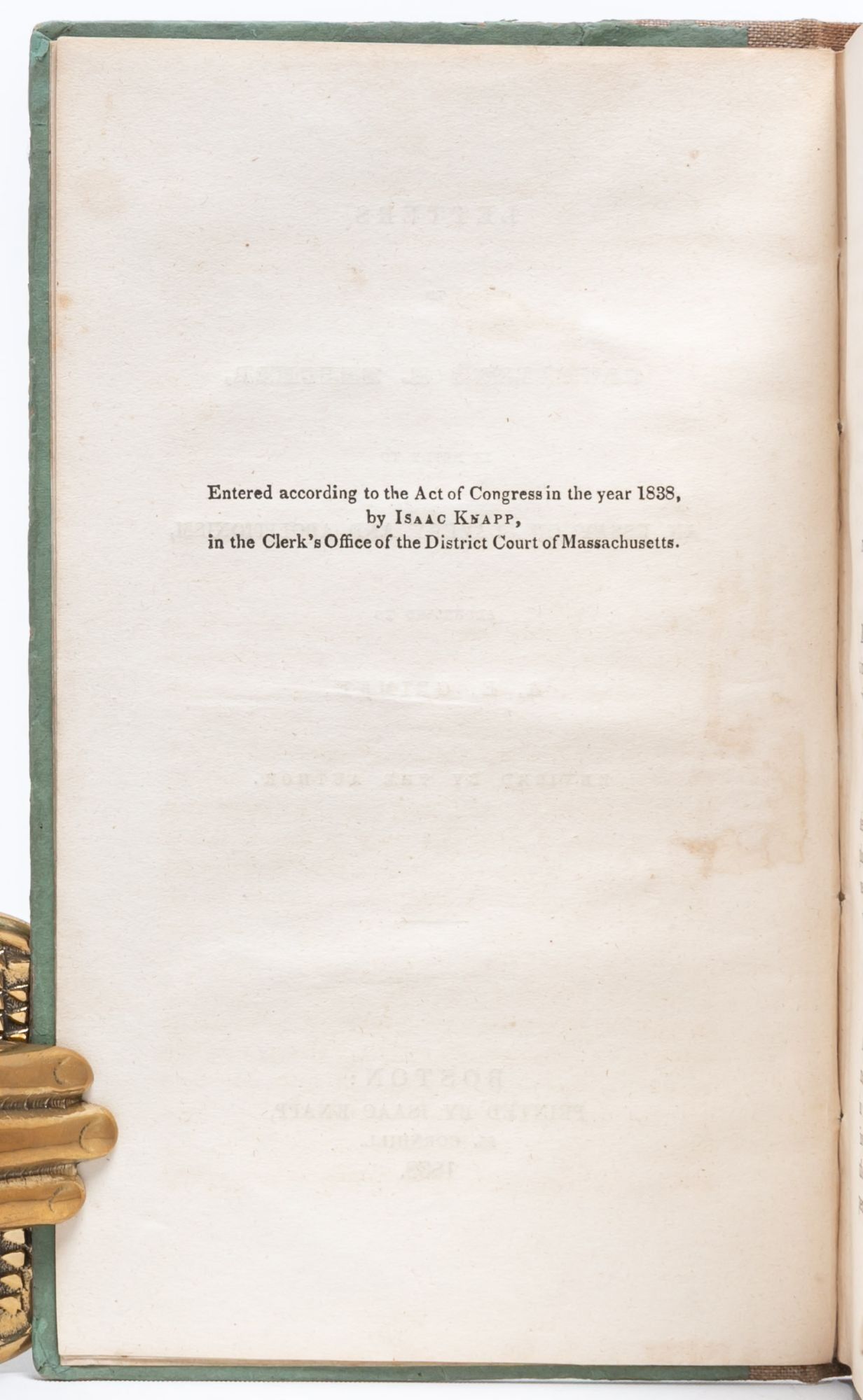 Boston: Printed by Isaac Knapp, 1838. First edition. Very Good. Octavo (177 x 107 mm). Contemporary blue boards, neatly rebacked to style in beige buckram, original yellow printed paper label on front cover. Binding a little soiled but presenting smartly, recased, corners and inner hinges expertly repaired, contents crisp and clean: a very good copy.