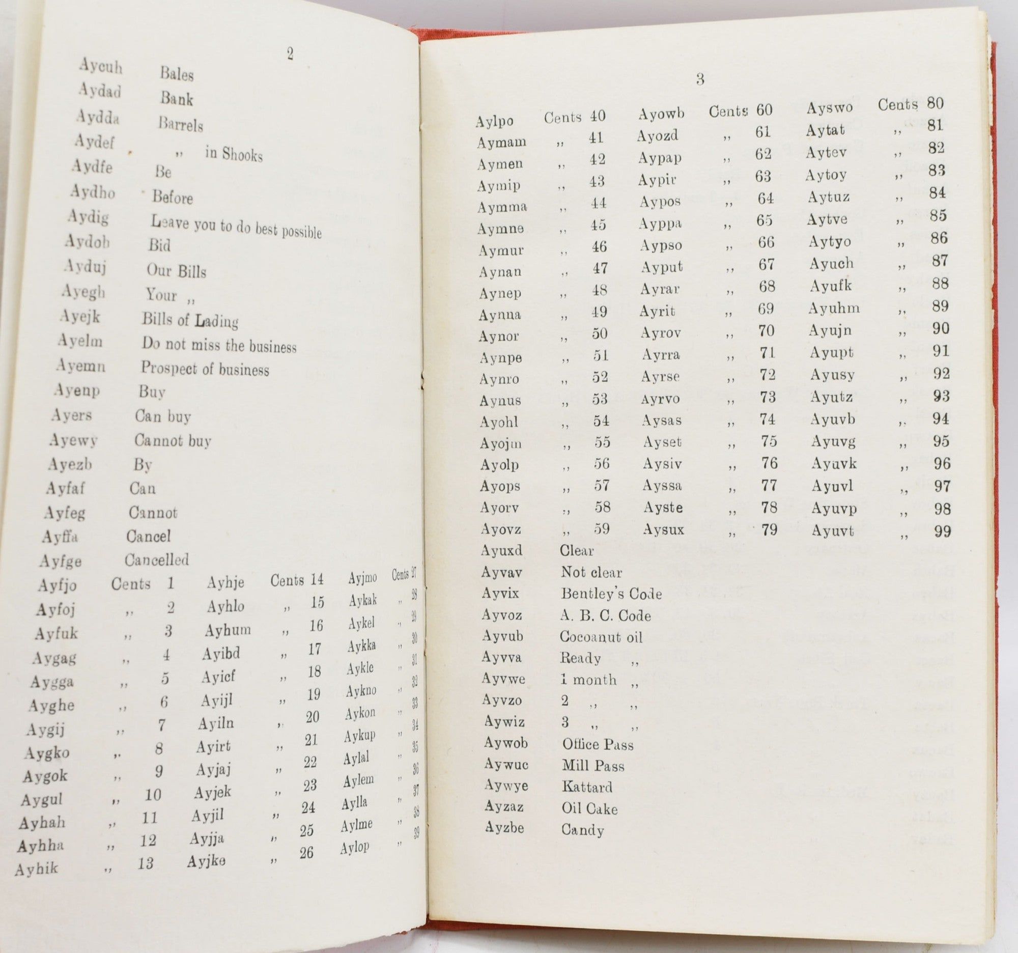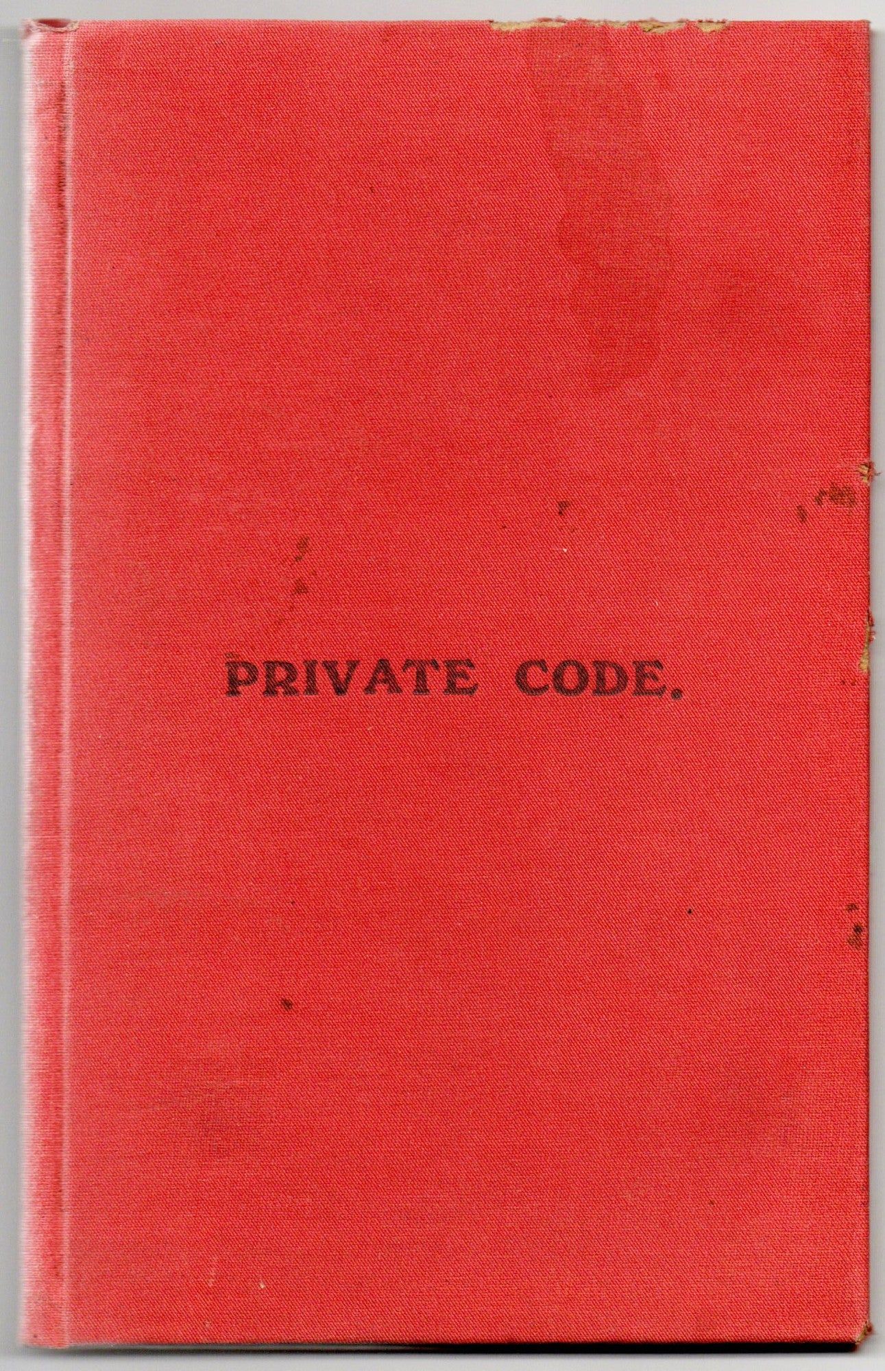 Kerala, India. Slim volume bound in red cloth bearing the title of “Private Code”, containing 40 pages of alphabetical code, from Auvne through Cunta. Variable columns per page. The meaning of each code word stops on page 33 at ‘Cokla’, although the codes for the months of the year are hand-written on page 34. Inscribed with “No. 5 / Held by / Mr. W.B. Gelniss/GeluÎss / Tatapuram”. Good+~~Tatapuram is a neighborhood in the Indian state of Kerala, along the southwest coast. Several pages of code words refer to very specific numerical values. Much of the coding is absurdly specific, particularly in the section beginning on p.29, “Re. Ground-nuts”. For example, ‘Cogyn’ means ‘The new crop arrivals are rather damp’. ~~Through the meanings of various code words and the location of the owner of the book, one can assume it belonged to a businessman operating out of the Malabar coast of India, exporting rugs, nuts, and other foodstuffs to clients in America as well as elsewhere in India, sometime in the 19th or early 20th-century. It is unclear why business dealings which do not appear sensitive in nature were encoded, who wrote the code and how, whether it is incomplete and why, or who else would have had access to this code among his business partners and customers. Having written that his is No. 5, in addition to the effort involved in binding the code-book, suggests that it was a serious effort meant for and perhaps once in use.~.