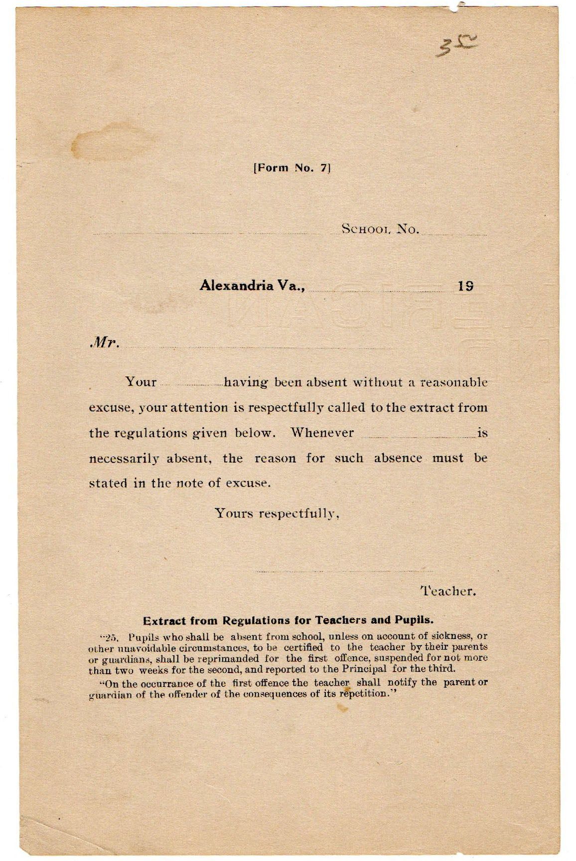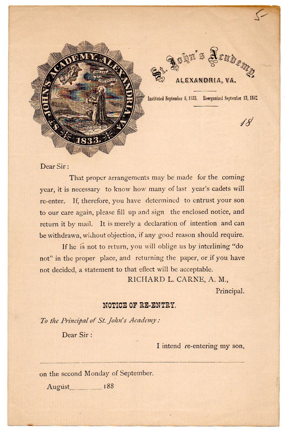 Alexandria, VA, 1880. St. John's Academy was established on September 8, 1833 in Alexandria, Virginia by brothers William and Richard L. Carne, along with Reverend John Smith, S.J. and other Jesuits. In the 1850s, a primary school was added to the Academy; enrollment fluctuated but reached 154 in the 1863–64 school year. The Latin motto visible on the seal states ‘Pro deo et pro patria’, or ‘For God and Country’. ~ ~This re-enrollment from address fathers of current students whether they will be returning in the following year. It is signed by Richard L. Carne, A.M., the Principal and son of one of the founders of the school and dated “188_”. Around the time of this form being sent to student’s homes, St. John's moved to the corner of Duke & South Columbus Street. In late 1895, St. John’s closed; it had over 1500 alumni. Nearly 100 years later the building was converted into condominiums.~~1 pp. Excellent. ~ ~.