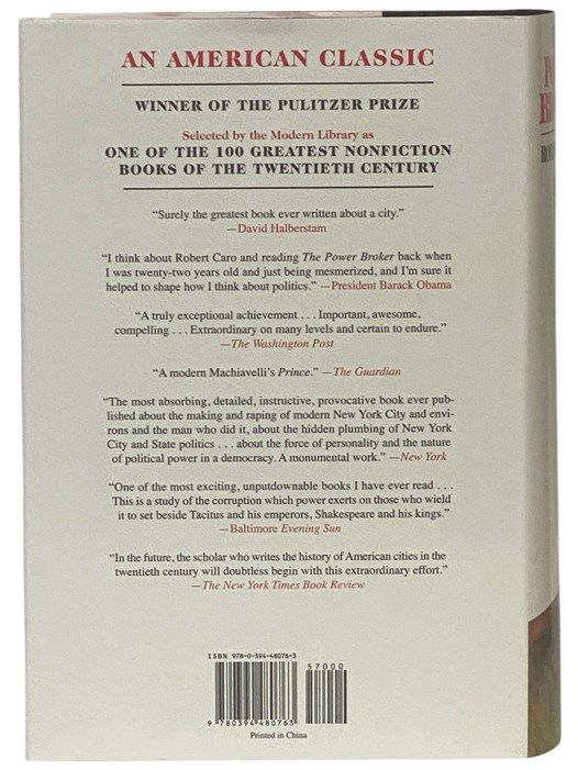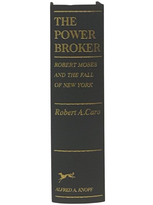 New York: Alfred A. Knopf, 1974. Reprint. Hard Cover. Near Fine/Fine. 6x2x9. Signed by author. 2023 17th printing. Signed by author without inscription on half-title page. An exceptional copy. 1974 Hard Cover. 1246, xxxiv pp. One of the most acclaimed books of our time, winner of both the Pulitzer and the Francis Parkman prizes, The Power Broker tells the hidden story behind the shaping (and mis-shaping) of twentieth-century New York (city and state) and makes public what few have known: that Robert Moses was, for almost half a century, the single most powerful man of our time in New York, the shaper not only of the city's politics but of its physical structure and the problems of urban decline that plague us today. In revealing how Moses did it--how he developed his public authorities into a political machine that was virtually a fourth branch of government, one that could bring to their knees Governors and Mayors (from La Guardia to Lindsay) by mobilizing banks, contractors, labor unions, insurance firms, even the press and the Church, into an irresistible economic force--Robert Caro reveals how power works in all the cities of the United States. Moses built an empire and lived like an emperor. He personally conceived and completed public works costing 27 billion dollars--the greatest builder America (and probably the world) has ever known. Without ever having been elected to office, he dominated the men who were--even his most bitter enemy, Franklin D. Roosevelt, could not control him--until he finally encountered, in Nelson Rockefeller, the only man whose power (and ruthlessness in wielding it) equalled his own.