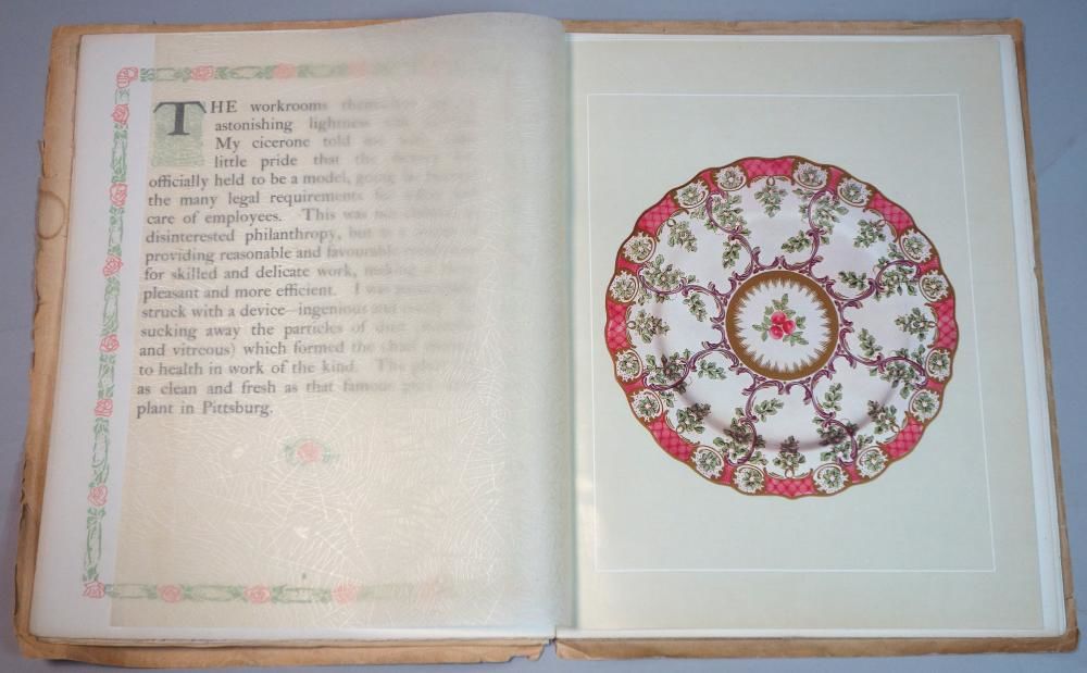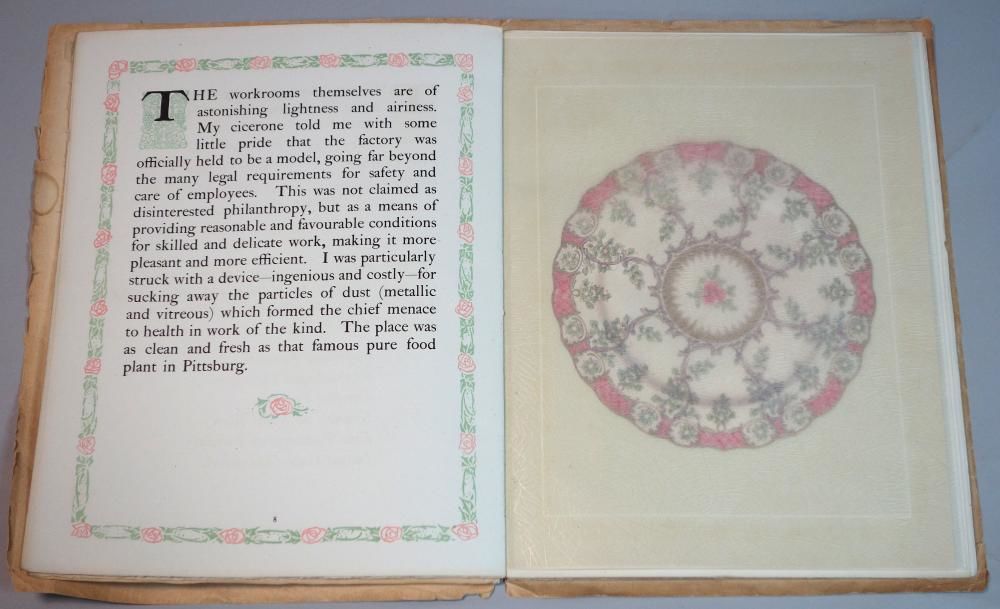The Royal Porcelain Book. Albert Frost & Sons. c.1910. 20pp. soft cover with ornate embossed cover design. The first two (2) pages a sort of title page endpapers is attached tissue and reads "The Story of Royal Worcester China and some Notes on a visit to the ancient city of Worcester" bordered with floral decorative devices Eight (8) fine chromolithograph color plates depicting examples of fine wares created by the firm; each faced with textured glassine. The text is a history on Royal Worcester Porcelain in narrative. Floral decorative devices border the pages with deckled edges. Concludes with the applied tissue endpapers. Measures 8 1/2" x 11 1/4". Edge wear on covers.
