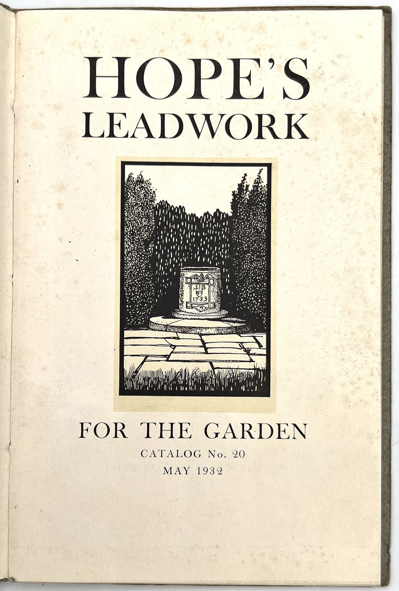 Hope’s Leadwork For the Garden, Catalog #20, dated May, 1932, from Hope’s Windows Inc., Jamestown, New York. Catalog contains 58 pages, most of which have illustrations of lead statuary, some shown in garden settings.. Some stonework also shown. Excellent reference work. Condition: few spots, minor soiling, covers; minor soiling, end papers and first and last blank pages. Minor foxing, title page; few spots of soiling, inside pages. Otherwise VG throughout. 5 ½” X 8 5/8”.