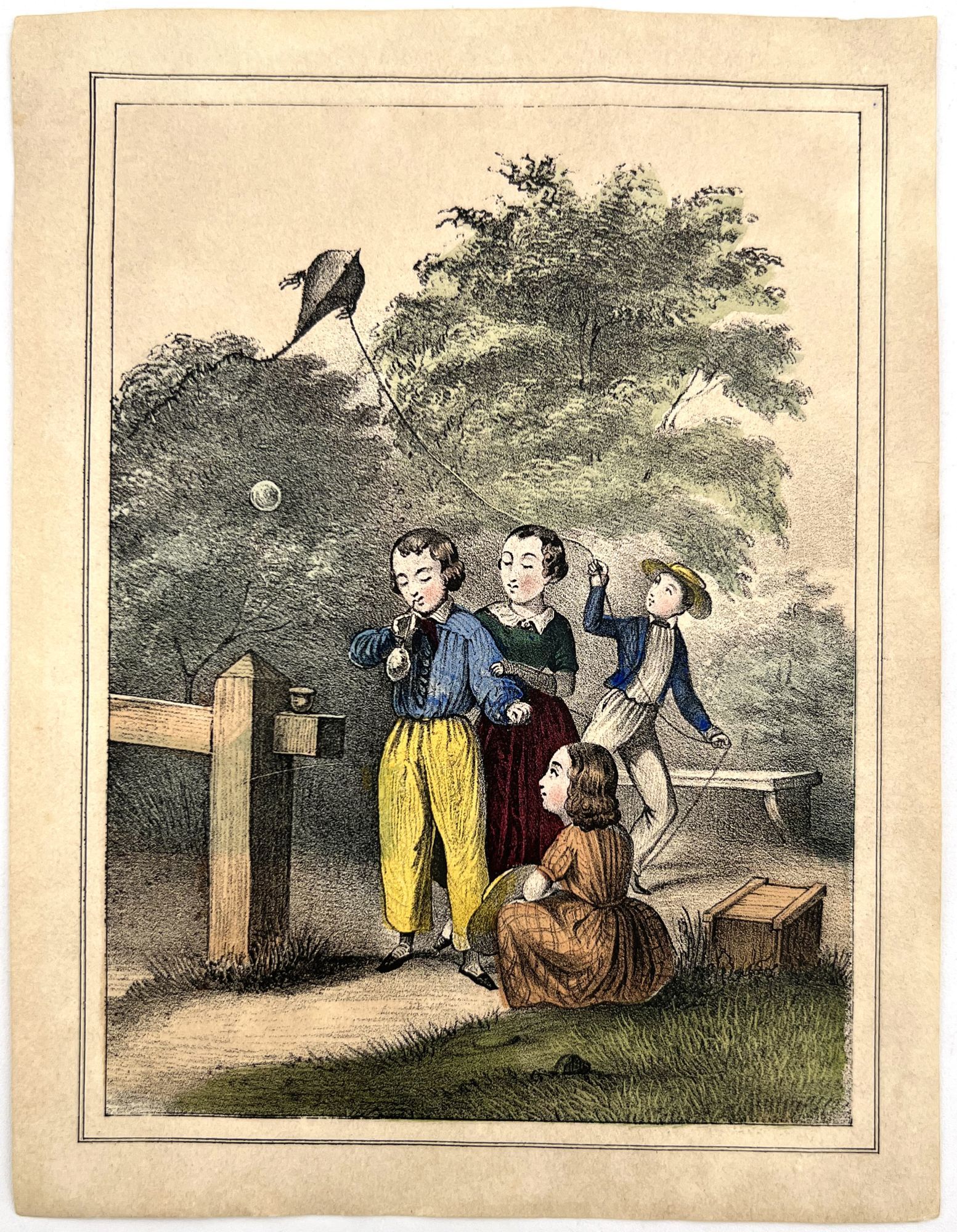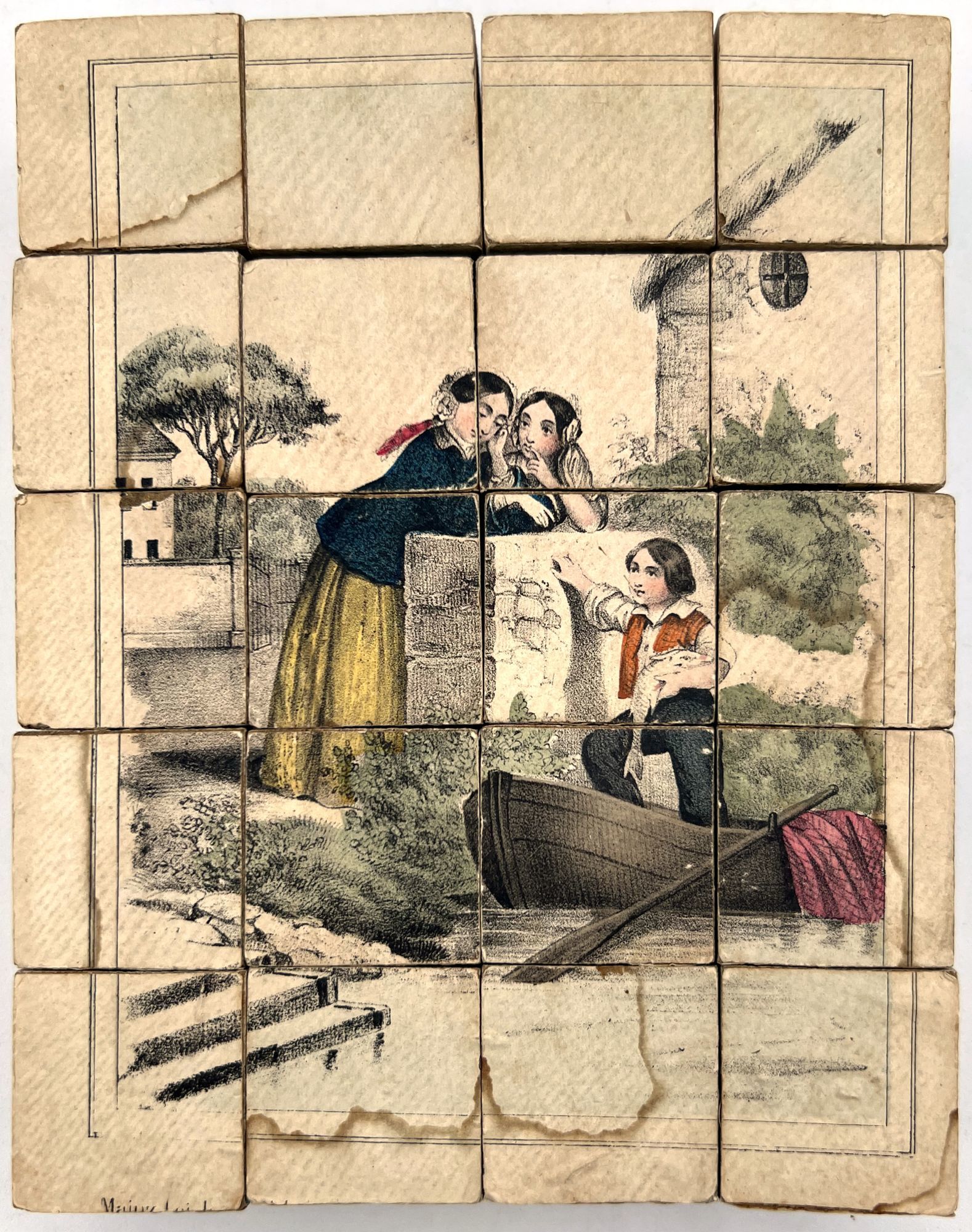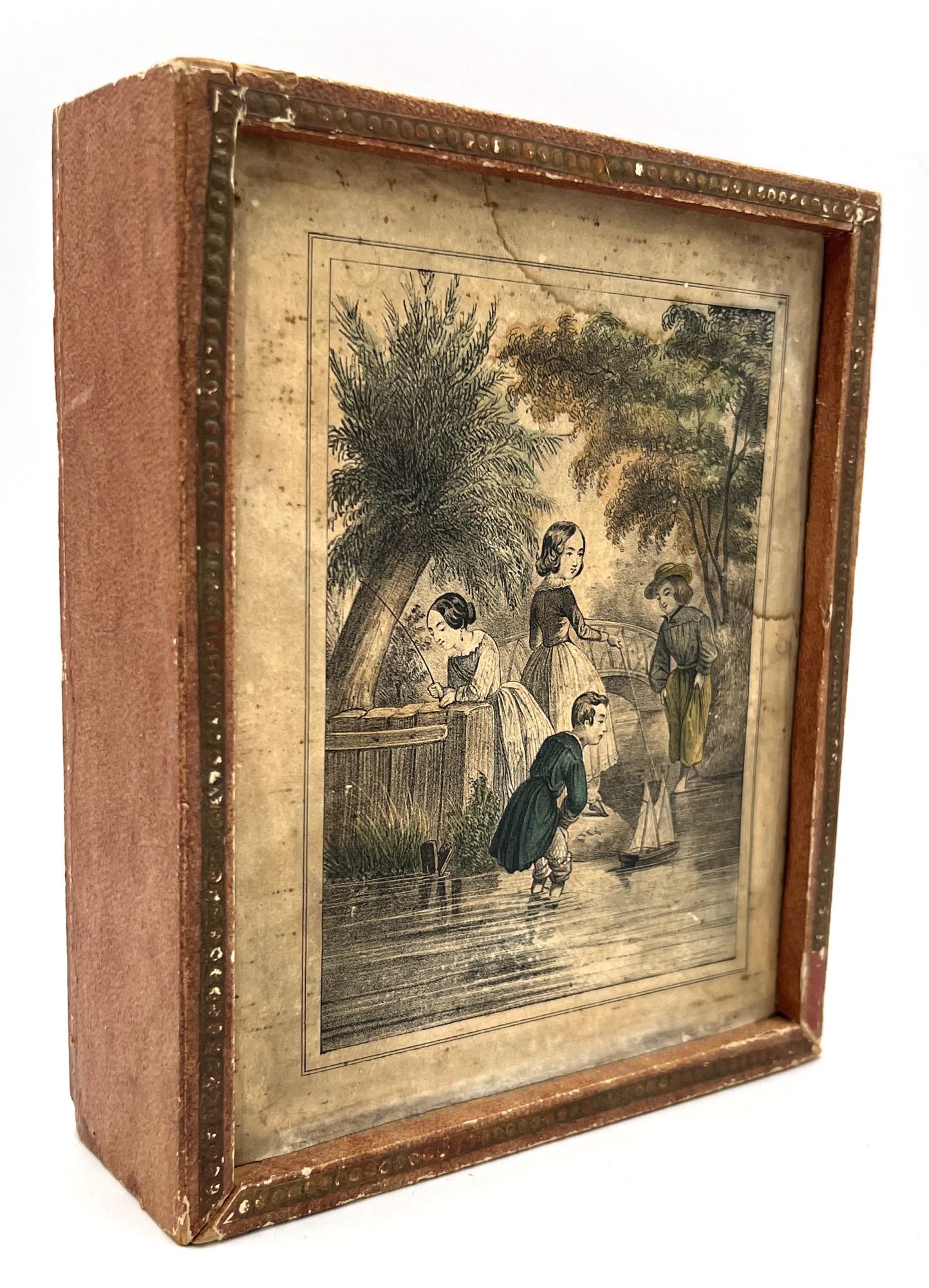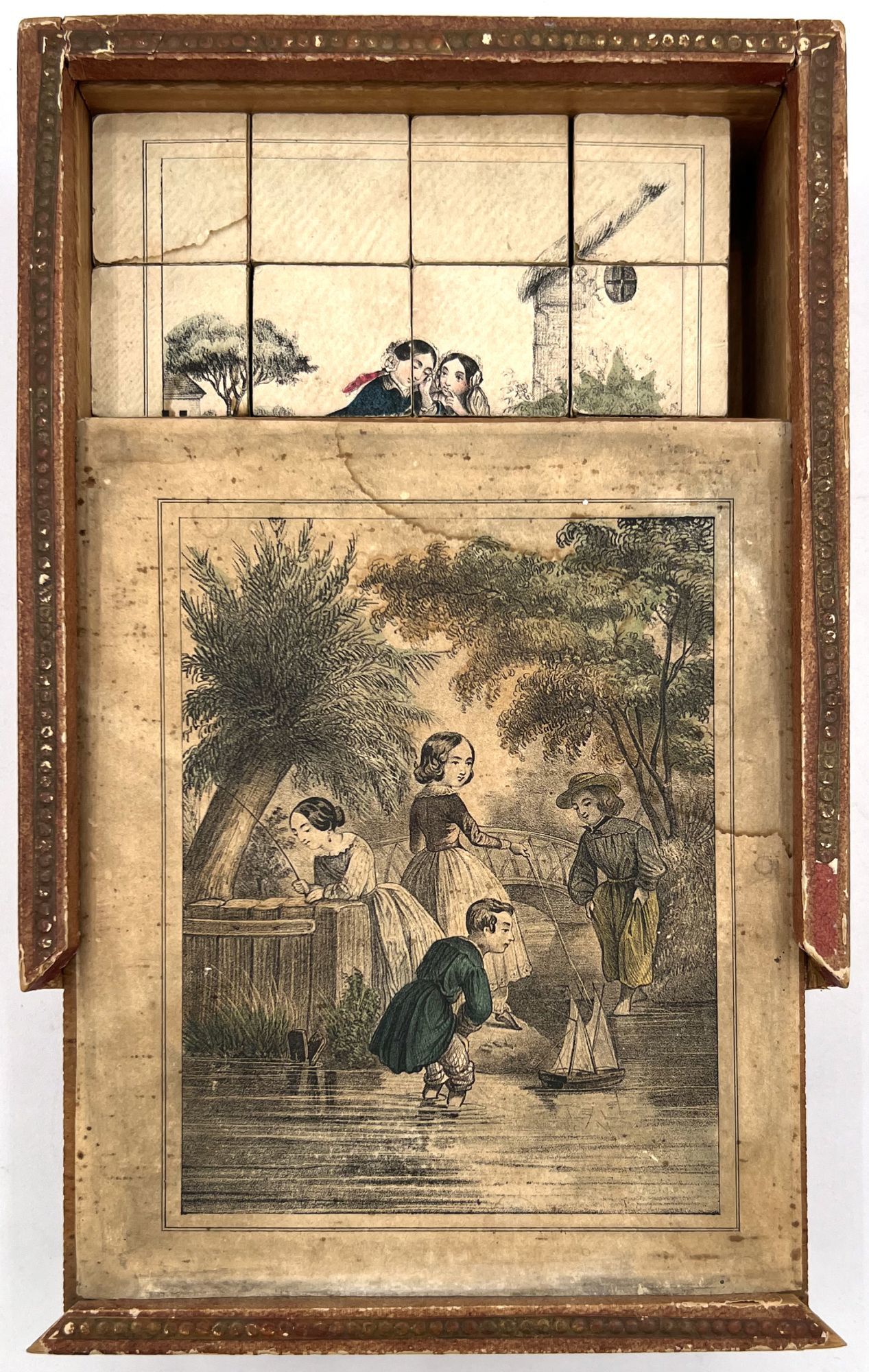 Mainz, Germany: Joseph Scholz, 1840. Good. Complete and intact, with hand coloring still bright. Minor flaws include water staining, edge wear, light toning and dust soiling, and the occasional slight lift of a corner of paper on the blocks or box.. A scarce early Victorian block puzzle, providing children with six (6) puzzles in one tidy box. This example is complete with all twenty (20) blocks, original box with sliding lid, five (5) example prints, and one (1) final example print pasted to the upper lid of the box. Produced by Joseph Scholz of Mainz, Germany, for the British and German toy markets. The scenes are highly attractive and depict outdoor pastoral scenes of children playing with toys, fishing, flying a kite, or blowing bubbles. Each print and the blocks are lithographed with additional hand coloring. The prints each measure approx. 6.25" by 5". The box measures approx. 7.5" by 6.25" by 2.25", and is adorned with decorated paper. Each block measures approx. 1.25" by 1.25" by 1.25", and the complete assembled puzzle measures approx. 6.25" by 5" by 1.25" Joseph Scholz of Mainz, Germany was a prominent publisher of children's books, prints, and toys, producing everything from toy theaters to board games. His style is marked by well executed hand-colored lithography, and attractive imagery of animals and childhood.