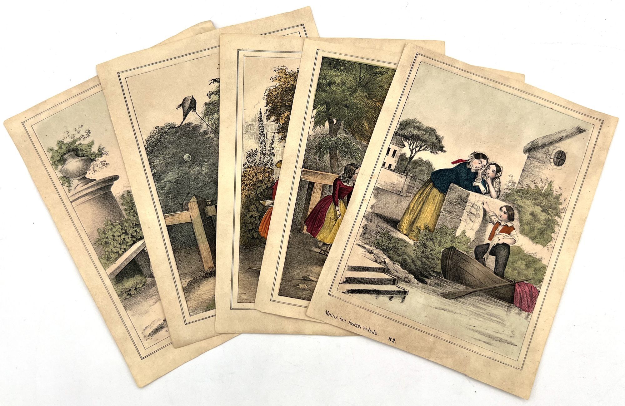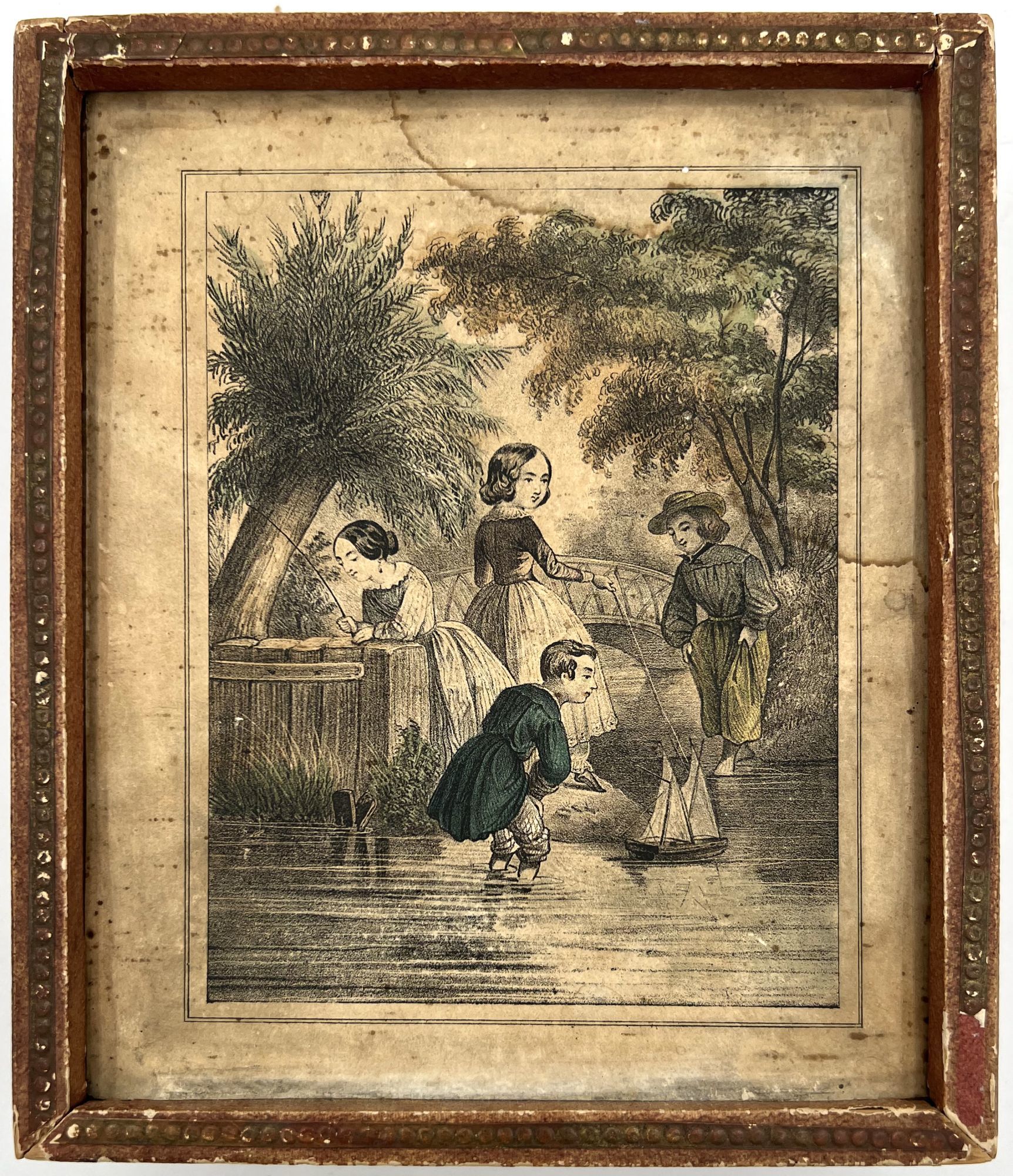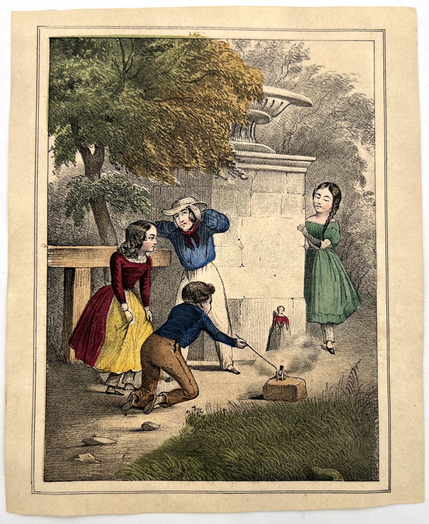 Mainz, Germany: Joseph Scholz, 1840. Good. Complete and intact, with hand coloring still bright. Minor flaws include water staining, edge wear, light toning and dust soiling, and the occasional slight lift of a corner of paper on the blocks or box.. A scarce early Victorian block puzzle, providing children with six (6) puzzles in one tidy box. This example is complete with all twenty (20) blocks, original box with sliding lid, five (5) example prints, and one (1) final example print pasted to the upper lid of the box. Produced by Joseph Scholz of Mainz, Germany, for the British and German toy markets. The scenes are highly attractive and depict outdoor pastoral scenes of children playing with toys, fishing, flying a kite, or blowing bubbles. Each print and the blocks are lithographed with additional hand coloring. The prints each measure approx. 6.25" by 5". The box measures approx. 7.5" by 6.25" by 2.25", and is adorned with decorated paper. Each block measures approx. 1.25" by 1.25" by 1.25", and the complete assembled puzzle measures approx. 6.25" by 5" by 1.25" Joseph Scholz of Mainz, Germany was a prominent publisher of children's books, prints, and toys, producing everything from toy theaters to board games. His style is marked by well executed hand-colored lithography, and attractive imagery of animals and childhood.