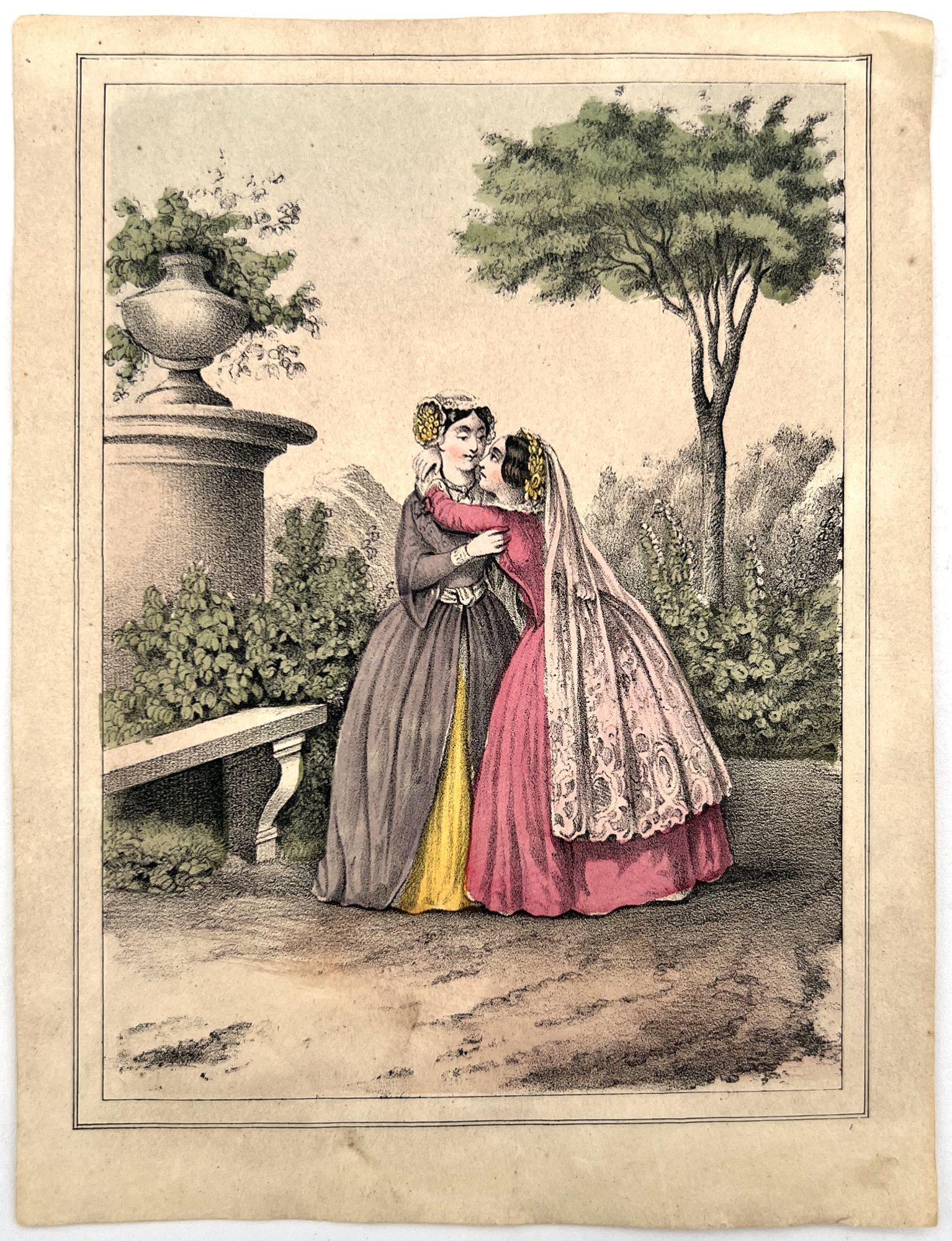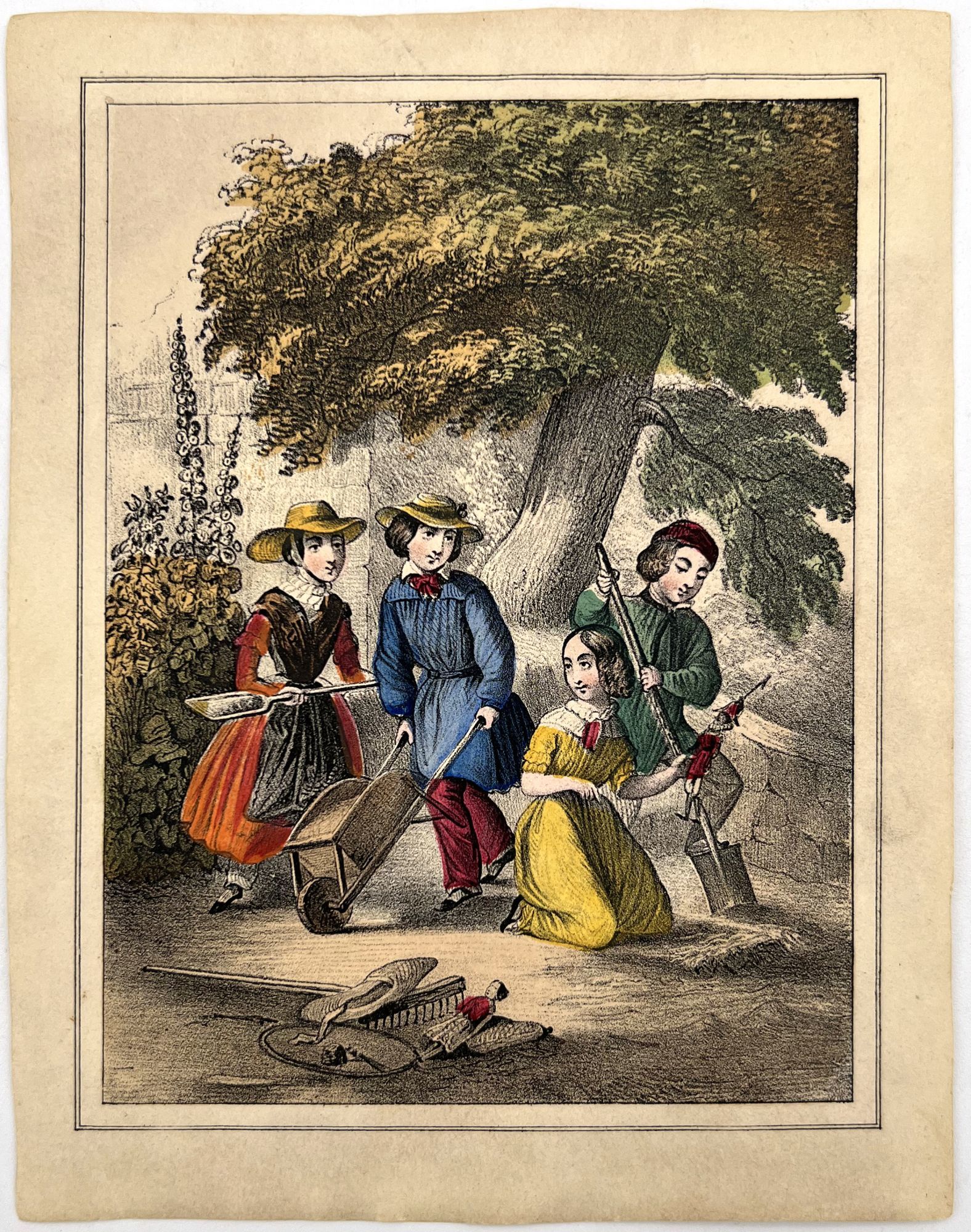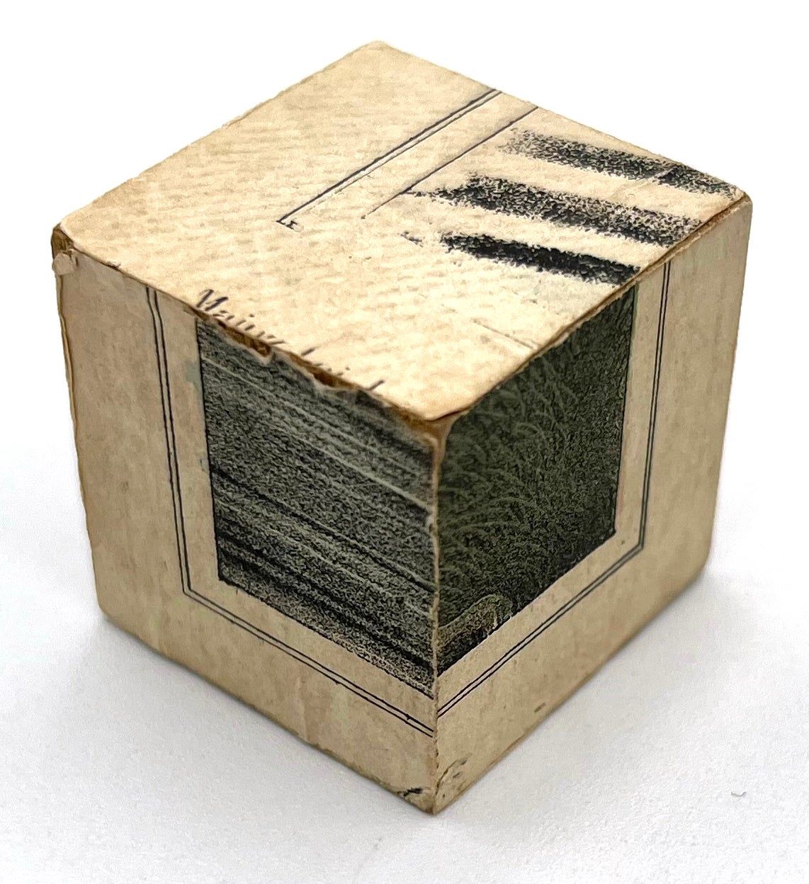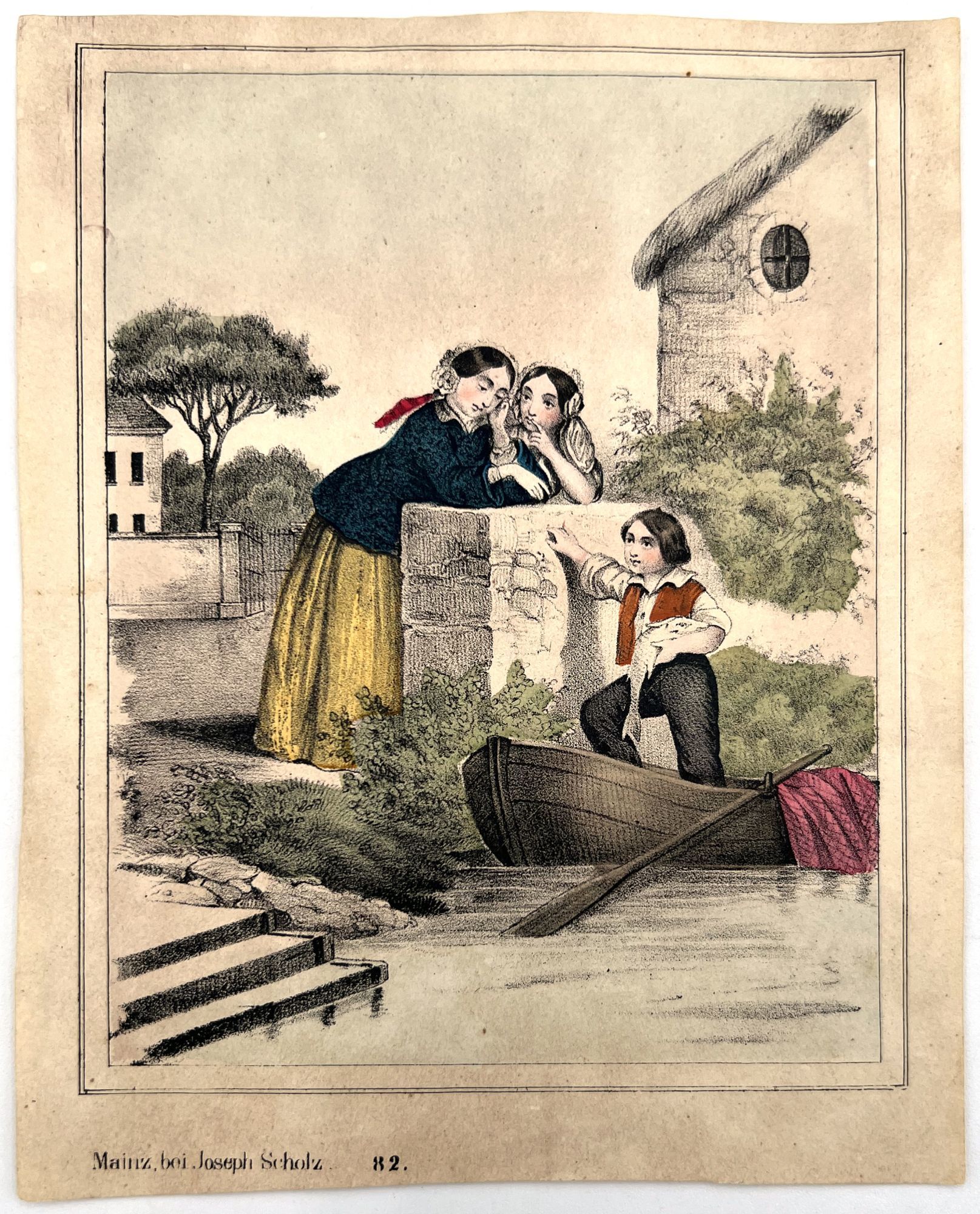 Mainz, Germany: Joseph Scholz, 1840. Good. Complete and intact, with hand coloring still bright. Minor flaws include water staining, edge wear, light toning and dust soiling, and the occasional slight lift of a corner of paper on the blocks or box.. A scarce early Victorian block puzzle, providing children with six (6) puzzles in one tidy box. This example is complete with all twenty (20) blocks, original box with sliding lid, five (5) example prints, and one (1) final example print pasted to the upper lid of the box. Produced by Joseph Scholz of Mainz, Germany, for the British and German toy markets. The scenes are highly attractive and depict outdoor pastoral scenes of children playing with toys, fishing, flying a kite, or blowing bubbles. Each print and the blocks are lithographed with additional hand coloring. The prints each measure approx. 6.25" by 5". The box measures approx. 7.5" by 6.25" by 2.25", and is adorned with decorated paper. Each block measures approx. 1.25" by 1.25" by 1.25", and the complete assembled puzzle measures approx. 6.25" by 5" by 1.25" Joseph Scholz of Mainz, Germany was a prominent publisher of children's books, prints, and toys, producing everything from toy theaters to board games. His style is marked by well executed hand-colored lithography, and attractive imagery of animals and childhood.