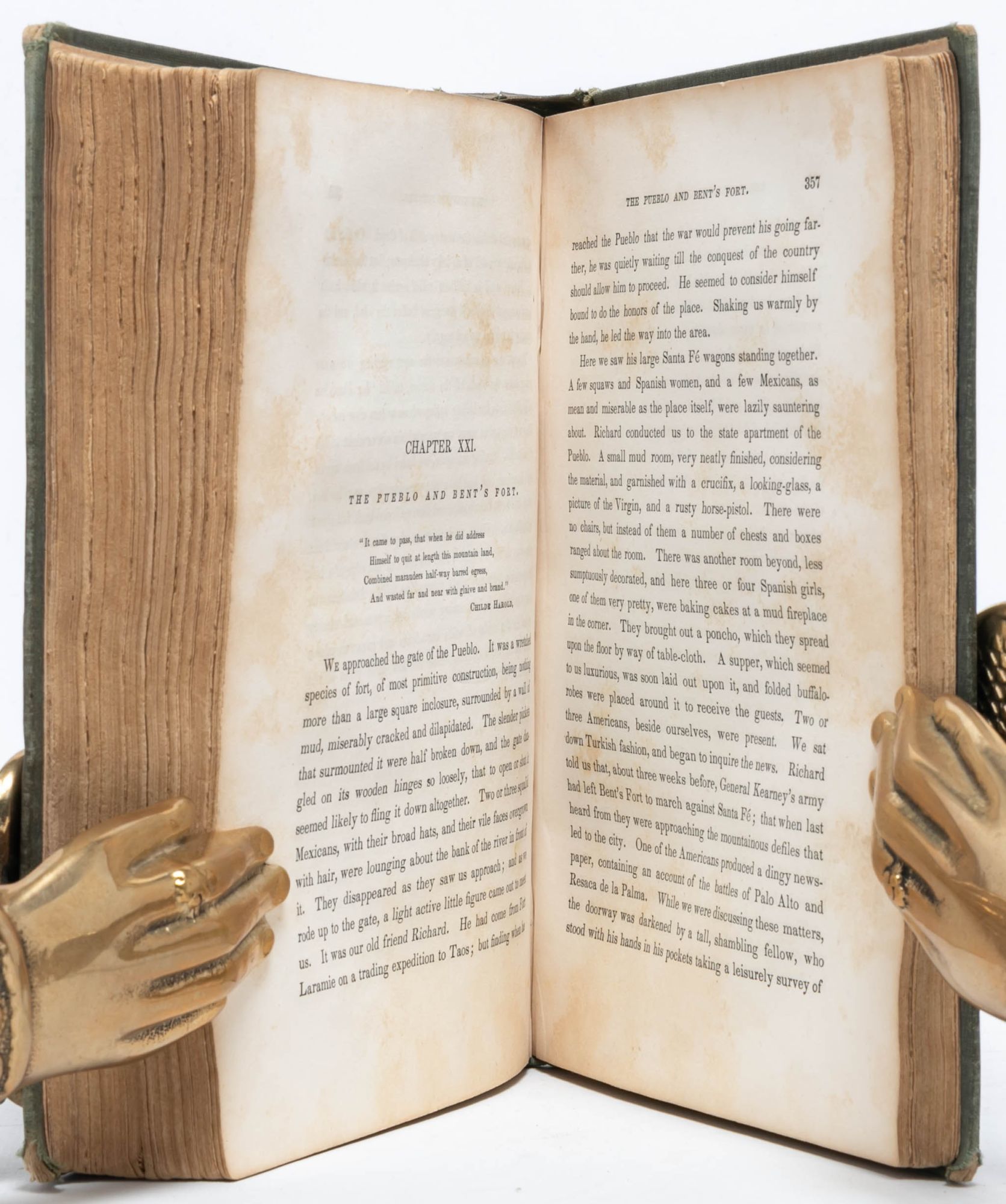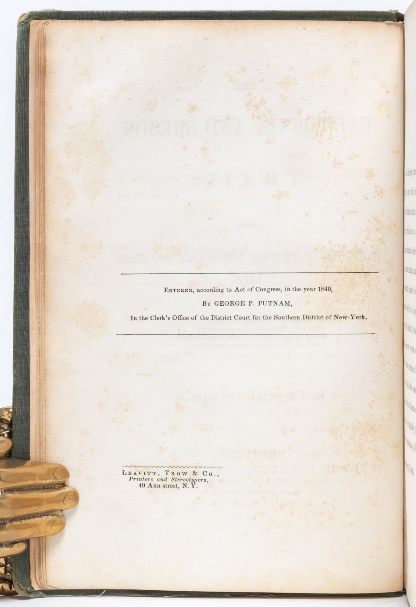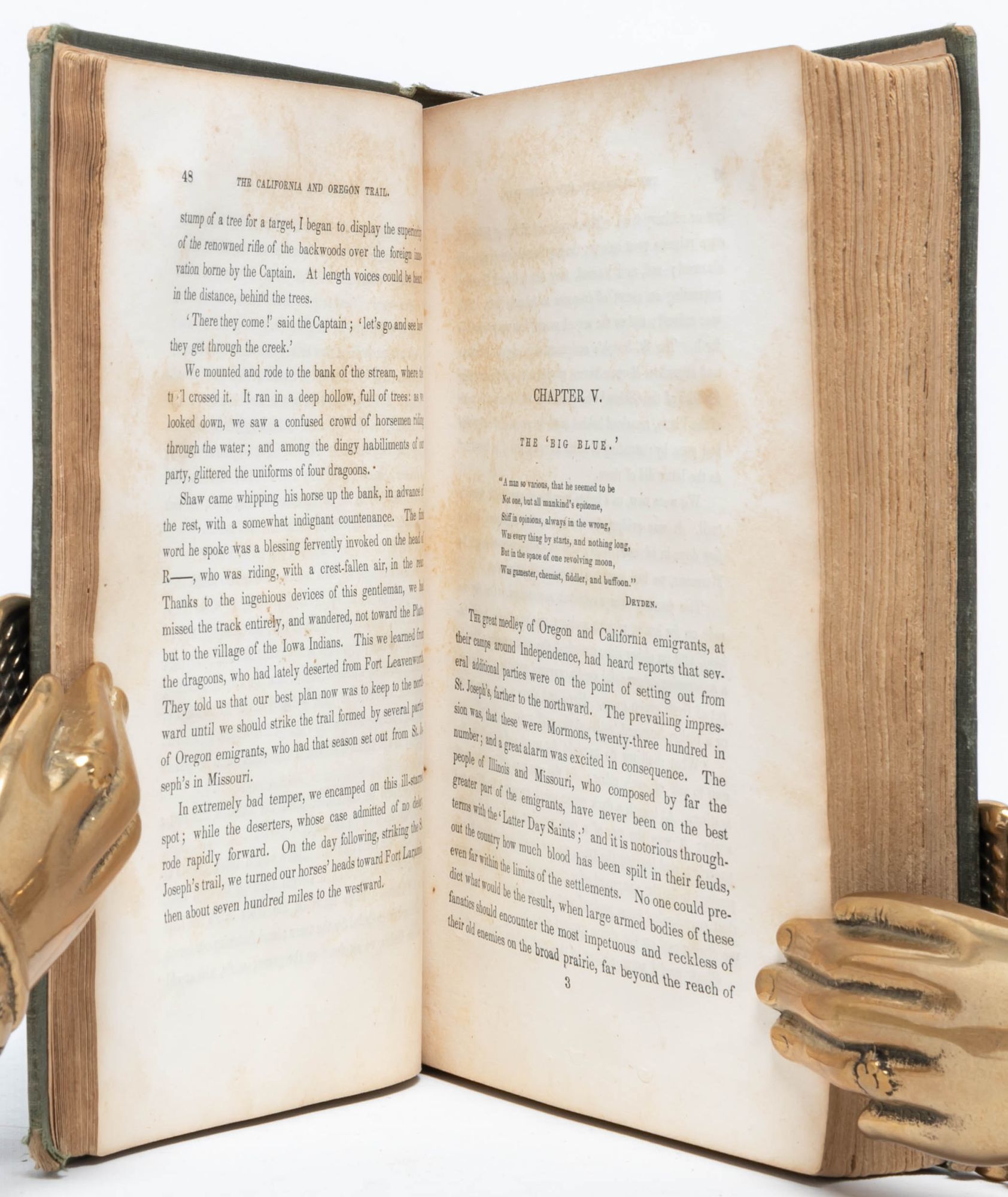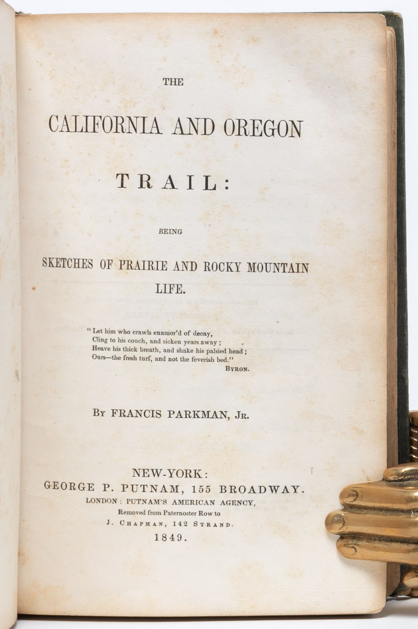 A firsthand account of a summer on the Oregon Trail by “the preeminent American historian of his generation” (Boston Athenaeum). Francis Parkman (1823 – 1893), who undertook the voyage when he was just twenty-three, spent two months on the trail, during which he hunted buffalo with members of the Oglala Lakota Nation and recorded many other scenes of life in the west. Printing and the Mind of Man calls the buffalo hunt "[T]he portion of the narrative which is not only the most vivid, but also of greatest historical value... Parkman has given us a unique picture of life in a Sioux village before it was changed and eventually destroyed by contact with the white man" (PMM 327).