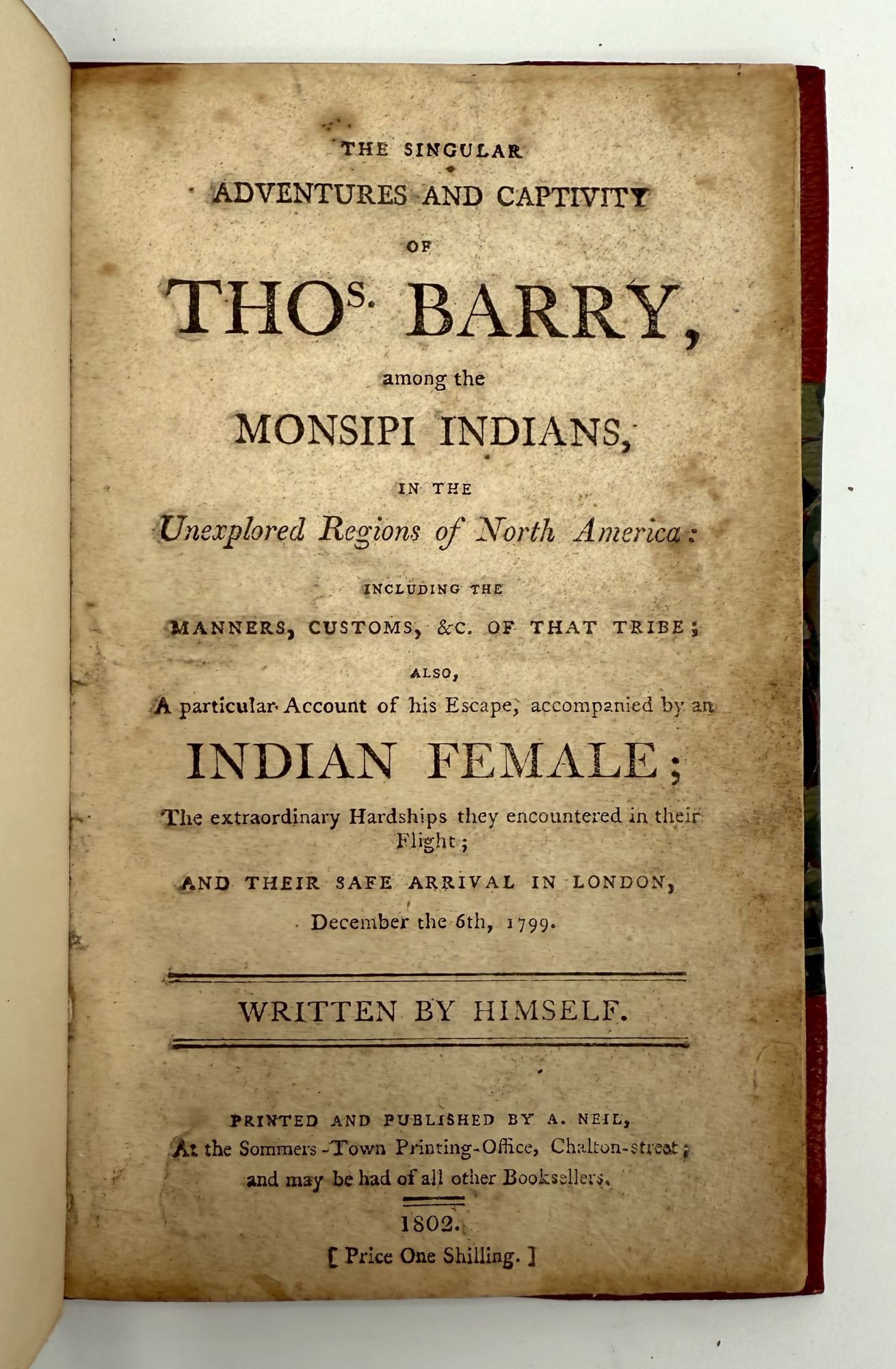 Sommers-Town [London]: Printed and Published by A. Neil, 1802. Second edition. Frontispiece in facsimile. [iii]-vii, [1], [9]-62pp. Lacks half-title. 12mo. Later half red morocco and marbled paper covered boards. Provenance: George Walker Cole (inscription on front endpaper). Second edition. Frontispiece in facsimile. [iii]-vii, [1], [9]-62pp. Lacks half-title. 12mo. The rare second edition of this engaging, though likely ficticious, narrative and Indian captivity, following the first edition published in Sommers Town, England in 1800. Thomas Barry, originally of Waterford, Ireland, emigrated to Charleston, South Carolina on May 20, 1790 with intentions of joining his uncle in mercantile ventures. Here he provides a glowing description of the bustling city, including estates on the banks of the Ashley and Cooper rivers. He passed the next six years in prosperity and enjoyed his developing relationship with Ms. Eliza Wilson. But Barry's situation took a tragic turn.