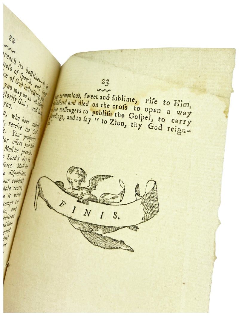 Stockbridge, MA: H. Willard, at the Office of H. Jones & Co, 1801. Very Good. Stockbridge, MA: Printed by H. Willard, at the Office of H. Jones & Co., 1801. First Edition. Small octavo; stitched self-wrappers; 23,[1]pp.; cherubic woodcut Finis concluding p. 23. Rather dark damp staining affecting margins of the majority of leaves, else a Very Good, pleasingly untrimmed sermon.