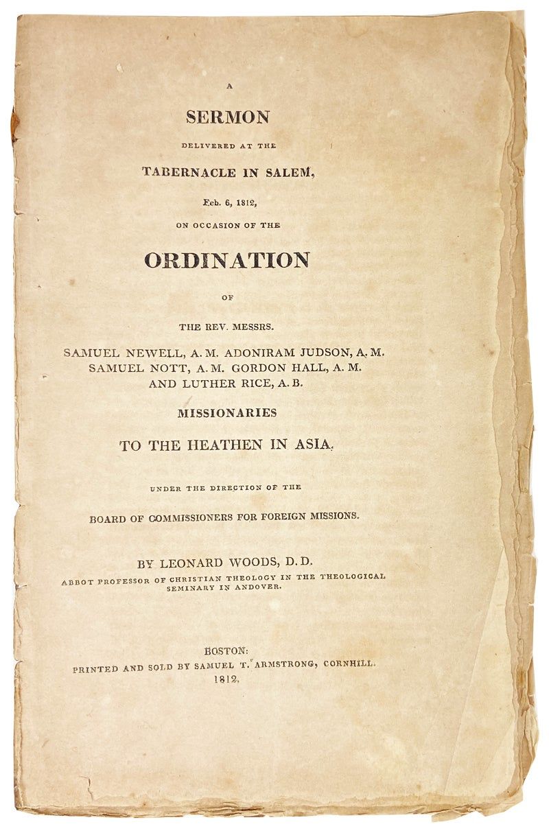A Sermon Delivered at the Tabernacle in Salem, Feb. 6, 1812, on occasion of the ordination of the Rev. Messrs. Samuel Newell, A.M. Adoniram Judson, A.M. Samuel Nott, A.M. Gordon Hall, A.M. and Luther Rice, A.B. Missionaries to the Heathens in Asia. Under the Direction of the Board of Commissioners for Foreign Missions