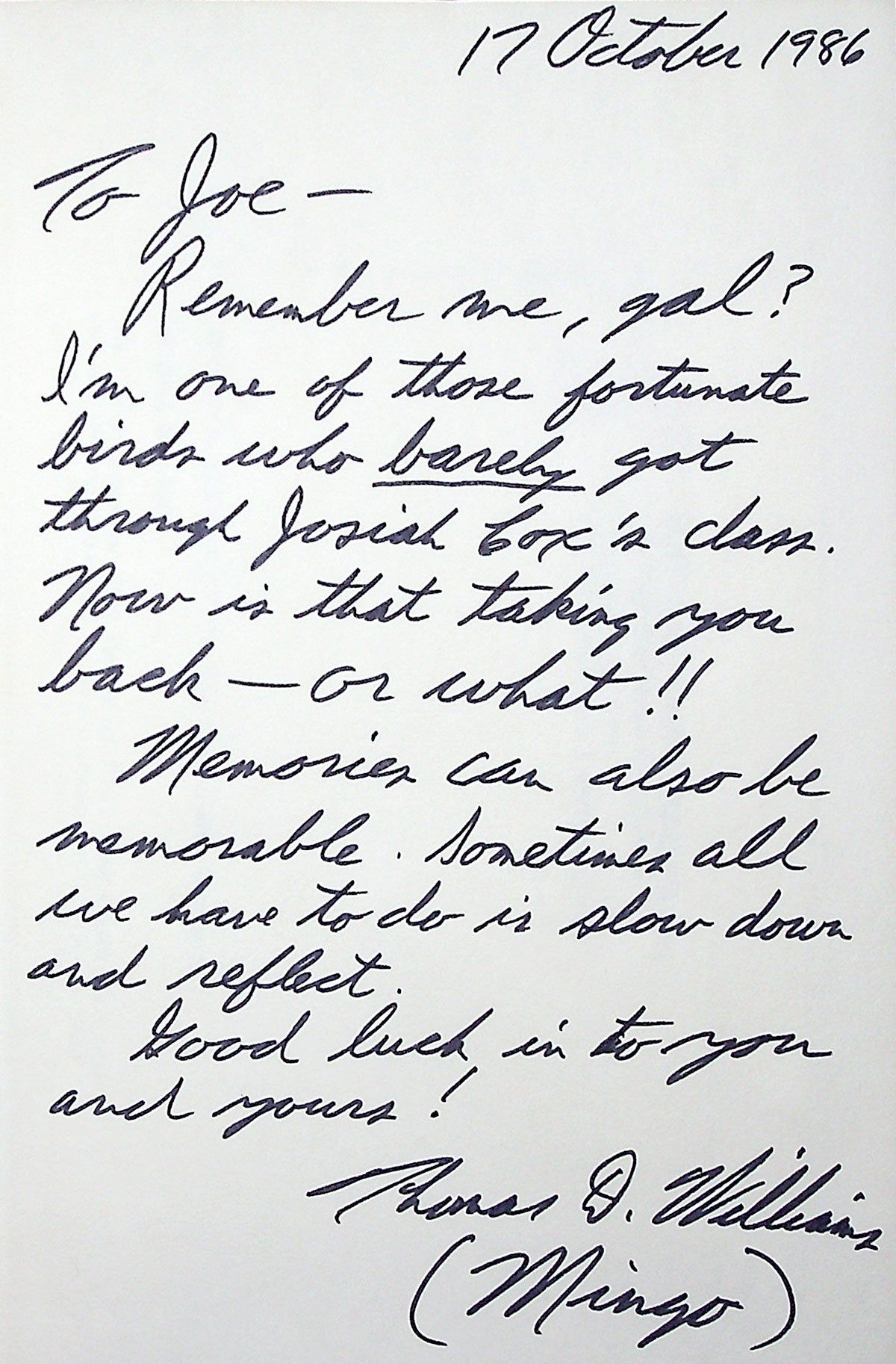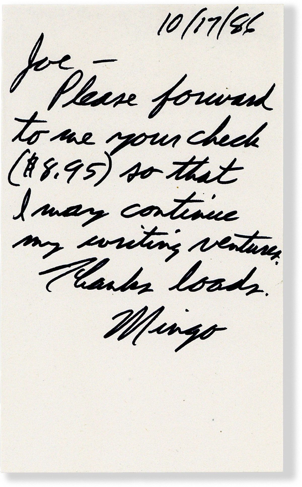 New York: Vantage Press, 1982. First Edition. First Printing. Octavo (21cm); red cloth, with titles stamped in black on spine; dustjacket; [iv],203,[1]pp. Lengthily inscribed by the author on the front endpaper: "17 October 1986 / To Joe – Remember me, gal? I'm one of those fortunate birds who barely got through Josiah Cox's class. Now is that taking you back – or what!! Memories can also be memorable. Sometimes all we have to do is slow down and reflect. Good luck in to you and yours! Thomas D. Williams (Mingo). Laid into this copy is a short ANS from Williams to the recipient, along with his business card. Spine ends gently nudged, faint paper-clip impression to upper margin of title page and the following two leaves; very Near Fine. Dustjacket is unclipped (priced $8.95), with light wear to extremities, and a few tiny tears; Near Fine. Debut novel by this African American author, set during and after the Vietnam War, with the story revolving around three central characters: Hubert Jackson (a Black Marine private), Lo Quan Duc (a Vietcong guerilla), and Tony Martinelli (an Air Force pilot and son of a Mafia chieftain). Not in Blockson, and not in Newman (Vietnam War Literature: An Annotated Bibliography); OCLC notes 11 holdings.