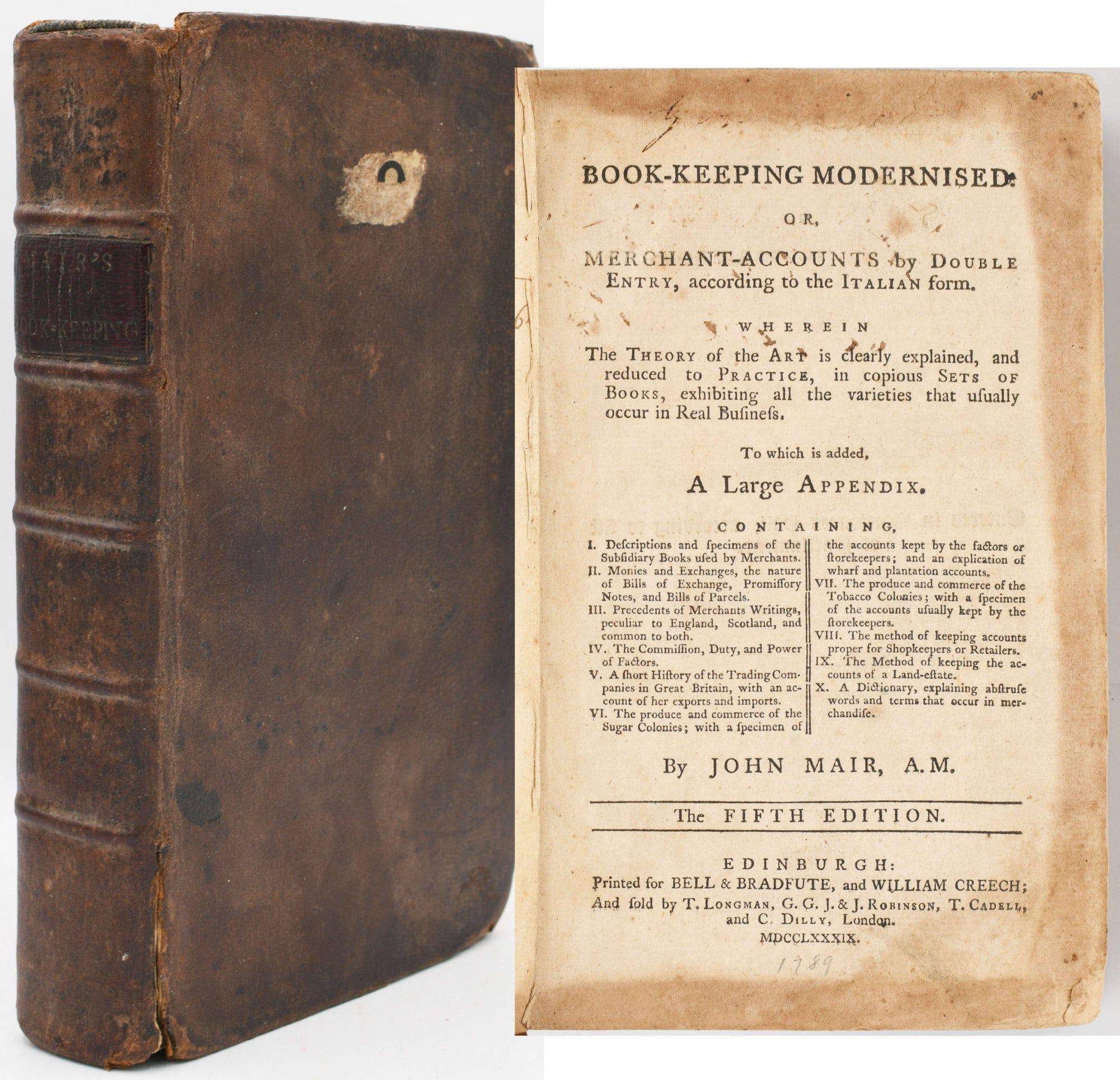 Edinburgh: Bell & Bradfute, and William Creech, 1789. The Fifth Edition. Full Leather. Very Good binding. 8vo.; in full calf with raised bands to the spine and a morocco label. there is wear to the extremities, and a partial label adhered to the upper board. xi, [1]. 620 pages, including an Appendix; lacking the front endpaper.~~John Mair is regarded as the most successful author of accounting techniques in the 18th century. Very Good binding.