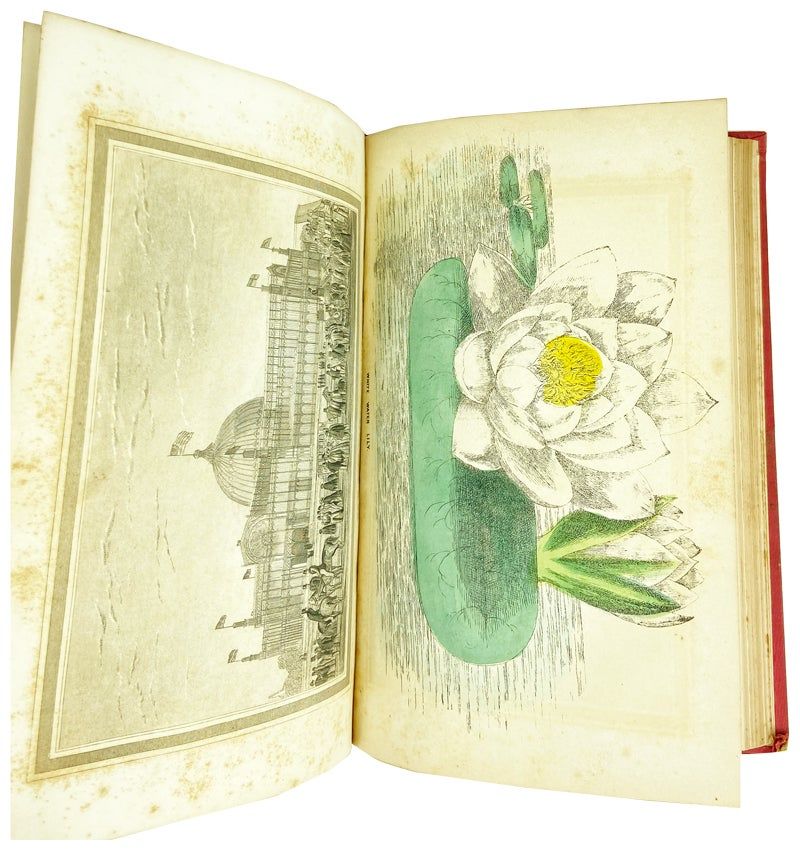 Boston: Cyrus Stone, 1853. Very Good. Boston: Cyrus Stone, 1853. First Edition. Two parts in one volume; octavo (22.5cm.); publisher's red pictorial cloth embossed in blind and gilt; 203; [4]-204pp. (complete despite pagination?); double frontispiece of two engravings, one of them hand-colored; ten leaves of plates throughout, half of them hand-colored plant specimens, myriad text illus. throughout. Cloth a bit scuffed at margins with exposure at corners, tiny chips at spine ends, plates foxed, else a Very Good and sound example.