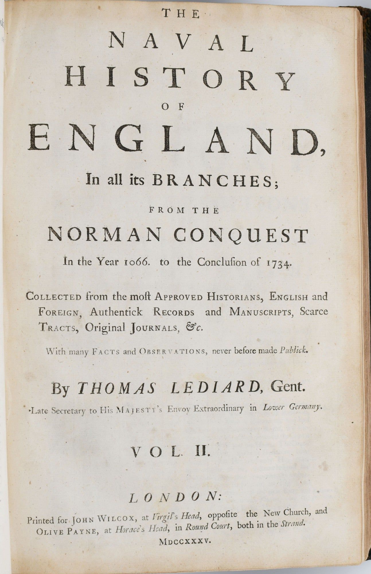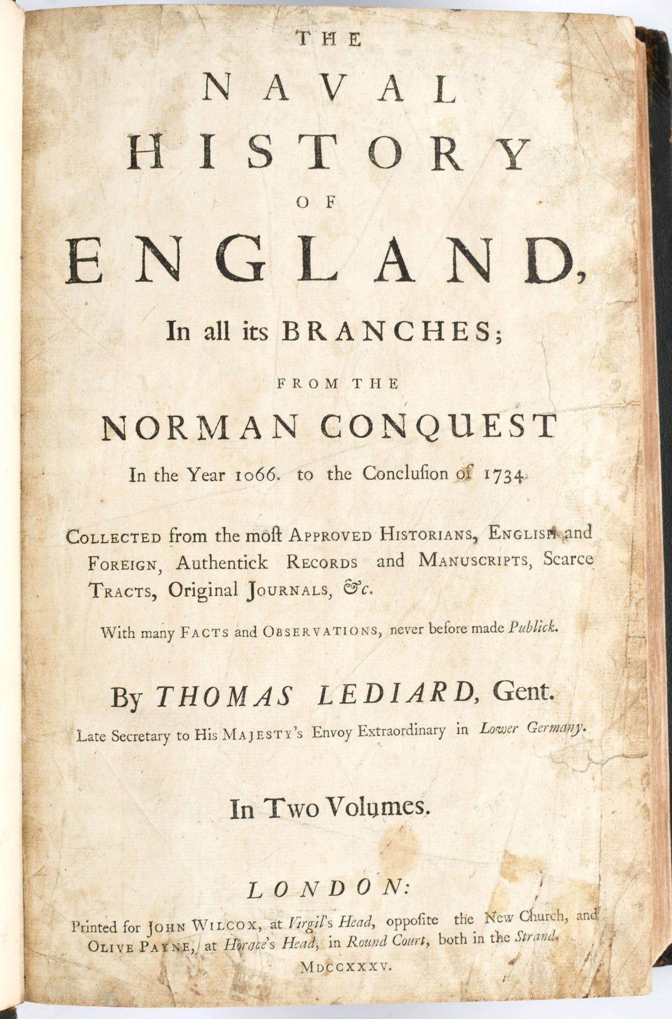 [BRITISH NAVY] THE NAVAL HISTORY OF ENGLAND IN ALL ITS BRANCHES; FROM THE NORMAN CONQUEST IN THE YEAR 1066, TO THE CONCLUSION OF !734. COLLECTED FROM THE MOST APPROVED HISTORIANS, ENGLISH AND FOREIGN, AUTHENTIC RECORDS AND MANUSCRIPTS, SCARCE TRACTS, ORIGINAL JOURNALS, ~&c. WITH MANY FACTS AND OBSERVATIONS NEVER BEFORE MADE PUBLICK. IN TWO VOLUMES