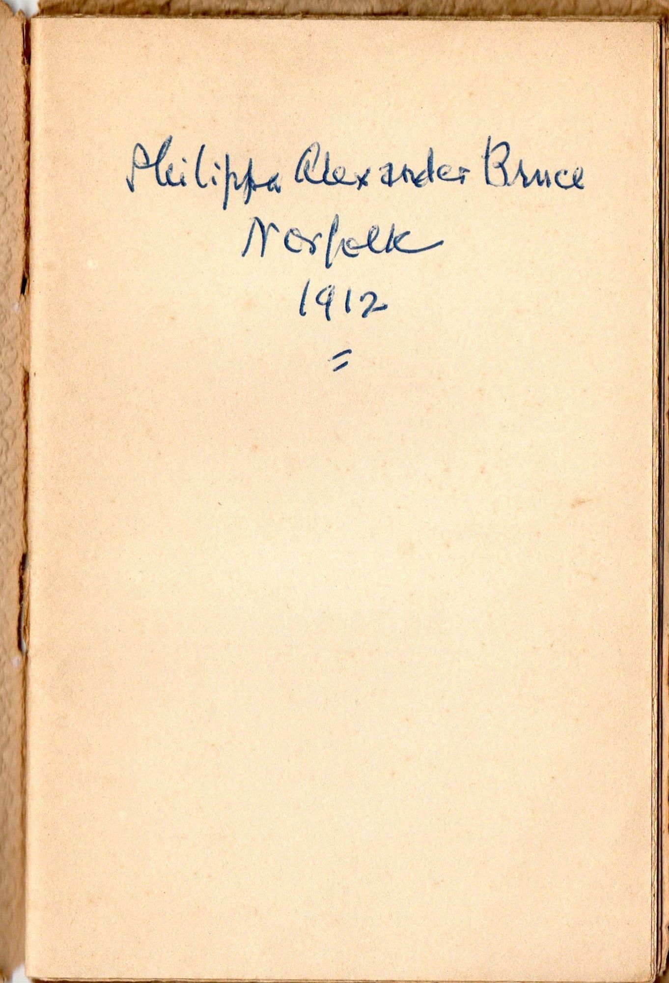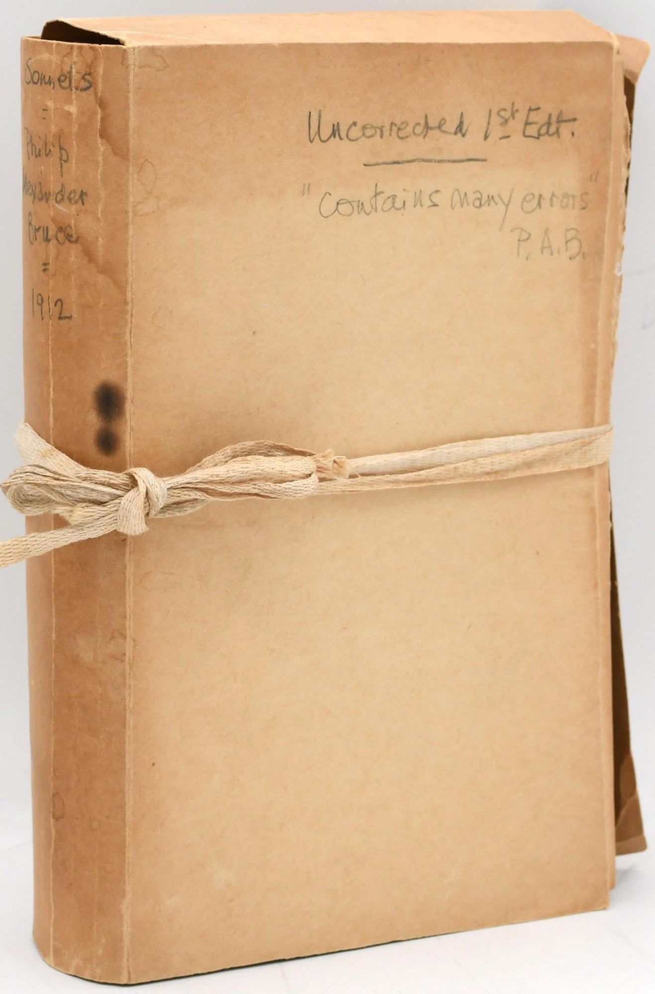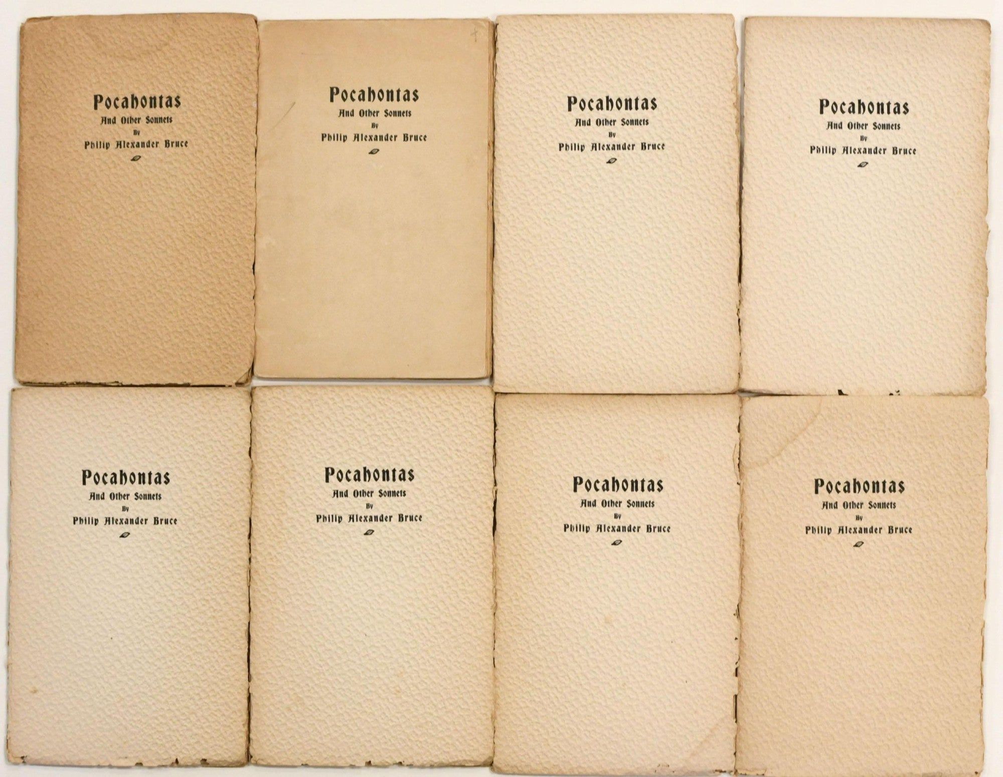 Norfolk, VA, 1912. Uncorrected 1st edition “contains many errors” per the annotation on the front of the homemade book cradle containing 8 copies of the volume. Each has 30 pages, with one poem per page. Top copy is more worn, darkened, with small water damage at top edge. Annotated inside, “Philippa Alexander Bruce Norfolk 1912”. 7 of 8 copies covered with textured paper; last is smooth. Bottom copy shows water damage at top edge; annotated inside with, “From a package marked ‘uncorrected copies’ by P.A.B. P.A.B.S”.