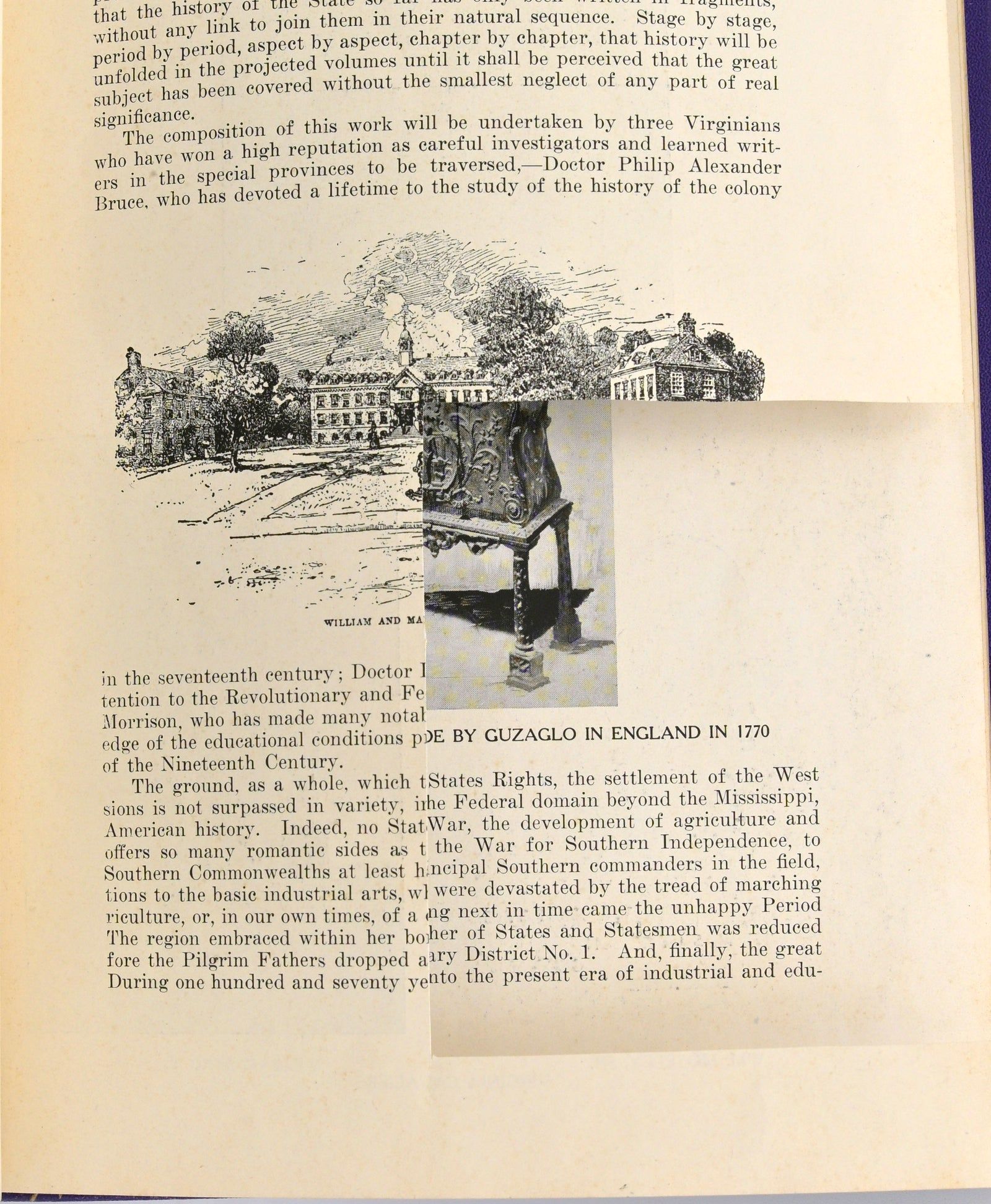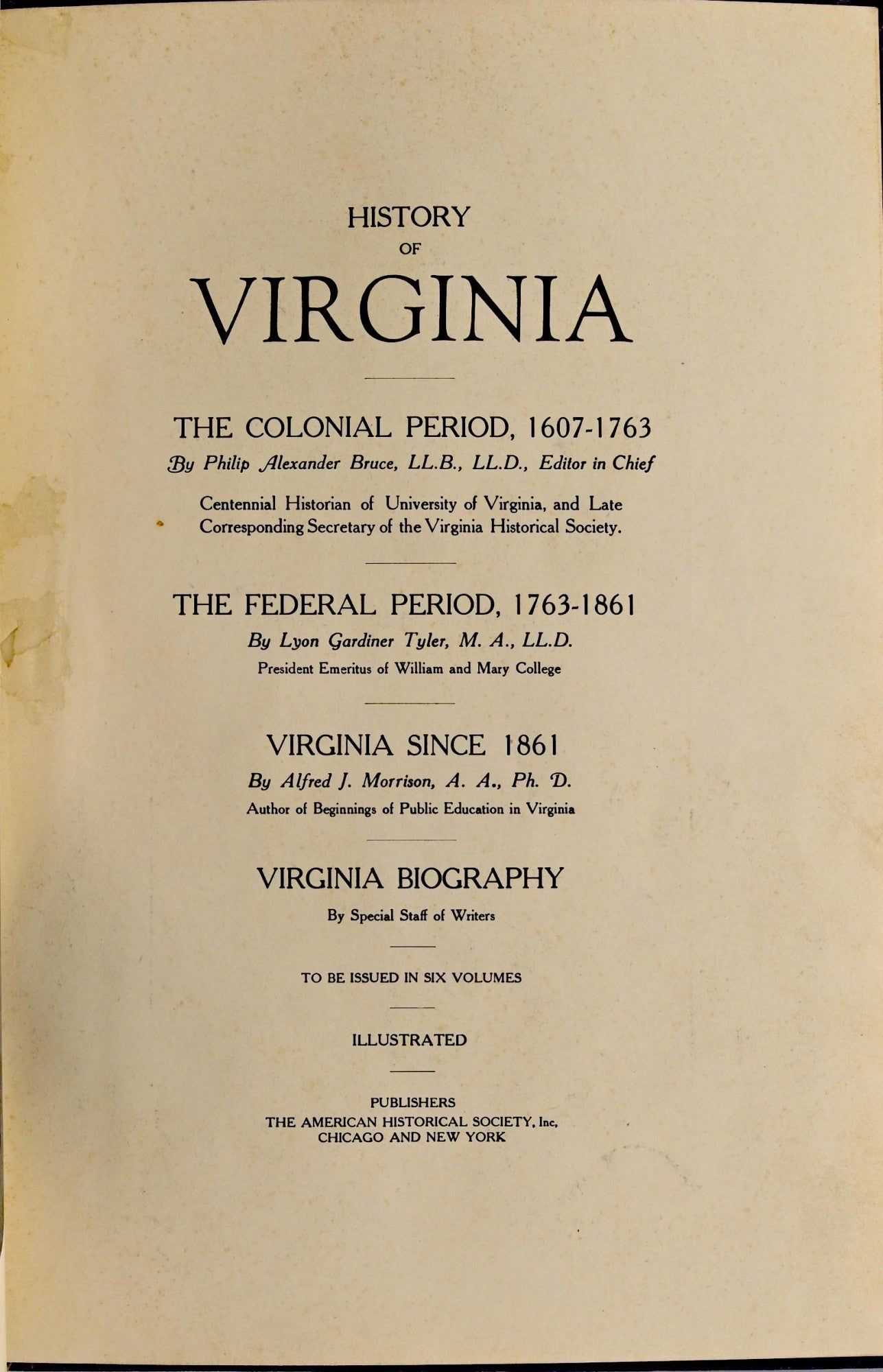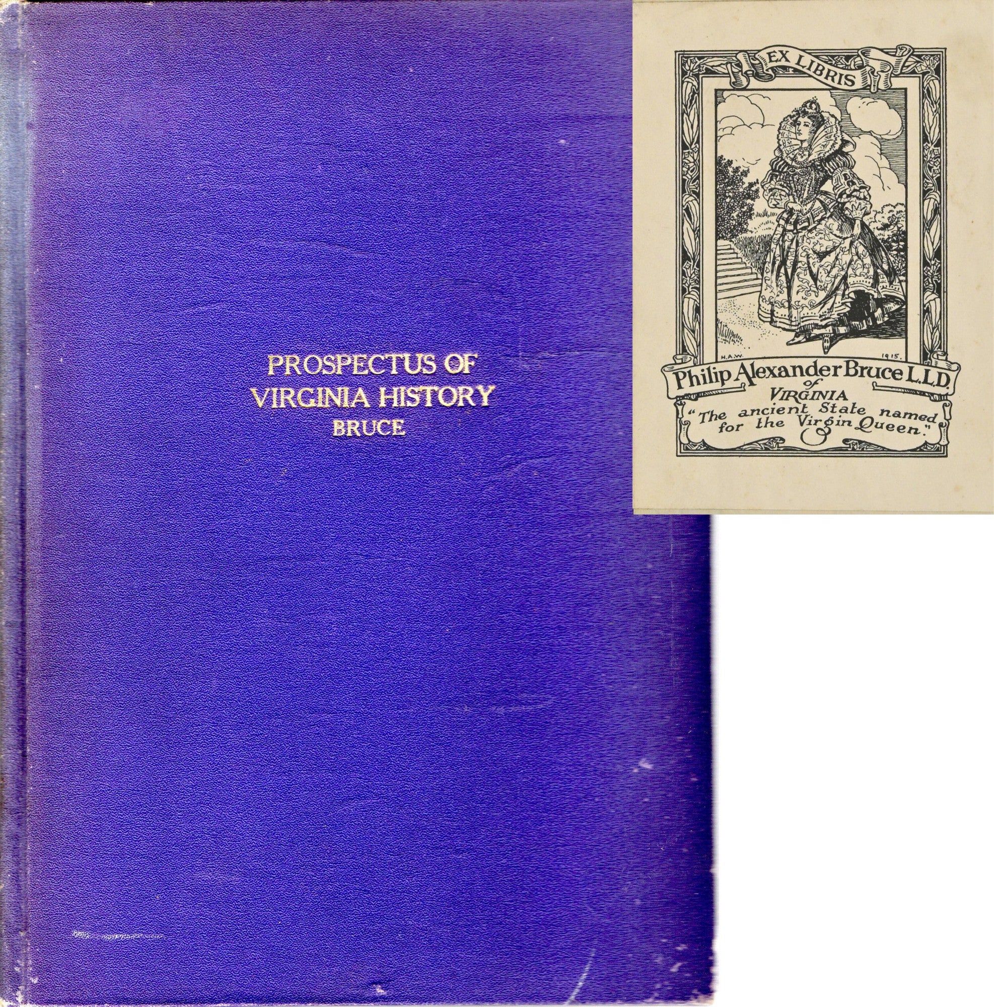 Chicago & New York: The American Historical Society. 10 ¼” x 7 ¼” blue hardcover with gold title, “Prospectus of Virginia History Bruce”. Contains author’s bookplate. One image cut out with nearby annotation, “The portrait of William Moseley, Sr. removed for framing PABS-1951”. PABS refers to the author’s daughter, Philippa Alexander Bruce Shepperson. Last page contains annotated corrections to text. Small hole in endpaper; small abrasion between title page and opposite. Slight wear to spine.