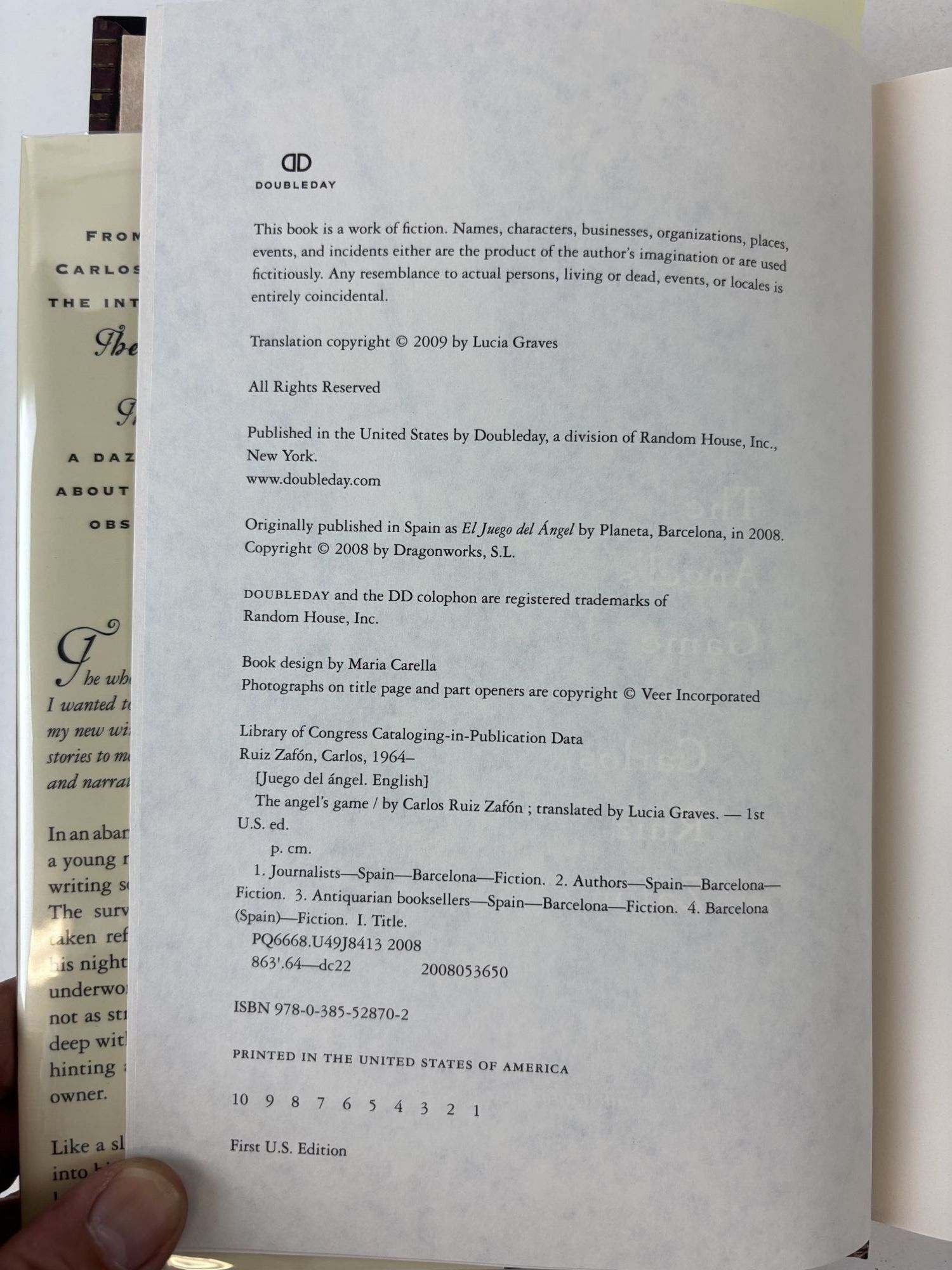 New York: Doubleday, 2009. First U.S Edition, First printing. Hardcover. Octavo, 531 pages. In Very Good condition with a Very Good dust jacket. Brown pictorial spine with white and black text. Dust jacket is protected with a mylar covering with white numbered sticker, price uncut '$26.95'. Signed flat by Carlos Euiz Zafón on half title page. [ ]. 1387332. Special Collections.