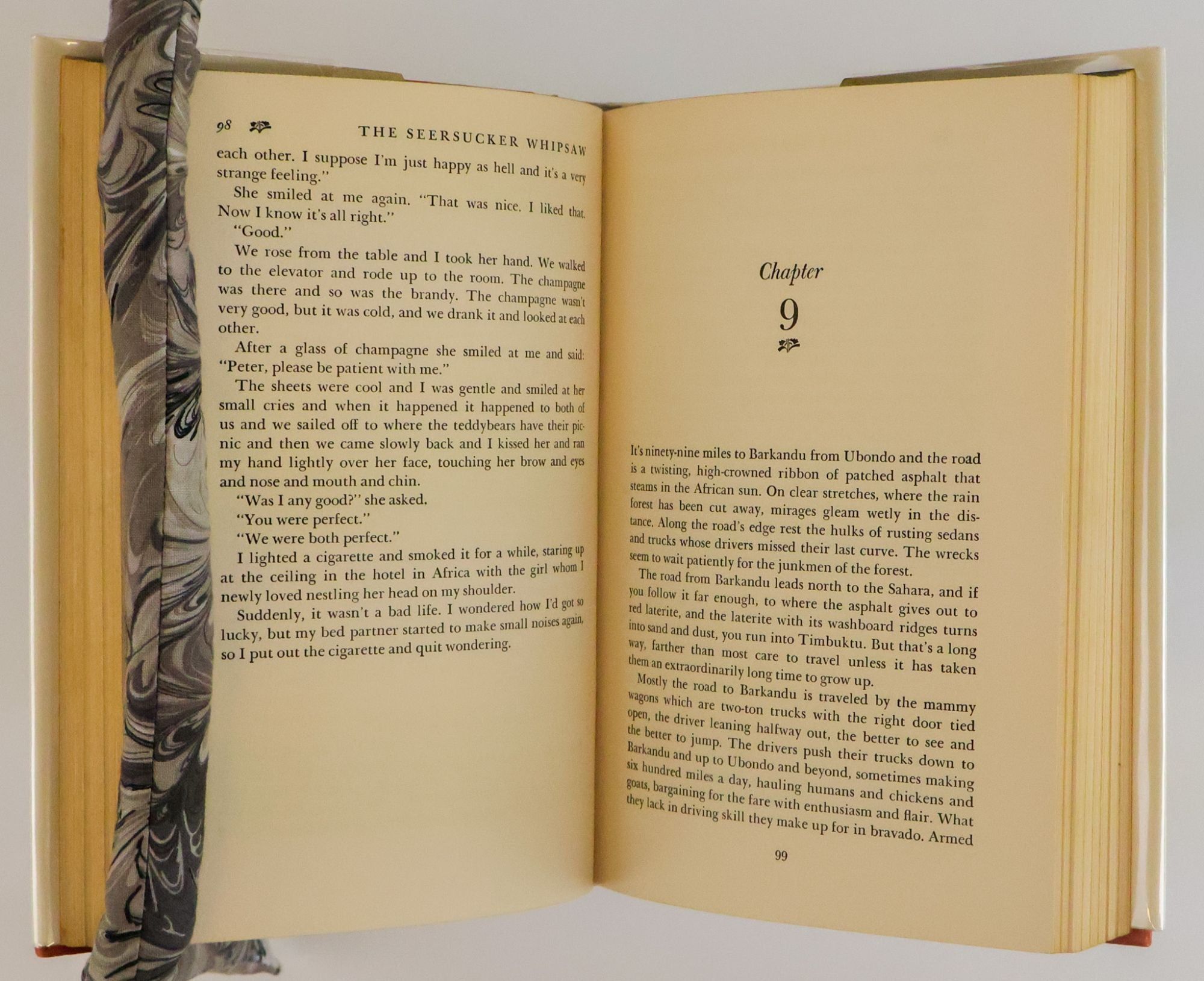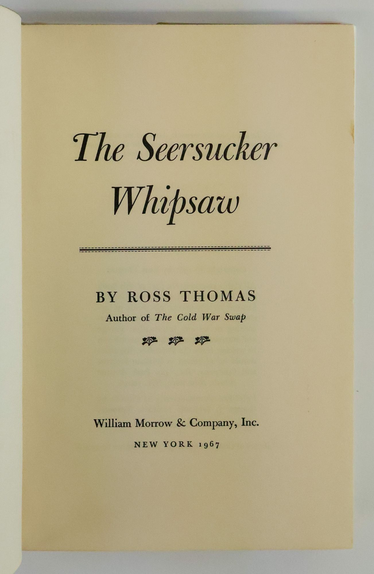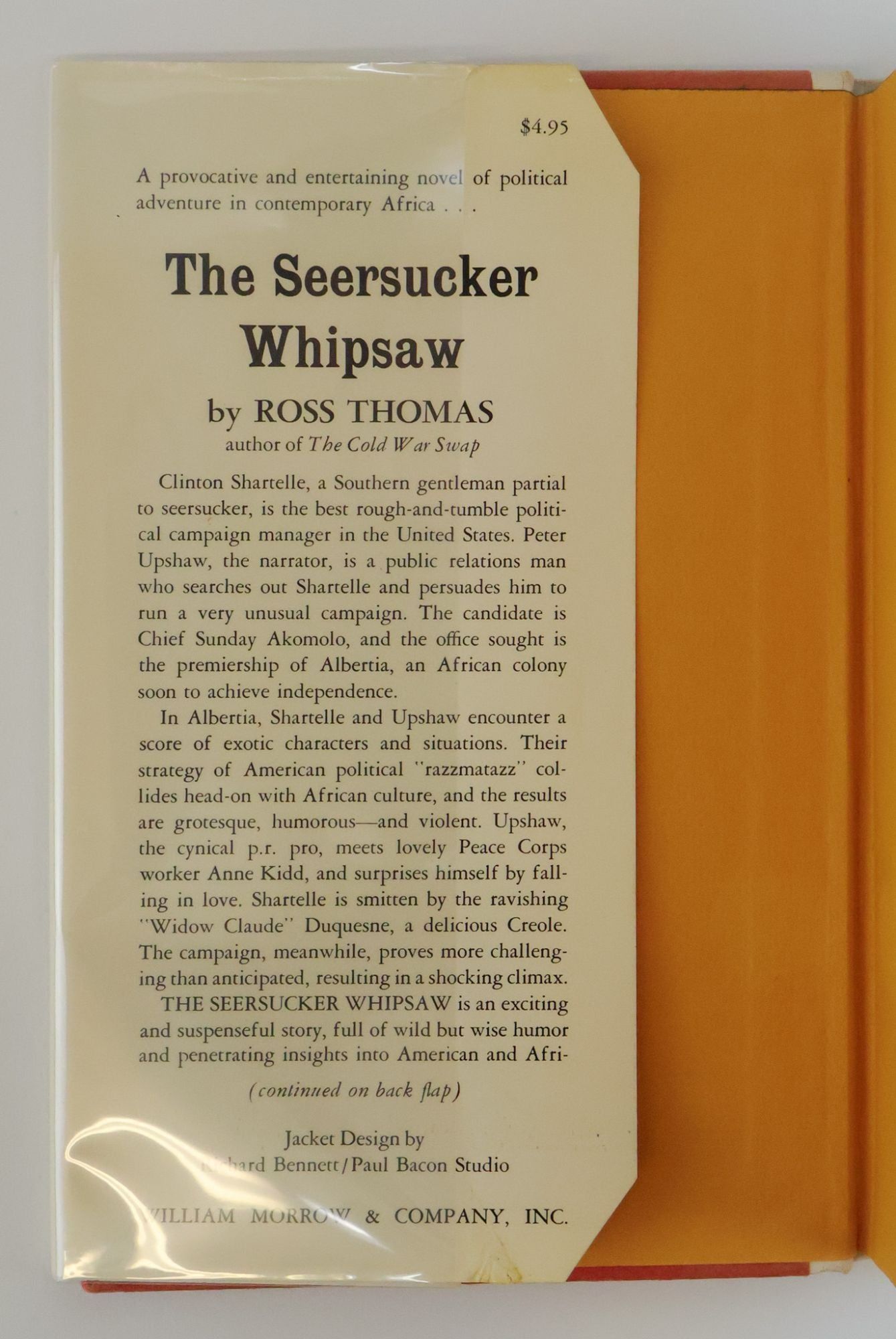 New York: William Morrow & Company Inc, 1967. First Edition, First printing. Hardcover. Octavo, 318 pages. In Very Good Condition with a Very Good condition dust jacket. White spine with black and orange text. Dust jacket is protected with a mylar covering, price uncut '$4.95'. Head edge dyed black. Dust jacket shows minor stain on upper rear corner of spine, minor wear on head and tail edge of spine and upper and lower fore corners. Boards show minor wear throughout. Text block shows age toning on fore and tail edge, mild stains on front paste down and end paper, and very small stain on fore edge of title page. Signed flat by Ross Thomas on front endpaper. THE SEERSUCKER WHIPSAW (1967) garnered notable success for its sharp wit and progressive writing on international politics and Colonial Africa. Ross Thomas received the Edgar Award for Best Debut Novel for THE COLD WAR SWAP in 1967 and the Edgar Award for Best Novel for BRIARPATCH in 1985. Thomas was posthumously awarded the Gumshoe Lifetime Award in 2002.