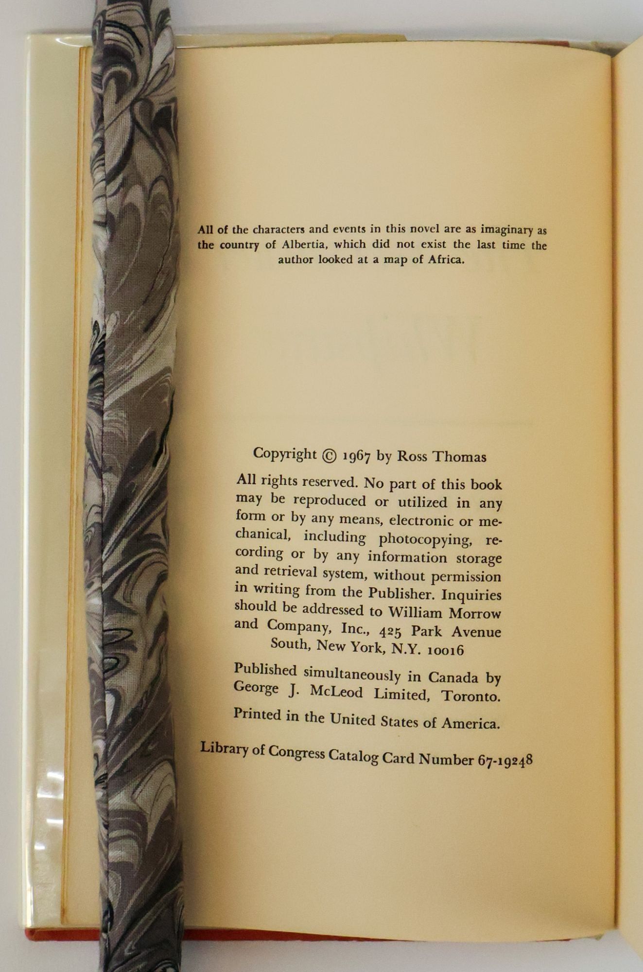 Ross Thomas's service as a soldier of the United States' Army in the Philippines during WWII and as Public Relations Director of the United States, Europe, and Africa prepared him as a writer to explore the injustices behind campaigns and authorities that exploit marginalized countries. This first edition copy is signed by Ross Thomas. 1387353. Special Collections.
