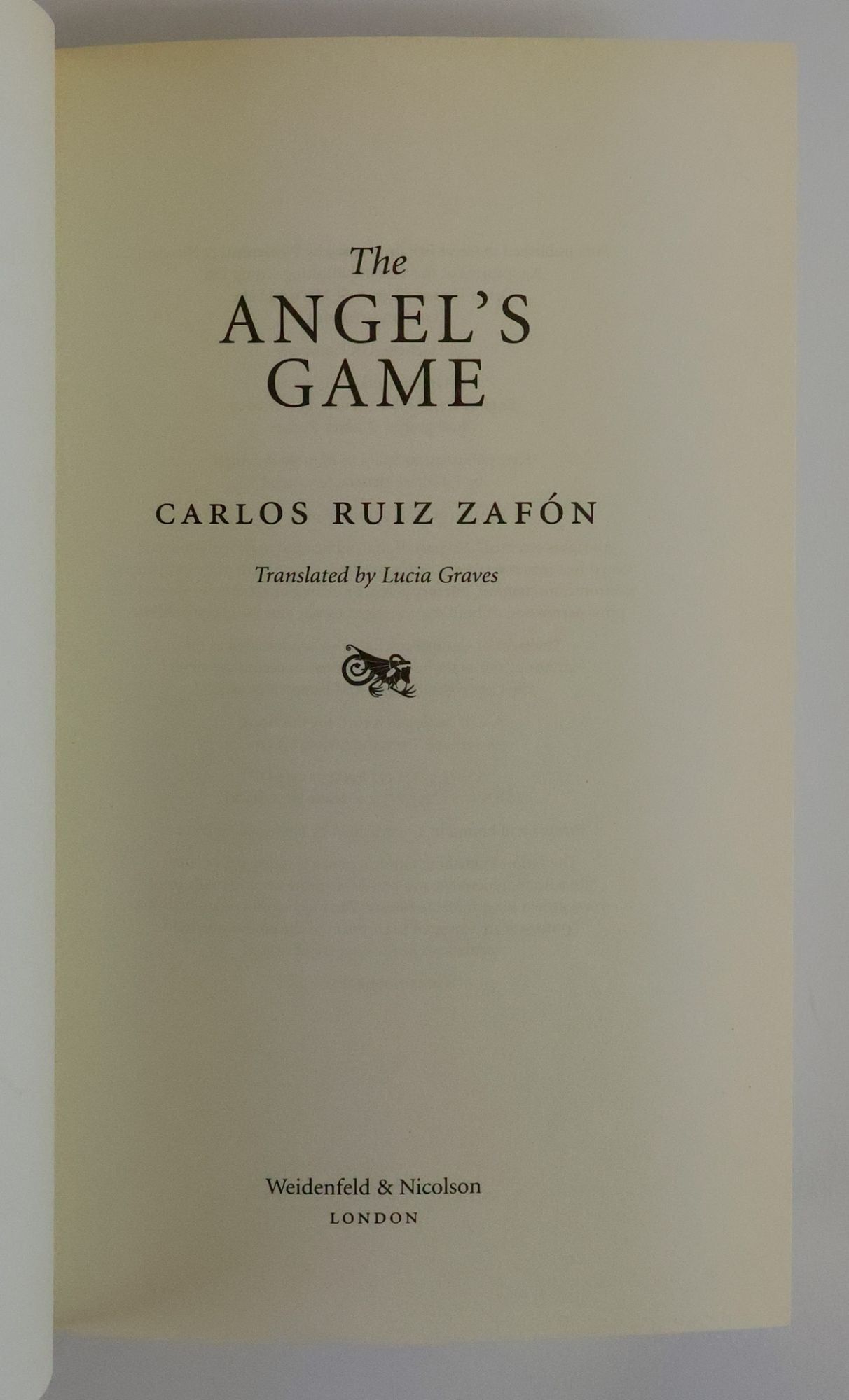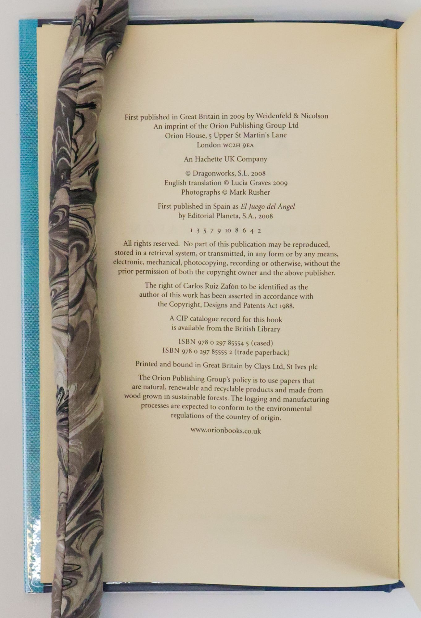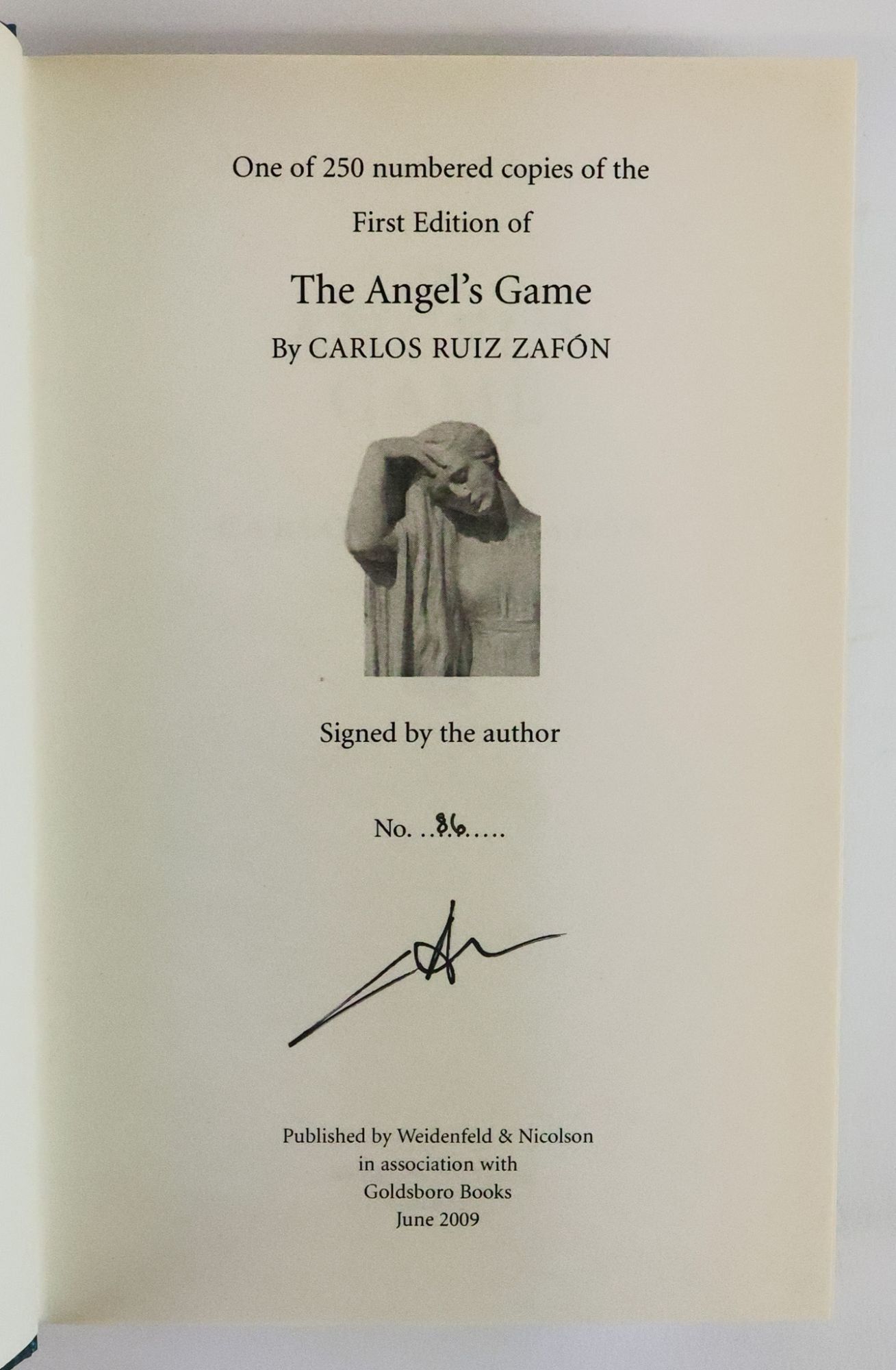 London, UK: Weidenfeld & Nicolson, 2008. Limited UK Edition #86/250, First Printing. Hardcover. Octavo, 441 pages. In Near Fine condition with Near Fine condition dust jacket. Spine is dark blue with metallic red and white lettering. Dust jacket protected by mylar covering, price uncut: "£18.99" on front flap. Contains limited edition bookmark between mylar and front flap of dust jacket. Signed flat and numbered by Carlos Ruiz Zafón, limited edition #86/250. Shelved . 1387409. Special Collections.