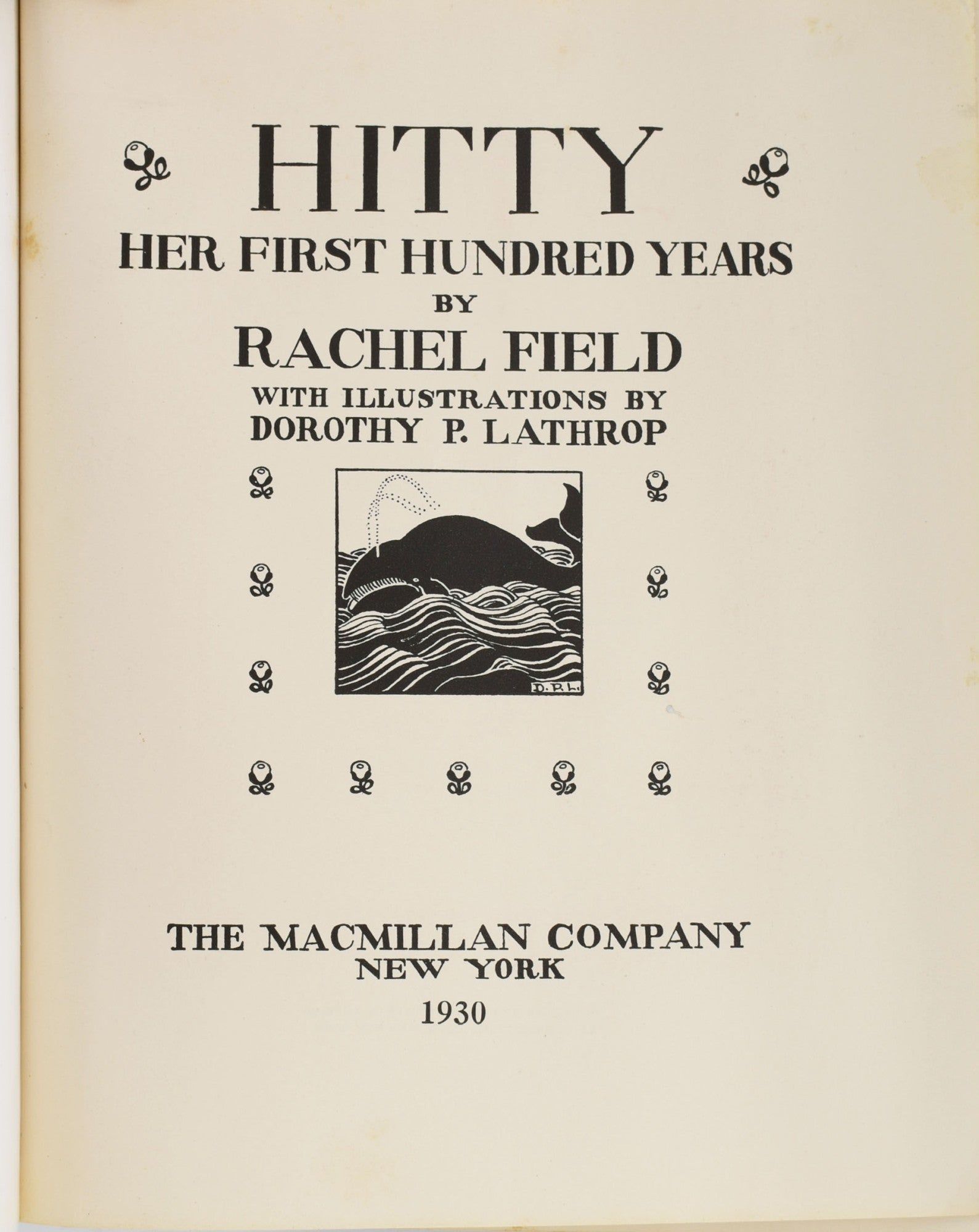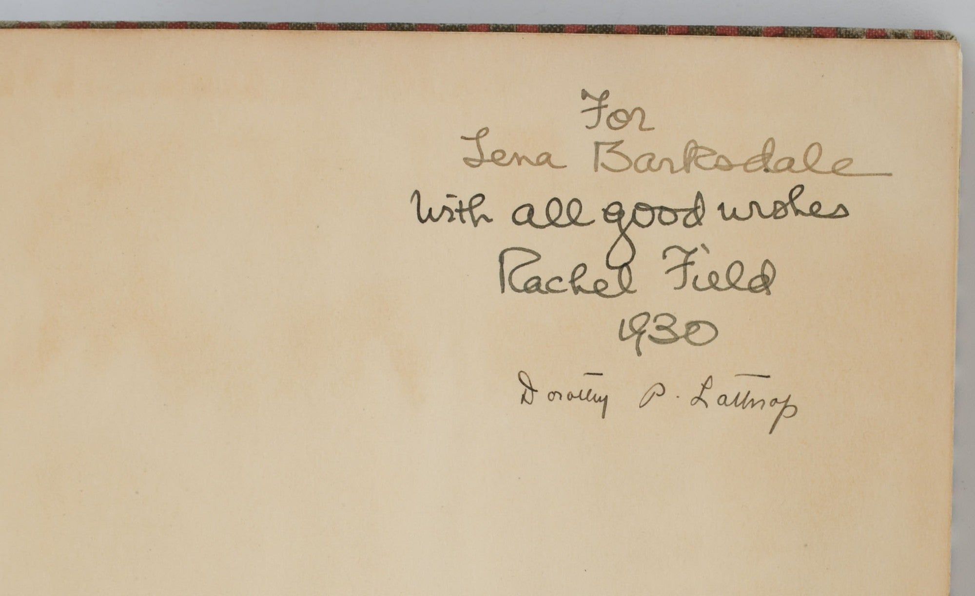 New York: The Macmillan Company, 1930. Fourth Printing. Hard Cover. Very Good binding. Signed. 8vo.; in the publisher’s binding with a paper title label, and lacking the dustjacket; there is minor wear the spine and a bumped corner.~~This early presentation copy is signed by Rachel Field, and by the illustrator Dorothy Lathrop. The copy was presented to children’s book author Lena Barksdale. Very Good binding.