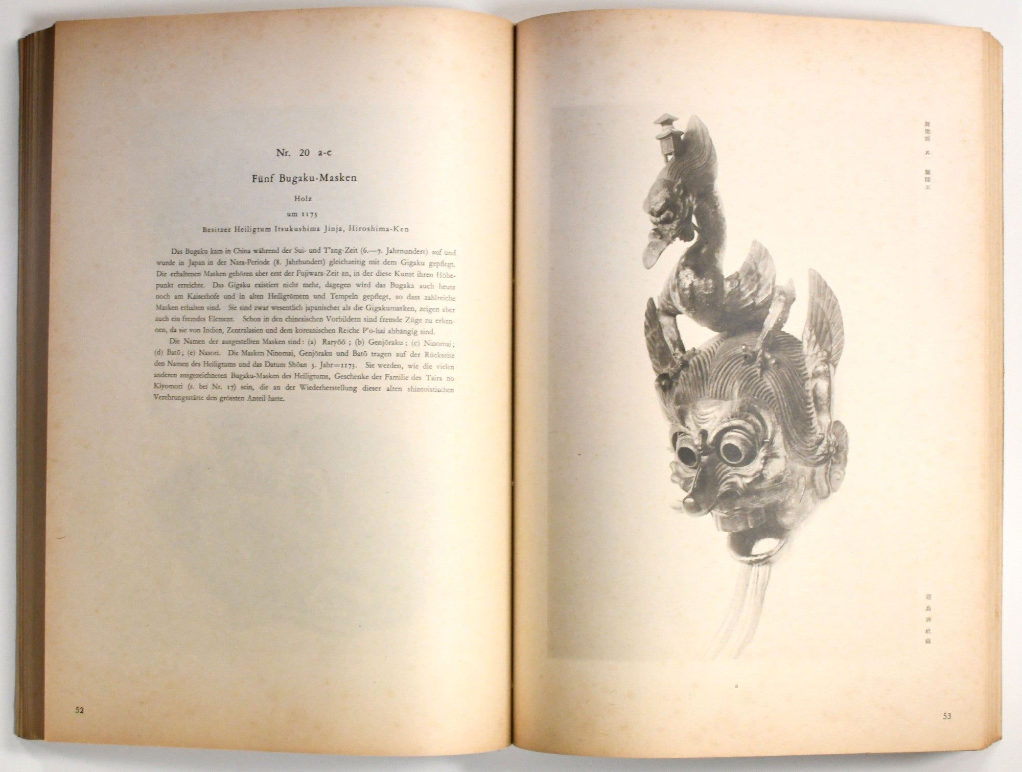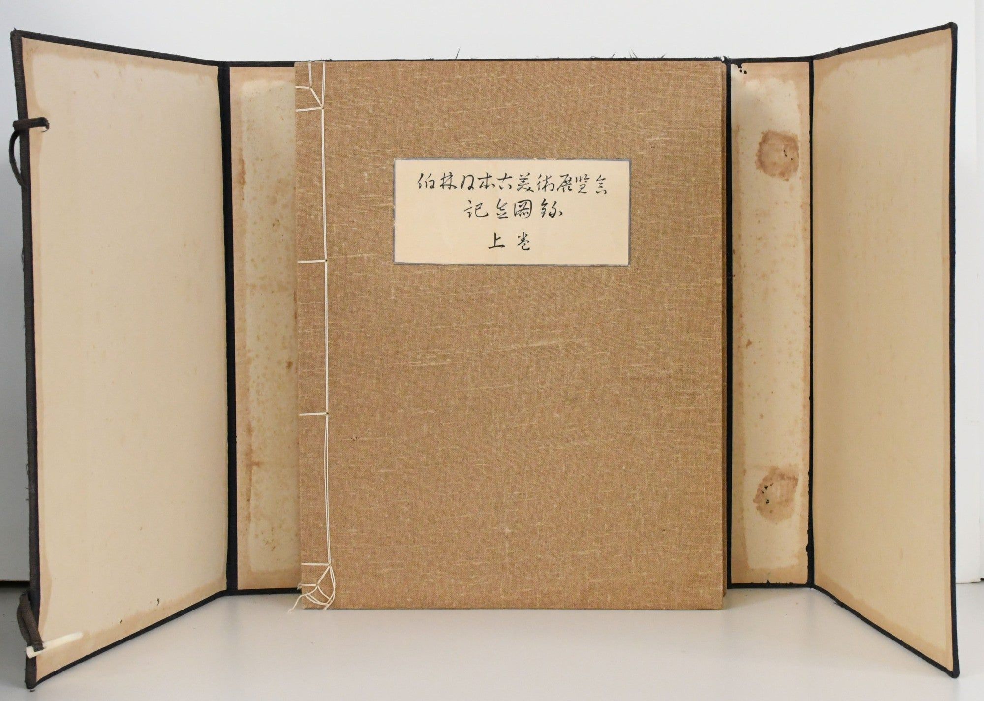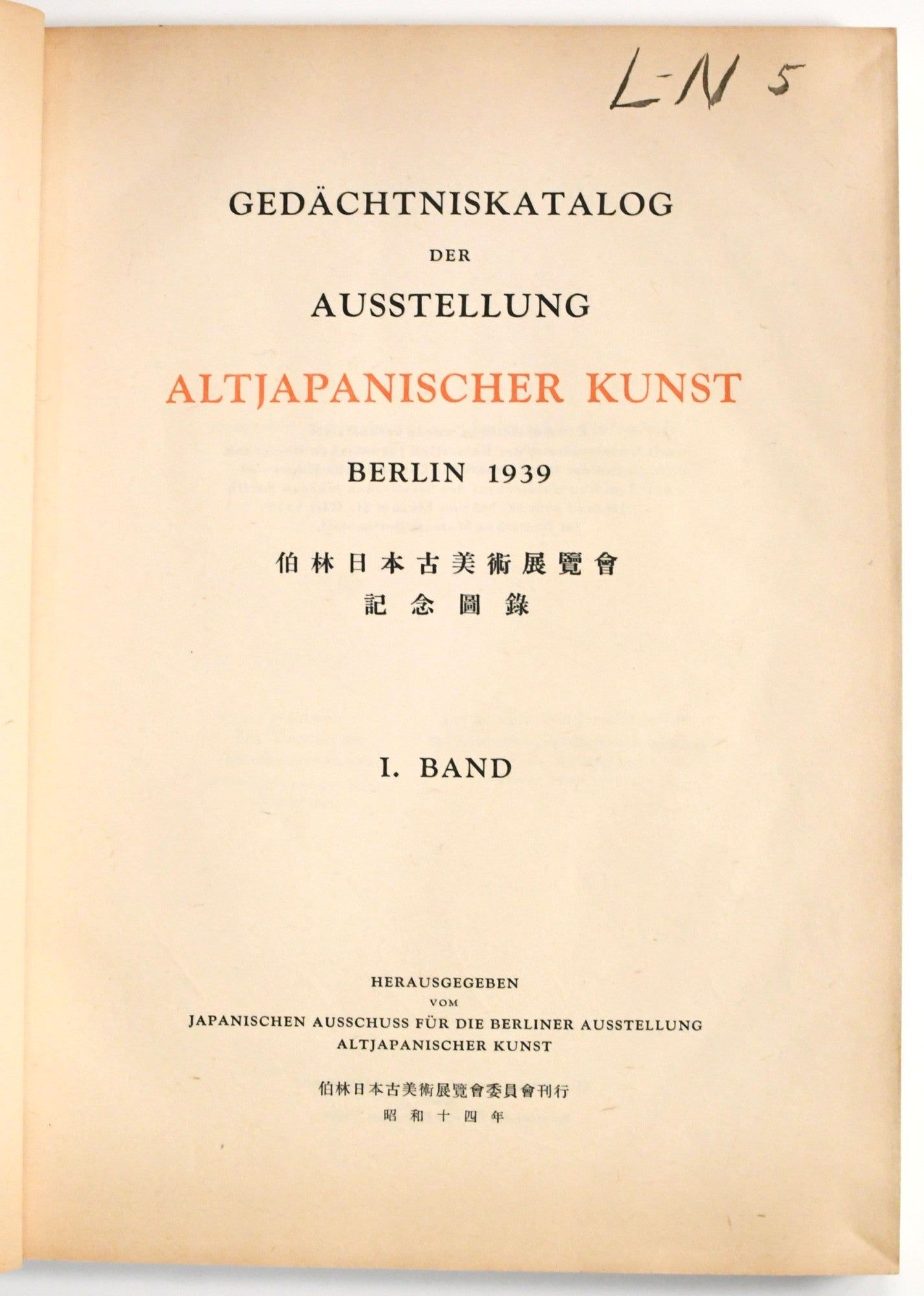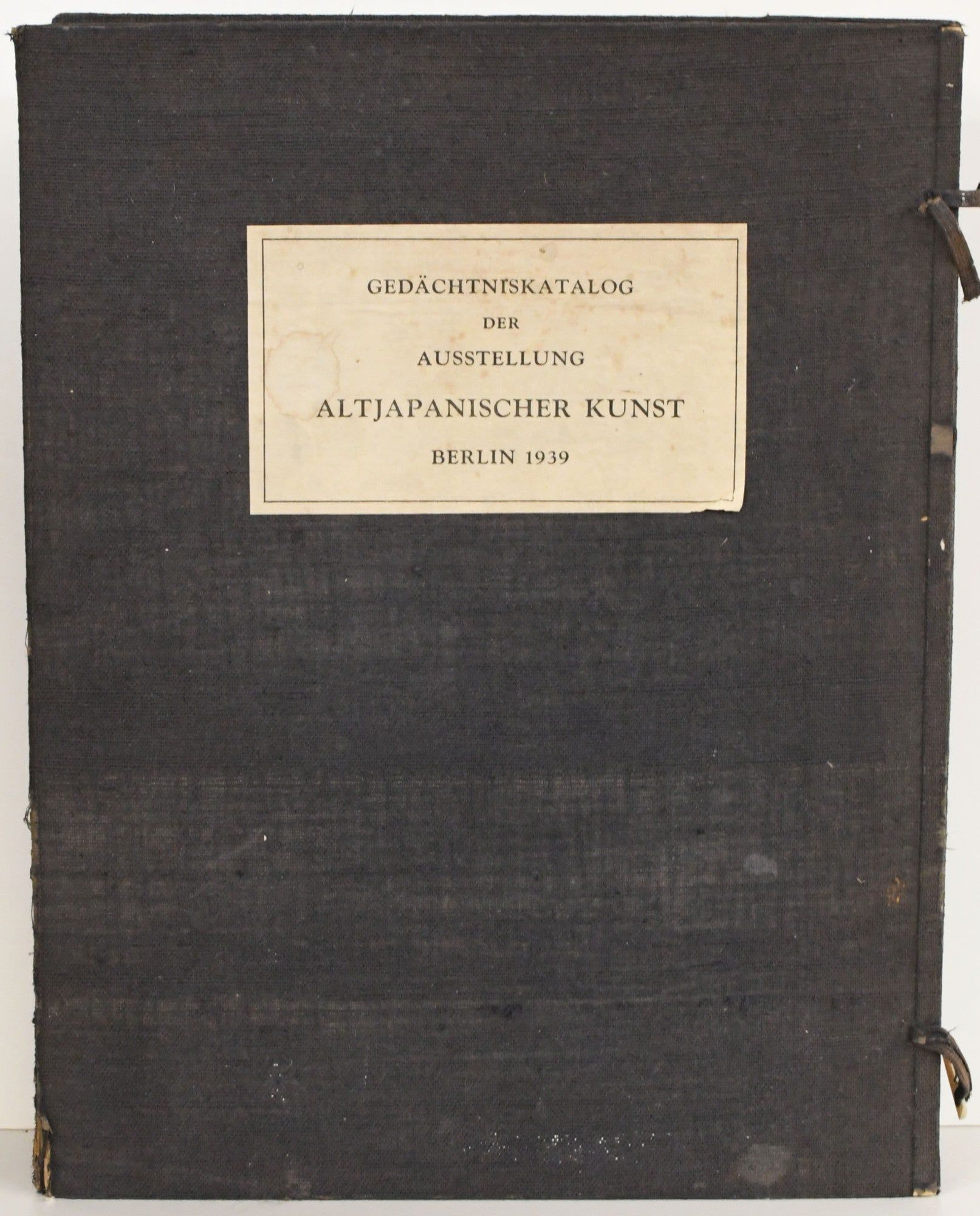 Japanischen Ausschuss fur die Berliner Ausstellung Altjapanischer Kunst, 1939. Two volumes in flexible linen boards with paper labels to the upper covers, tied in the Asian style; lxvii, 431 pages, on double leaves in the Asian Style, with black and white illustrations throughout on the rectos; the two volumes are housed in a blue linen-covered clamshell with one bone clasp (and one missing), and with a paper title label.~~Berurin Nihon kodai bijutsu tenrankai kinen zuroku [Catalogue of the Berlin Exhibition of Ancient Japanese Art]. The exhibition was held from February 28 through March 31, 1939. The text is in German.~~The catalogue is both sumptuous and uncommon.~~.