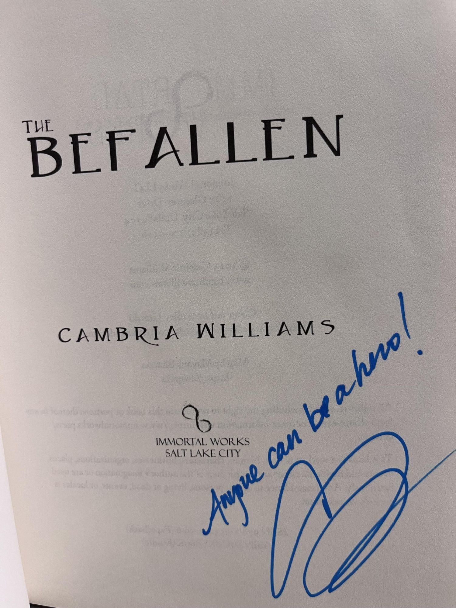 Salt Lake City, UT: Immortal Works, 2023. Paperback. New. SIGNED. 427pp. Octavo [23cm]. Pictorial wrap. "loane, sheltered, yet persistent, believes she's capable, and longs for everyone to see past her disabled leg. Selling at Market Day unaccompanied is the chance to prove herself. But when she returns home to her village, she's shattered to discover the Befallen has killed everyone. Having nothing but her faith in the goddesses of the moon, she's forced to test her strength in the outside world. Sloane realizes the kingdom is dangerous even without the Befallen: full of thieves, thugs, and, worse, heretics. Sloane is further shocked no one seems to know the entire legend, which promises a hero will defeat the Befallen. When she learns an order of knights have vowed to fulfill the legend, she's determined to help them as she alone was taught that a weapon will be gifted from the seldom-seen goddess of the Azure Moon.