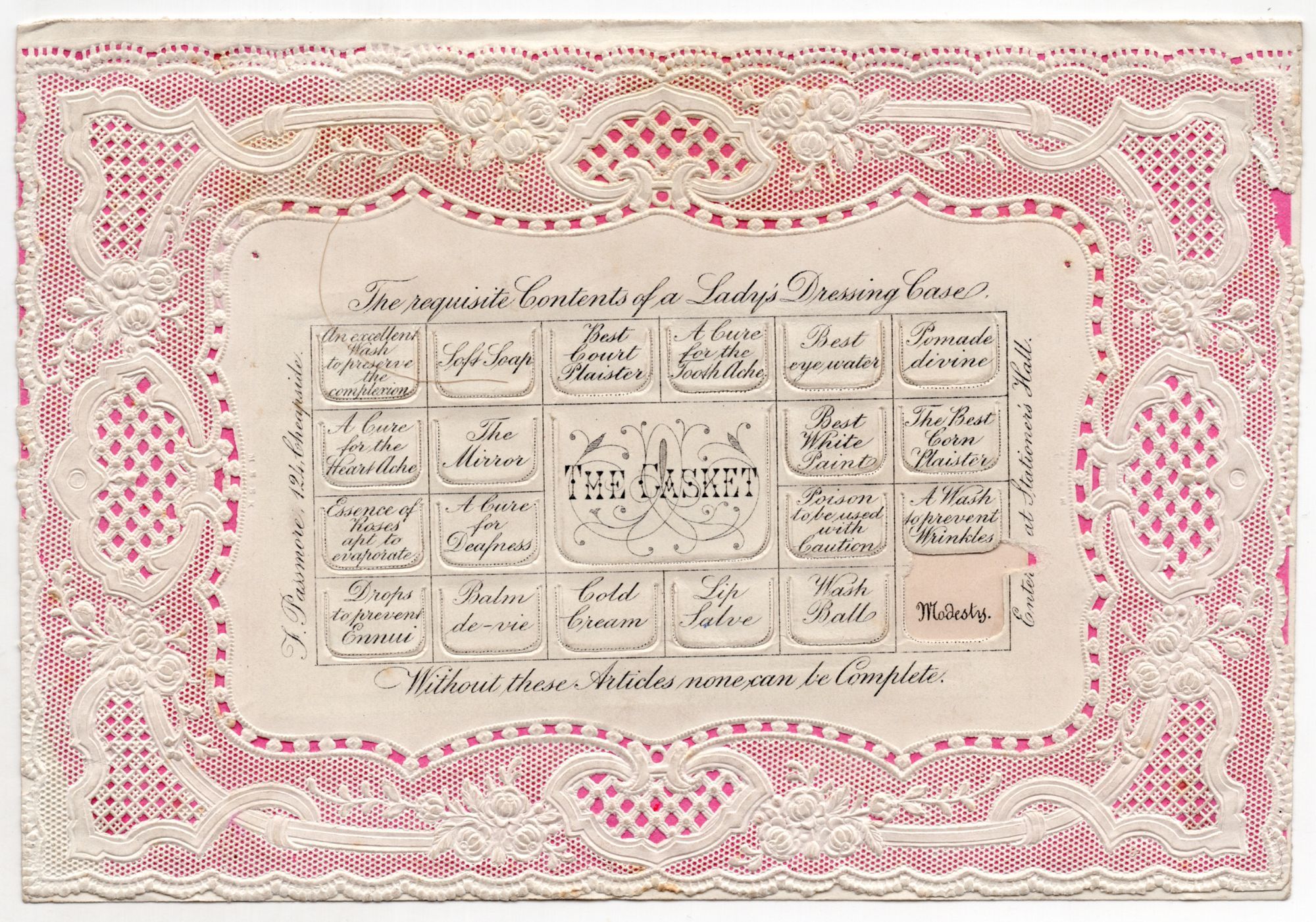 124 Cheapside, London: F. Passmore, 1870. Very good. Light spotting. One flap missing, sometime torn away and now revealing "Modesty".. A finely produced 8vo valentine made from lithographed lace paper, with hidden messages behind tiny delicate flaps. Titled "The requisite Contents of a Lady's Dressing Case", each flap has the name of a different item in a lady's toilette-- e.g. Cold Cream, Lip Salve, a Mirror, and a Wash to Prevent Wrinkles. Also has some comical items, such as "A Cure for the Heart Ache" and "Poison to be used with Caution" (The later lifts up to reveal "Love", the former lifts up to reveal "Matrimony"). Some of the other hidden messages include "Religion", "Attention", "Reflection", "Sensibility", "Purity", and "Truth". Note the implied gender roles at play here. In total there are twenty hidden messages, with one larger hidden message under a flap reading "The Casket" which lifts to reveal the largest message, "VIRTUE". Bifolium (4.75" by 7"), with pink decorated paper underneath lace paper to give color. Inside blank.