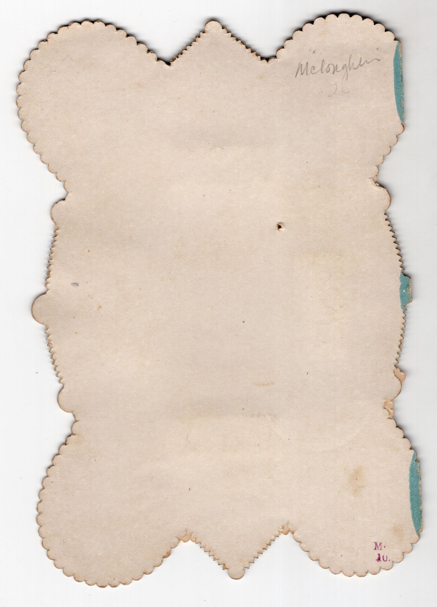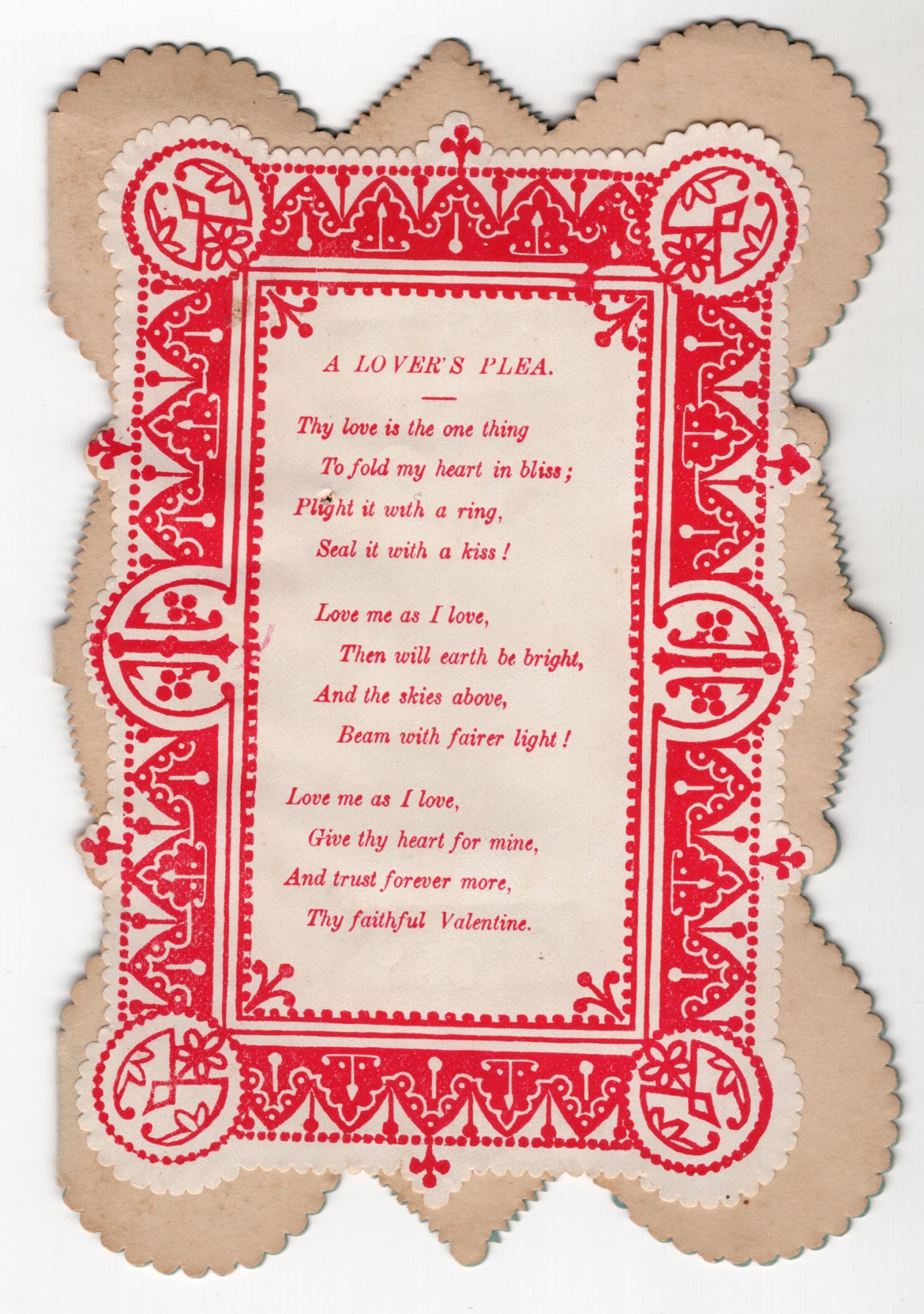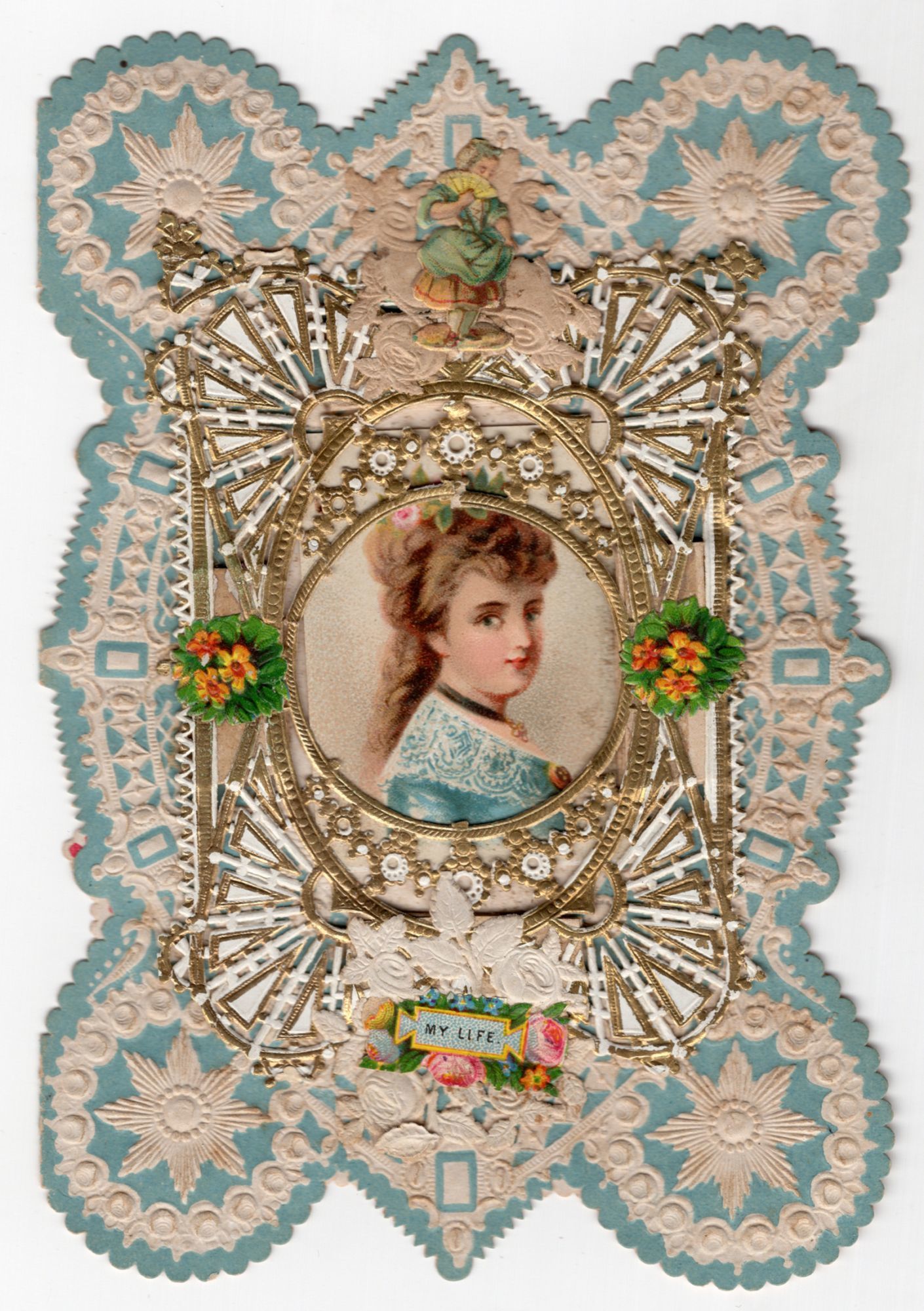 London: (McLoughlin?), 1860. Very good. Toned with minor nicks to lace paper, light dust soiling.. A flirtatious 12mo valentine (possibly by McLoughlin?) made with lace paper bifolium (5.5" by 3.5") with a printed poem inside titled "A Lover's Plea": "Thy love is the one thing To fold my heart in bliss; Plight it with a ring, seal it with a kiss..." On the upper leaf is a chromolithographed portrait of a young lady in blue dress, framed by a gilt lace paper border and secured to the valentine with embossed Victorian scrap. Includes folded paper tabs to raise the gilt lace paper frame above the valentine. Bifolium (5.5" by 3.75"). Appears to be American made.