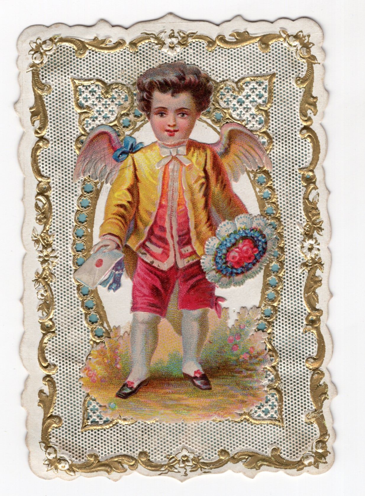London, 1850. Very good. Minor spotting. Some damage to blue paper on verso. Neck of cupid delicate/creased.. A charming 12mo valentine made from gilt lace paper, blue decorated paper peeking out from underneath, and an embossed chromolithographed scrap depicting a winged cupid in 18th century garb holding out a love letter and bouquet to the viewer. Includes a hidden chromolithographed birthday message titled "On a Birthday", which is revealed when the scrap is lifted from the lace paper: "This tributary verse, Warm with such love as ne'er shall find an end..." Measures approx. 4" by 2.75