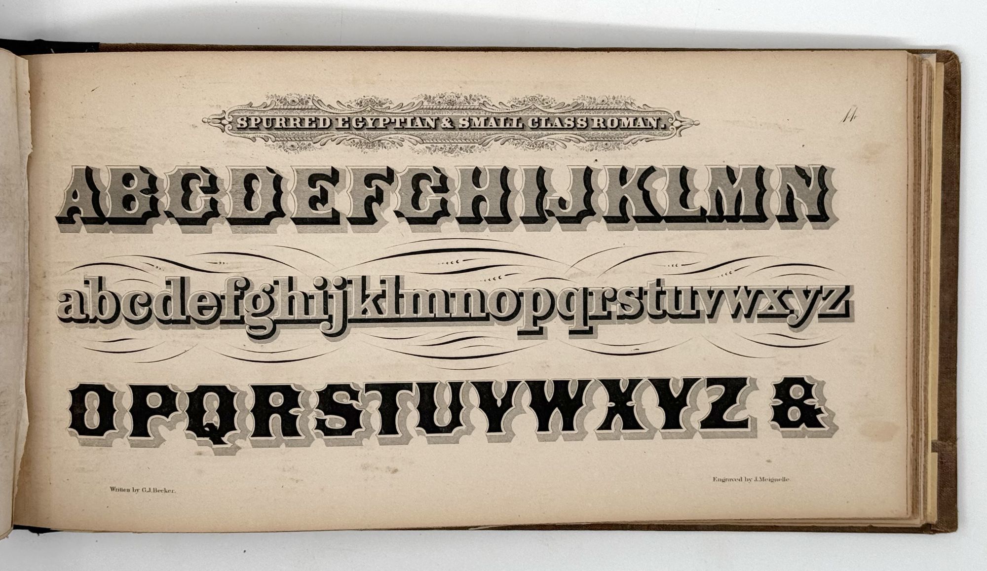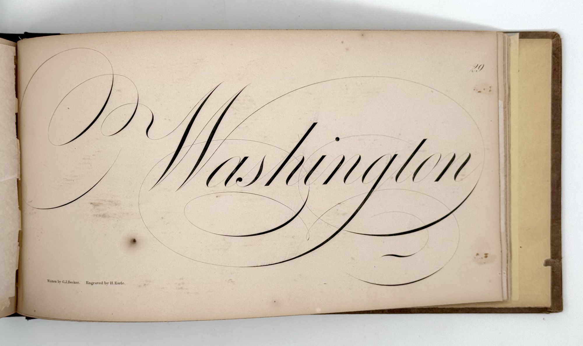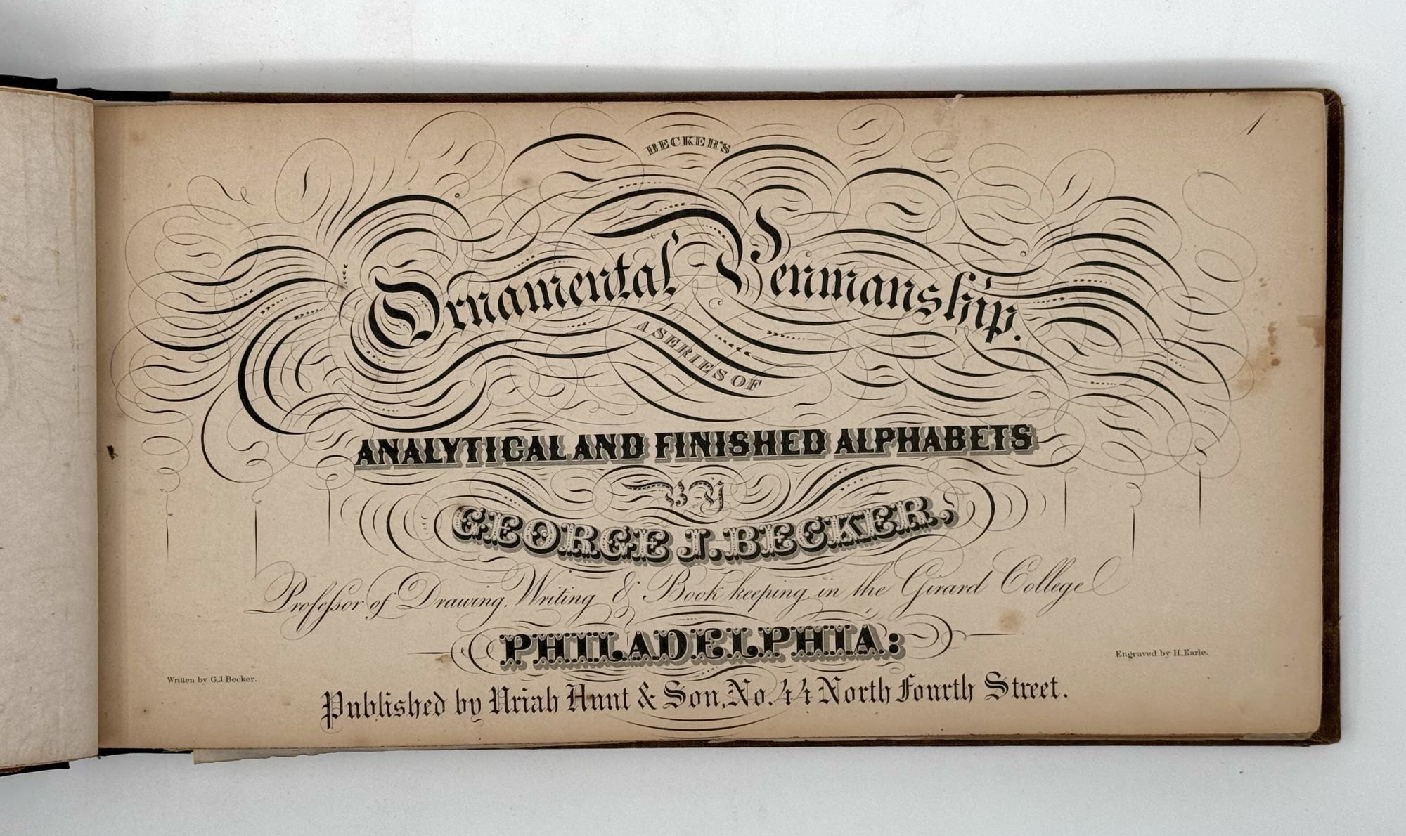 Philadelphia: Uriah Hunt & Son, 1855. First edition. 33 engraved plates, including the illustrated title. 1 vols. Oblong small 4to. Publisher's cloth. Rebacked, cloth a bit blistered. Minor glue staining from the tissue guards, minor toning. Very good. First edition. 33 engraved plates, including the illustrated title. 1 vols. Oblong small 4to. The author was professor of drawing, writing and book keeping at Girard College. His work deals with Roman print, Gothic Print, numerical figures and writing. "ORNAMENTAL PENMANSHIP, literally considered as such, has of late been brought to a higher state of perfection and finish than ever attained before. The Engraver, Lithographer, Designer, Letter Carver, Sign Writer, Stone Cutter, Punch Cutter, and Type Founder, have manifested a spirit of emulation to excel in their respective branches of business; and it is in nowise unreasonable to suppose that a work of this kind, which exhibits with mathematical precision the shape and proportion of every variety of letters, will be an acceptable addition to their previous acquaintance with the subject, and materially assist them in their several vocations" (Preface).