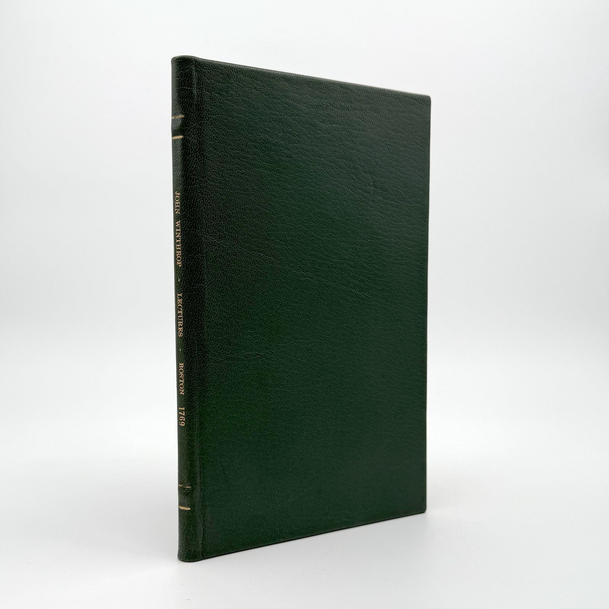 Boston: Edes & Gill, 1769. First edition. 47, [1, blank] pp. Half-title. 8vo. Modern green morocco. Top of half title clipped without loss to text, minor toning and staining. First edition. 47, [1, blank] pp. Half-title. 8vo. An early work of American astronomy, being results and analysis of John Winthrop's journey to Newfoundland and observations on the transit of Venus. The Transit of Venus in 1761 and 1769, not visible through much of Europe, afforded the American colonies their first real opportunity for scientific contribution. The combined efforts of David West, David Rittenhouse and John Winthrop marked the arrival of American science on the world stage. Winthrop's expedition was funded by the legislature of Massachusetts Bay, in what must be among the first instances of public support of science in North America.