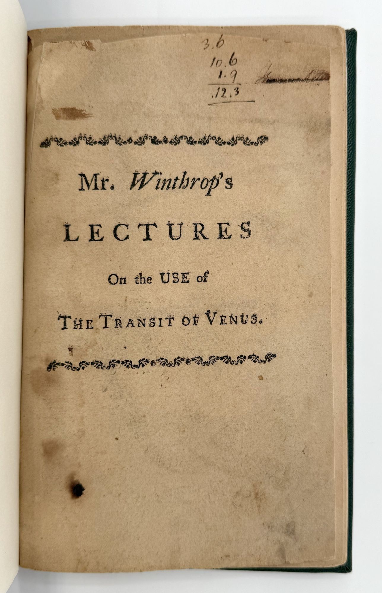 "Perhaps [Winthrop's] most important astronomical work was concerned with the two transits of Venus in 1761 and 1769, which engaged astronomers all over the world. For the 1761 transit Winthrop organized an expedition from Harvard to St. John's Newfoundland, which provided material for one of his most important papers. In 1769 he published the results of further work in Two Lectures ..." (Dictionary of Scientific Biography).