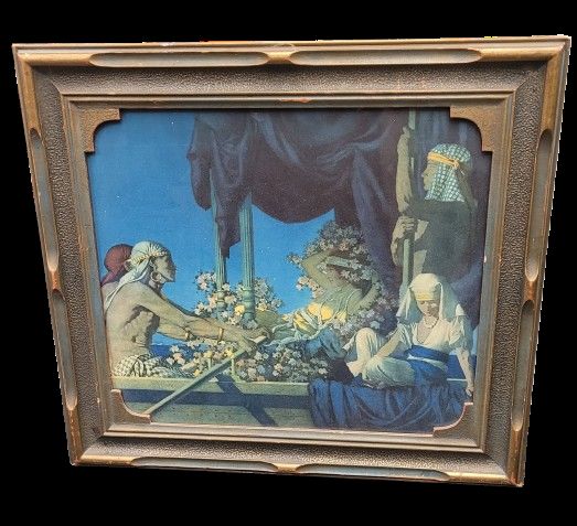 Cleveland, 1917. Print. Maxfield Parrish. Original Medium Size Maxfield Parrish lithograph print. 15 x 17 inches. [19.5 x 17 inches in frame] May require extra shipping due to size. In 1917, Maxfield Parrish created three paintings for C.A. Crane Candy Co. Prints were created by House of Art NY for C.A. Crane Candy Co. Stores in Cleveland Ohio & NY City. The original prints came in three sizes and this is the medium size that was produced. "Cleopatra" is the rarest of the three paintings made for C. A. Crane Candy Co. to find.