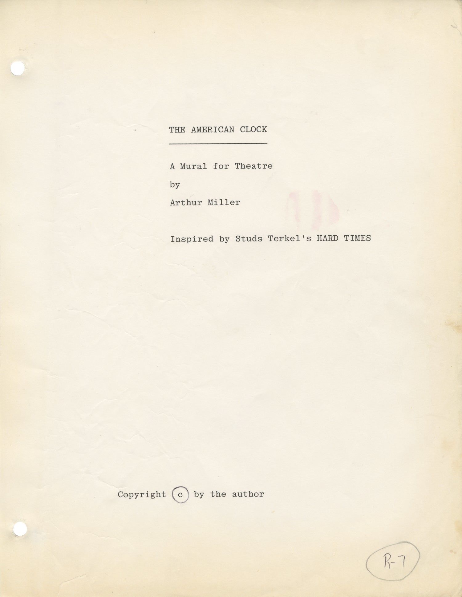 Blue titled Studio Duplicating Service wrappers, with credit for playwright Arthur Miller on the front wrapper. Title page present, with credits for playwright Miller and novelist Terkel. 111 leaves, with last page of text numbered 102. Mimeograph duplication, rectos only, with undated xerographically duplicated revision pages throughout. Pages Near Fine, wrapper Very Good plus, bound with two gold screw brads.
