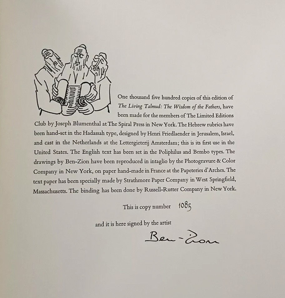 New York: Limited Editions Club, 1960. Hardcover. Fine in a close to Fine slipcase. Ben-Zion. Small folio (9-1/4" x 12-1/4") bound in half natural-grain goatskin vellum and black cloth stamped in genuine gold, top edge gilt with pure gold leaf; 226 pages. Translated, edited, and with an introduction by Judah Goldin. Designed by Joseph Blumenthal and printed at the Spiral Press with the classical commentaries printed in both English in black ink and Hebrew in red ink. Illustrated with 12 full-page sepia drawings by Ben-Zion. Copy #1085 of 1500 copies SIGNED by the artist on the colophon page.