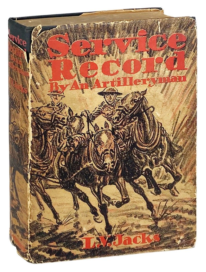 New York: Charles Scribner's Sons, 1928. Very Good/Very Good -. New York: Charles Scribner's Sons, 1928. First Edition. Octavo. 303 pp. Illustrated dust jacket. Black boards stamped in red. Dust jacket heavily chipped along edges and folds with loss to top of spine and top edge of rear panel. Boards shelfworn and bumped with general scuffing and tear to fore-edge of rear board. Binding sound. Ownership inscription and bookseller ticket to rear pastedown; interior else unmarked. A Good to Very Good copy. Uncommon memoir of the WWI experiences of a soldier in the 119th Field Artillery.